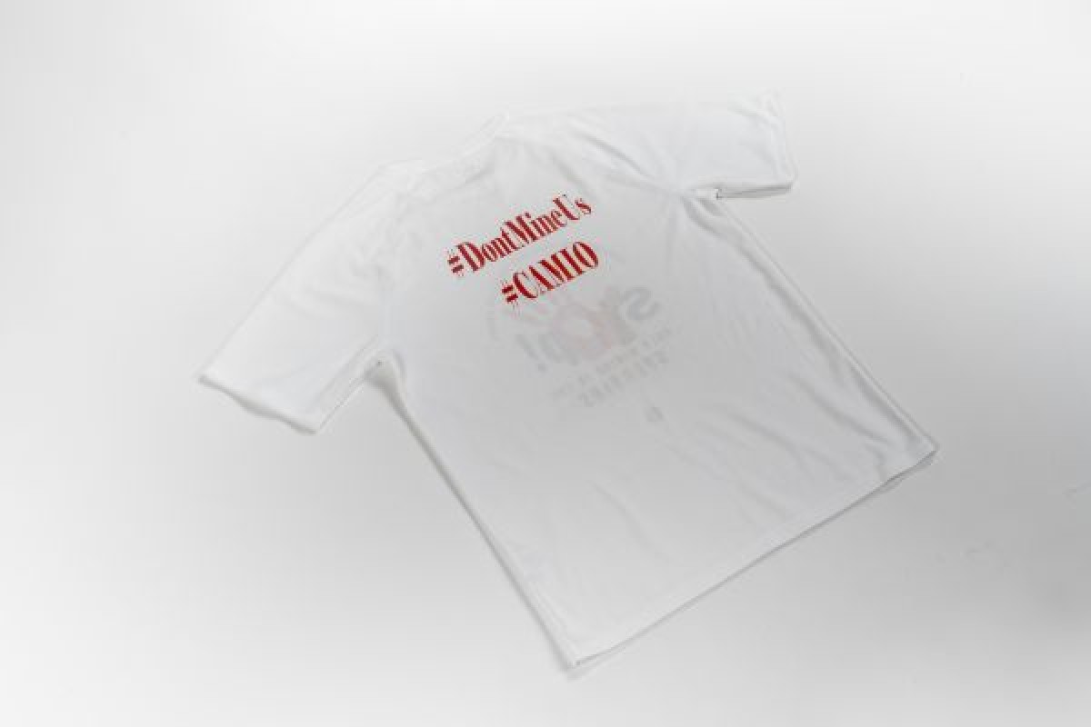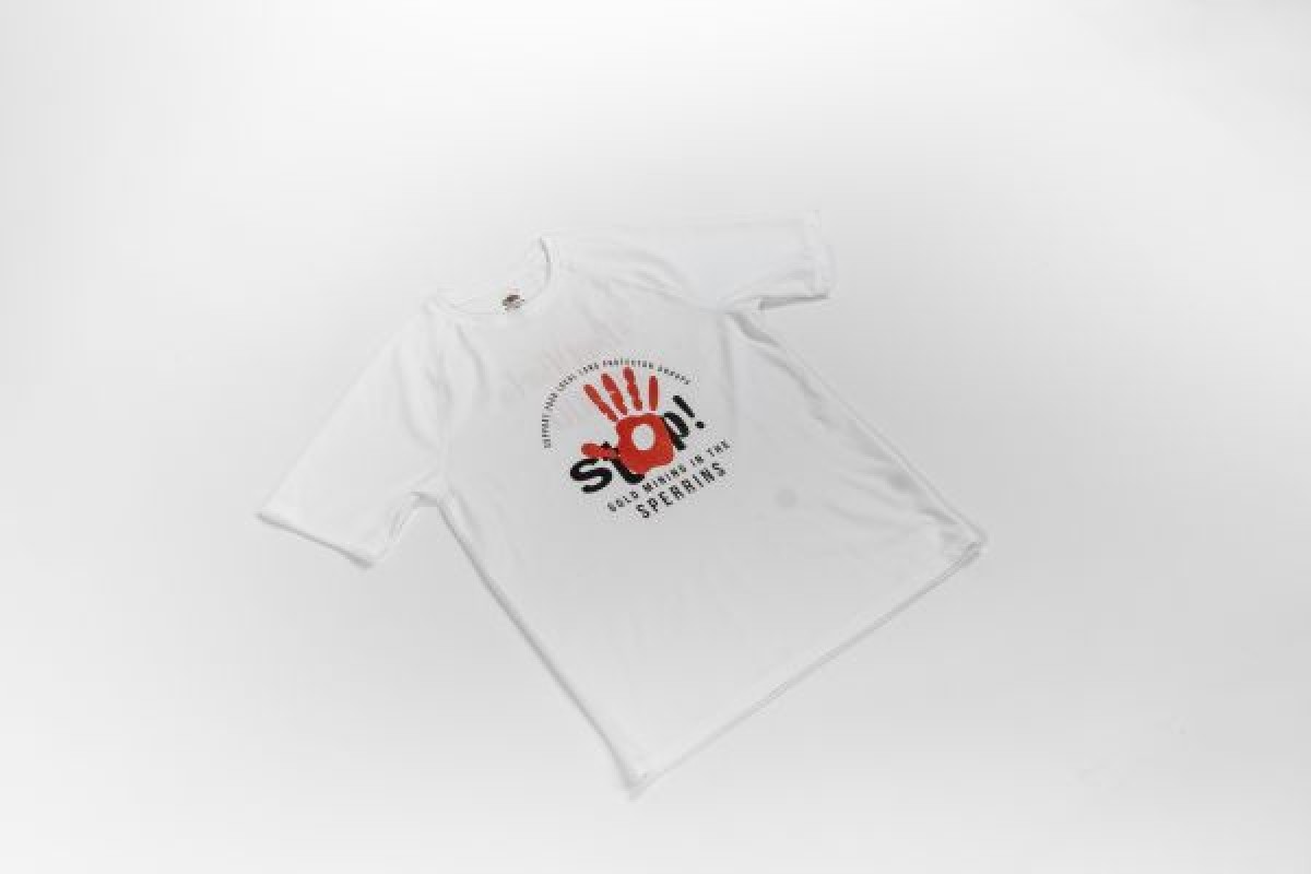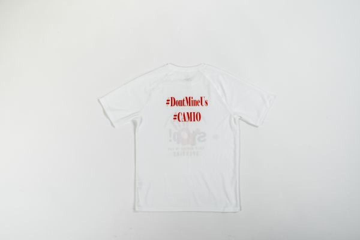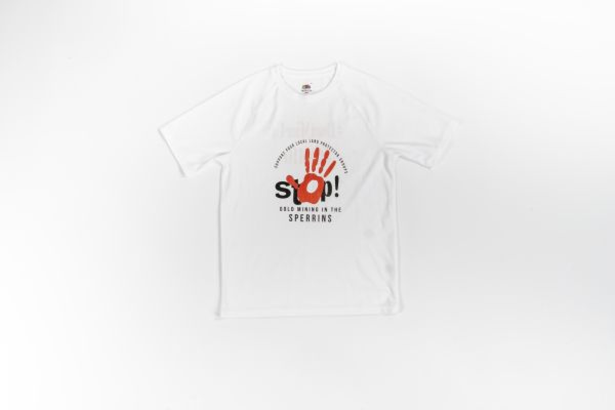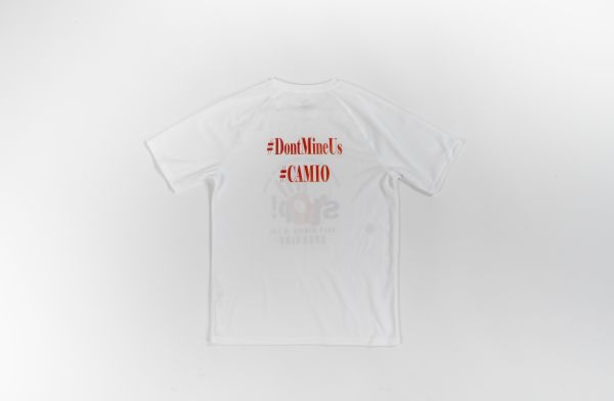 White t-shirt with red and black logo of a handprint over text that reads, 'Stop! Gold Mining in the Sperrins. Support your local land protector groups, and '#DontMineUS #CAMIO' on reverse. The t-shirt was produced by Cooperation Against Mining in Omagh (CAMIO), a pressure group set up by Marella Fyffe to stop mining in Omagh and the Sperrins.
