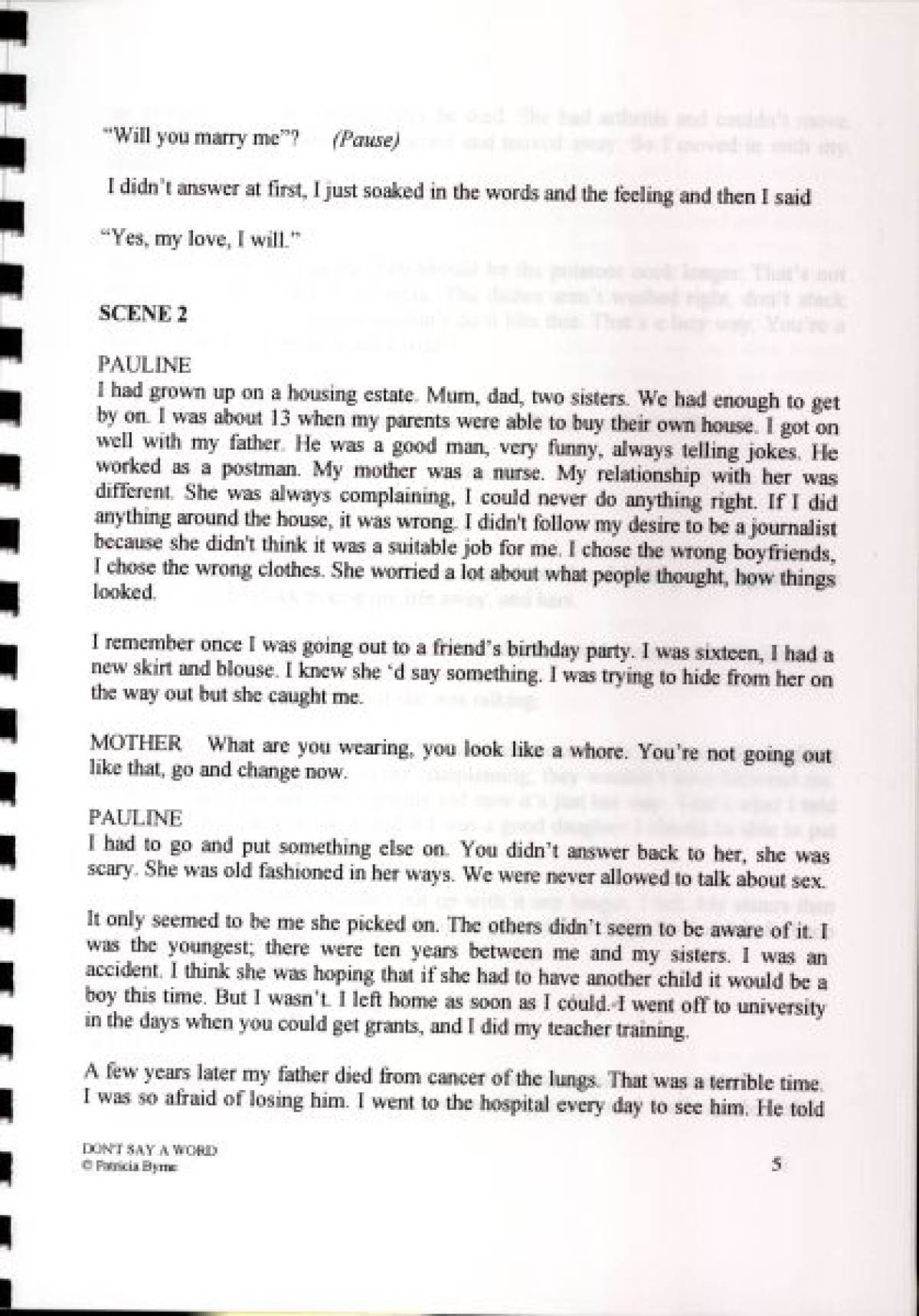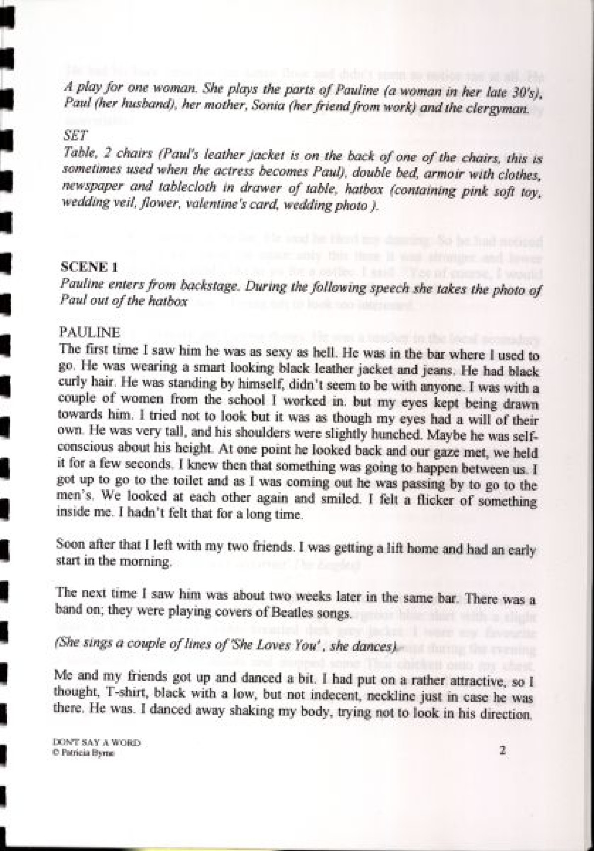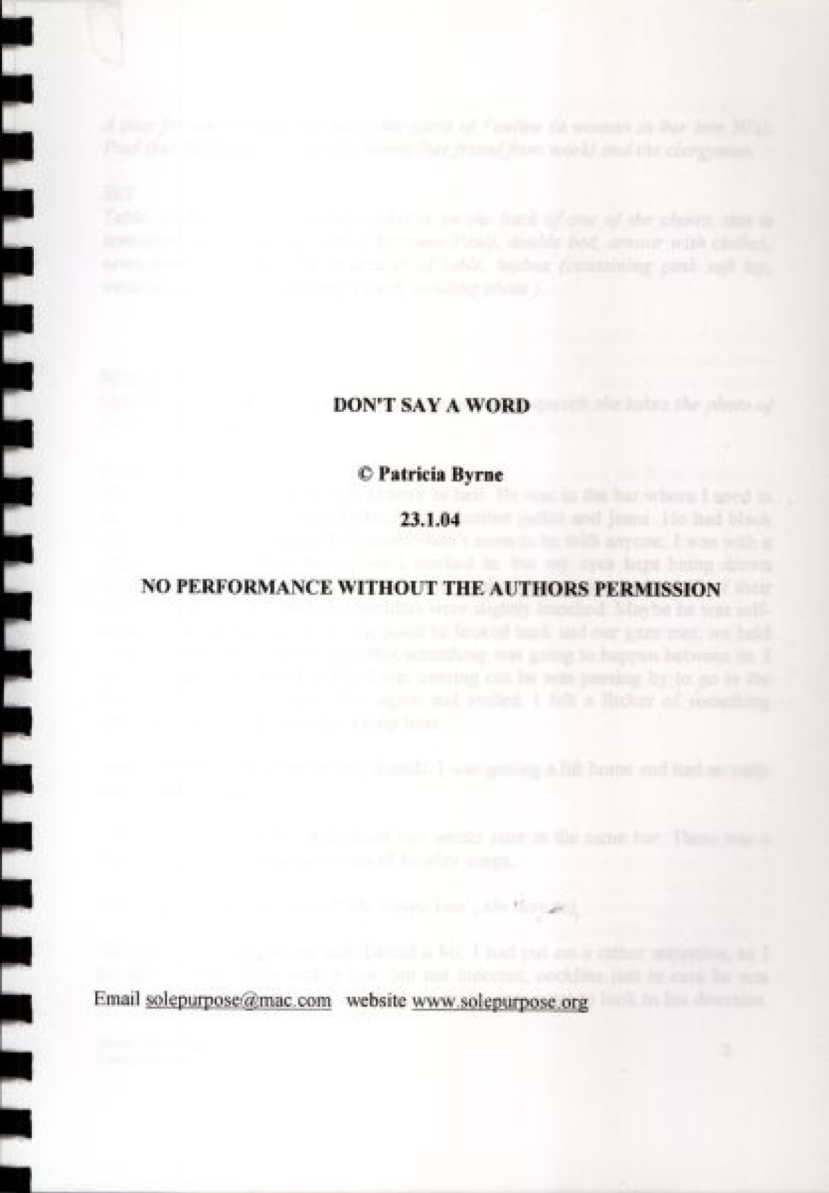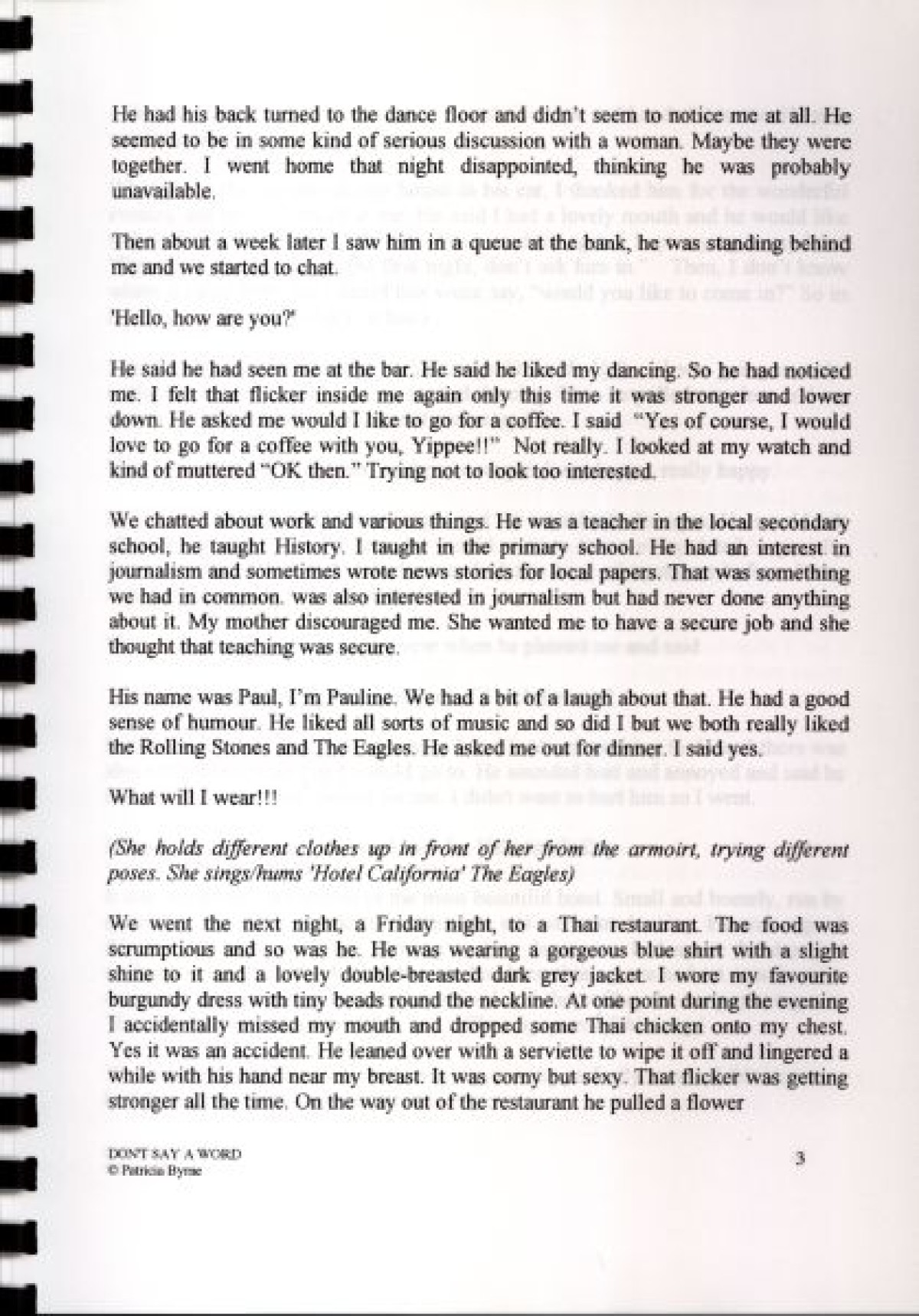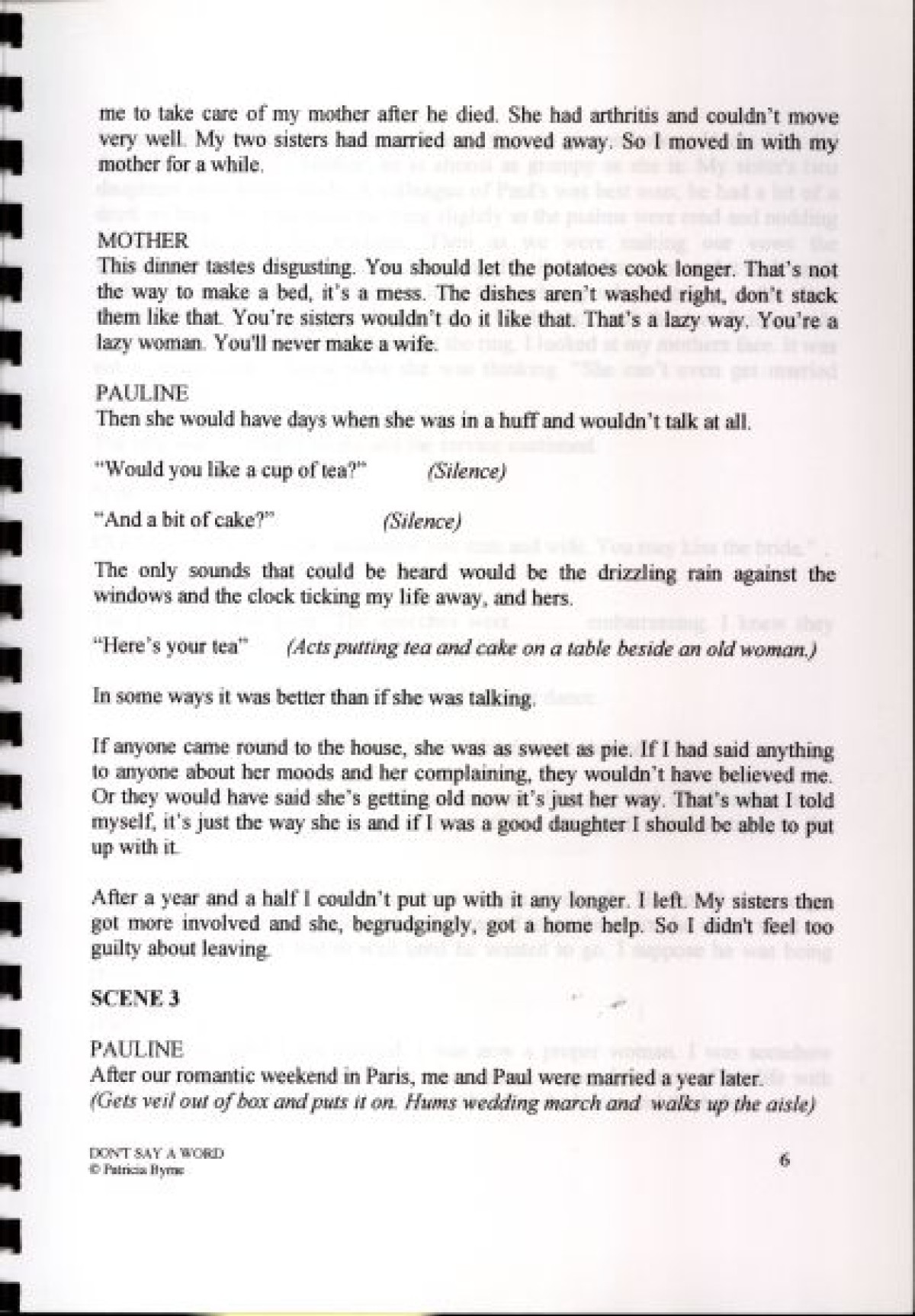Script extract from, 'Don't Say A Word,' a play about women and domestic violence, written by Patricia Byrne. Produced by