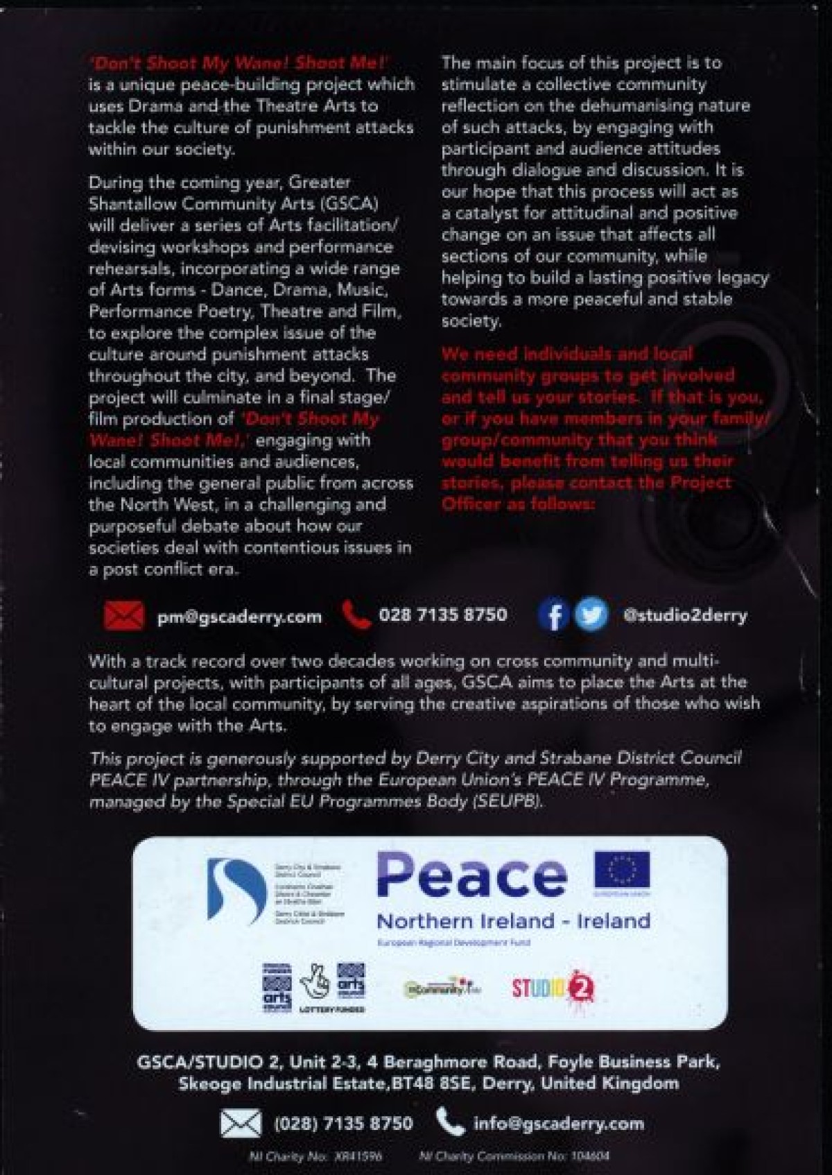 Greater Shantallow Community Arts (GSCA). Contains information about the project purpose and engagement activities, and a call for community participants to share their stories.