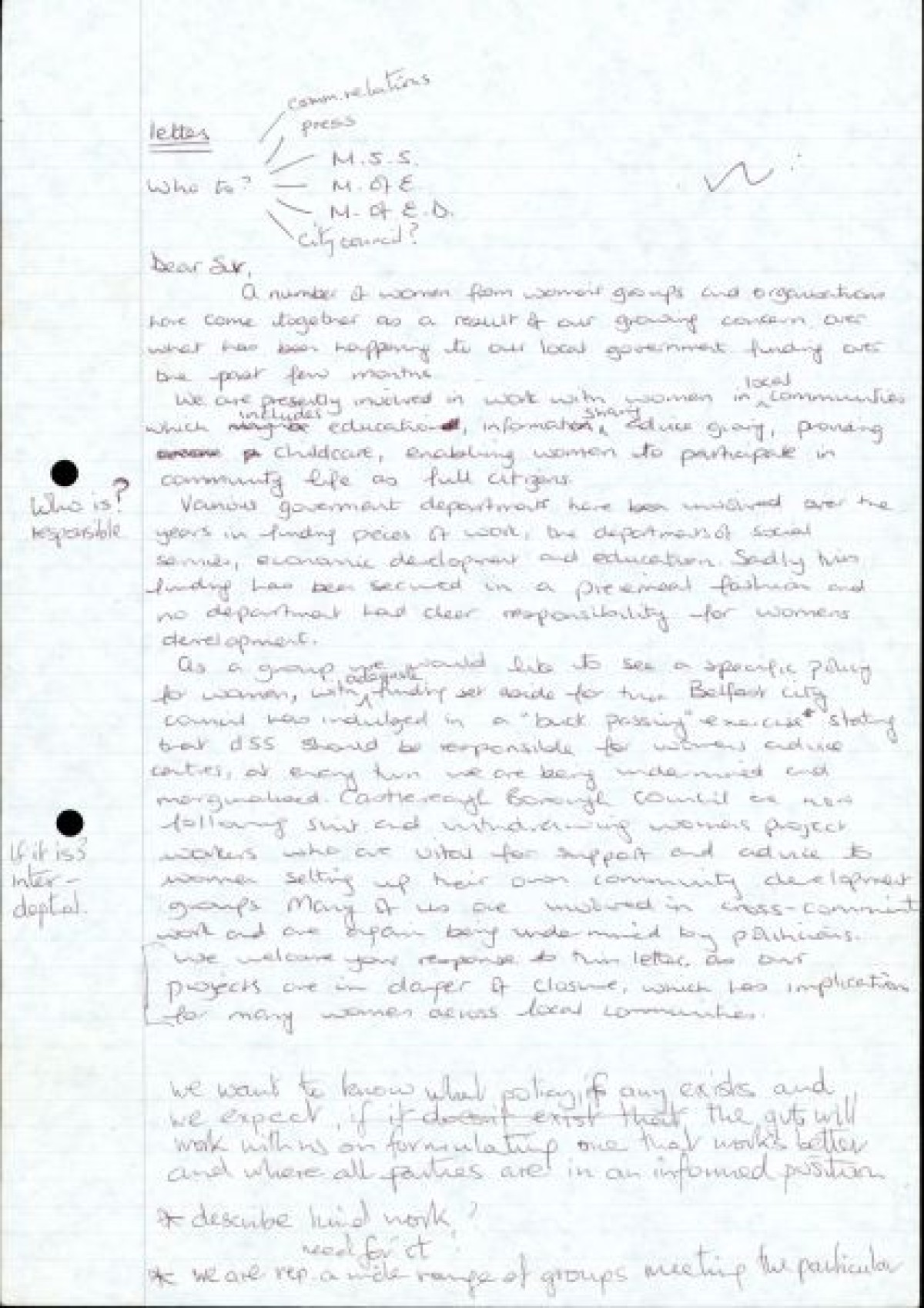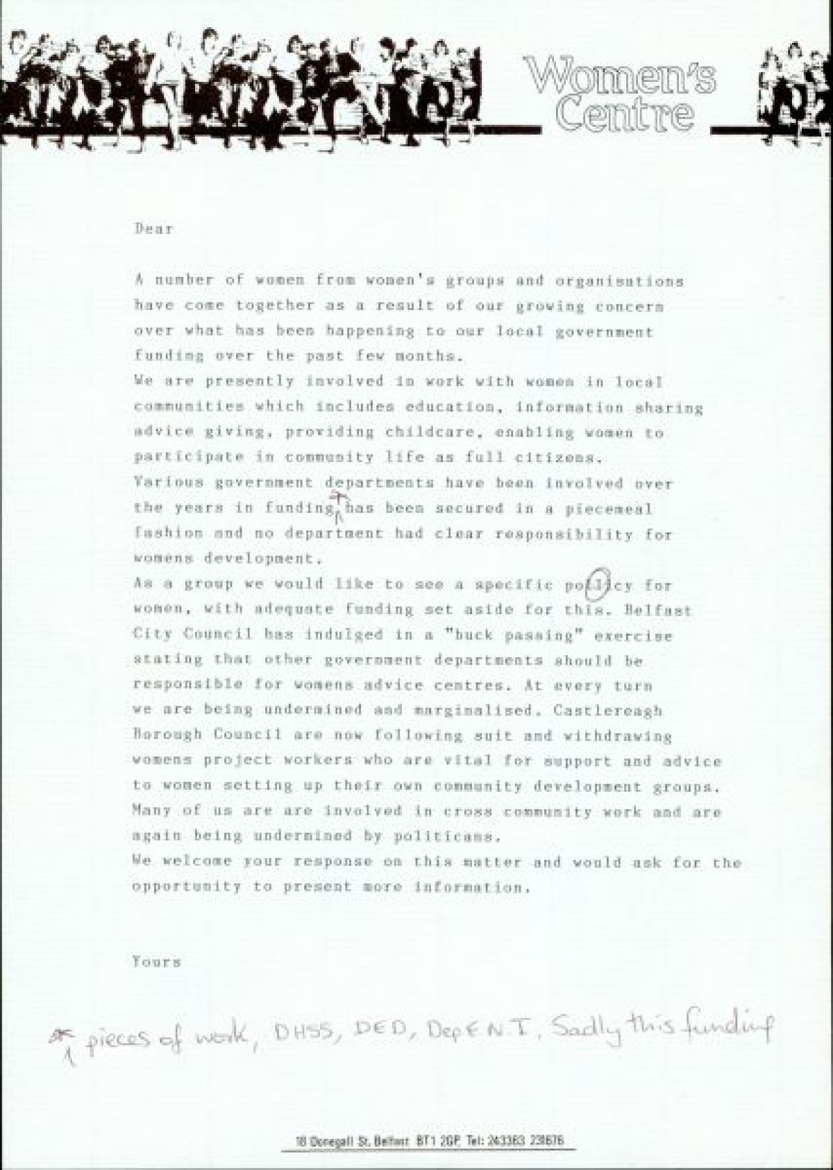 Typed and handwritten drafts of a letter composed by the Belfast Women's Centre regarding a lack of local government funding pertaining to women's development, with handwritten annotations and revisions.
