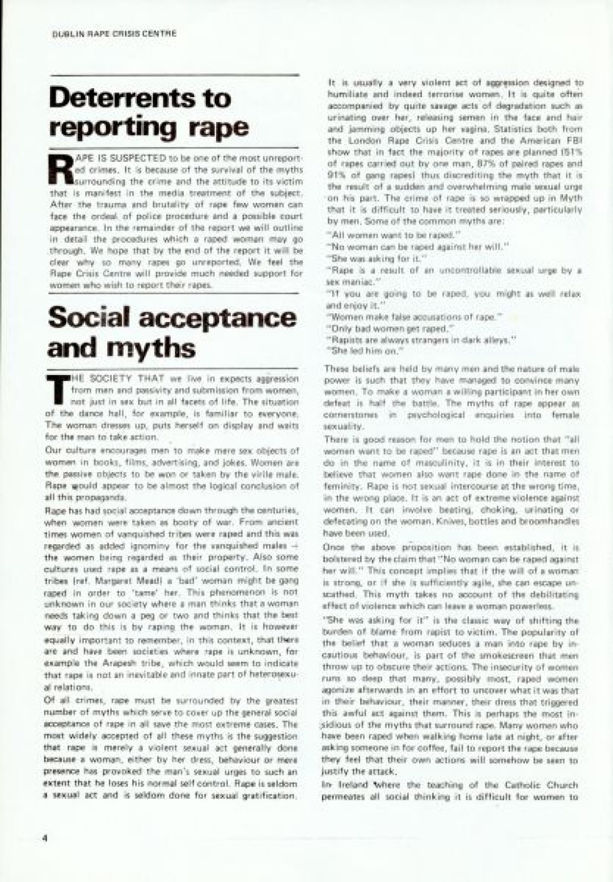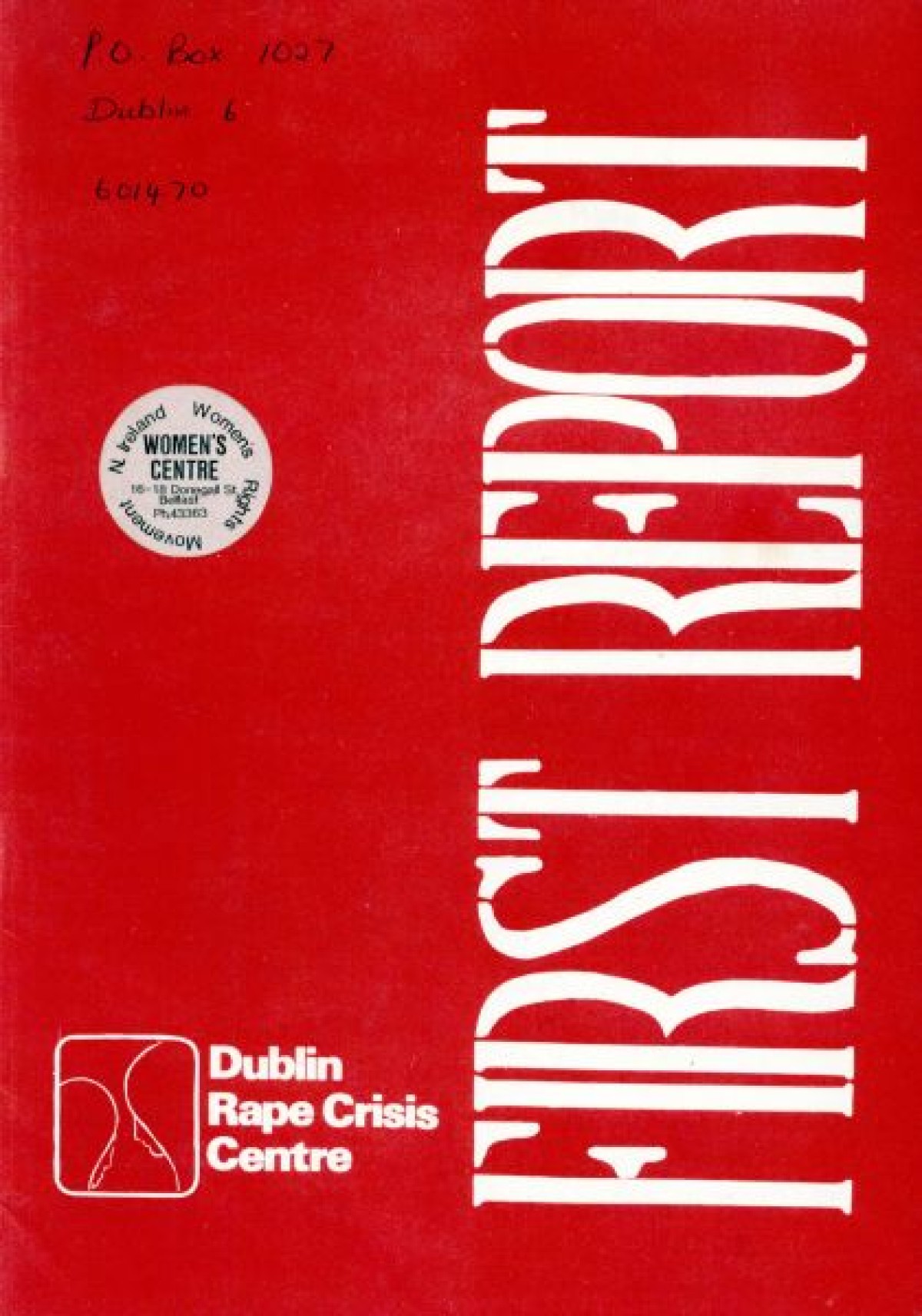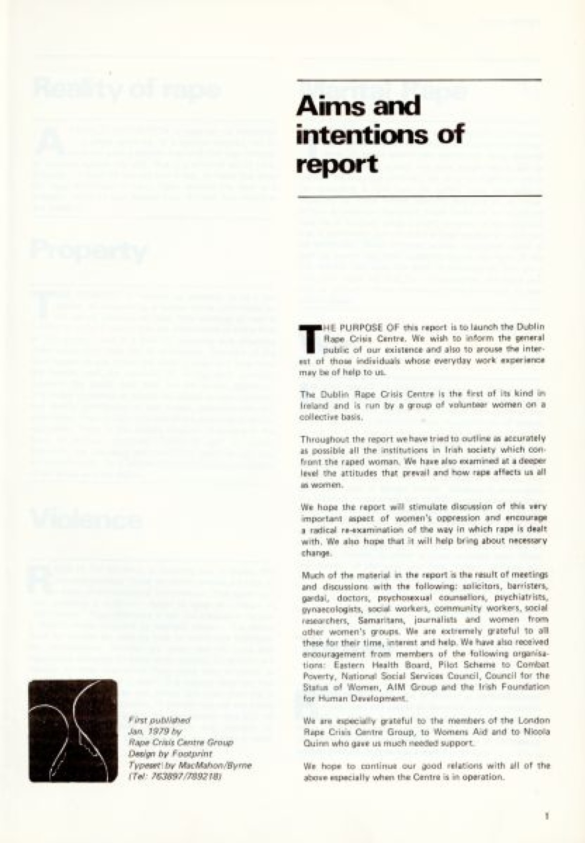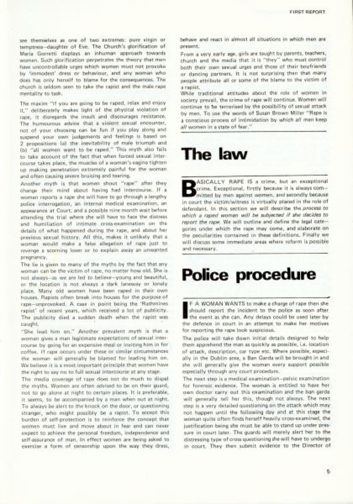 Northern Ireland Women's Rights Movement on the cover. First published in January 1979. Contents include: Aims and Intentions of the report to launch the Dublin Rape Crisis Centre; Reality of Rape; Marital Rape; Violence; Property; War; Torture; Deterrents to Reporting Rape; Social Acceptance and Myths; Laws; Police Procedure; Court Procedure; Categories and Definitions; Consent; Evidence; Law Reform; Medical; Examination Procedure; Rape Crisis Centre; and Professional Training.