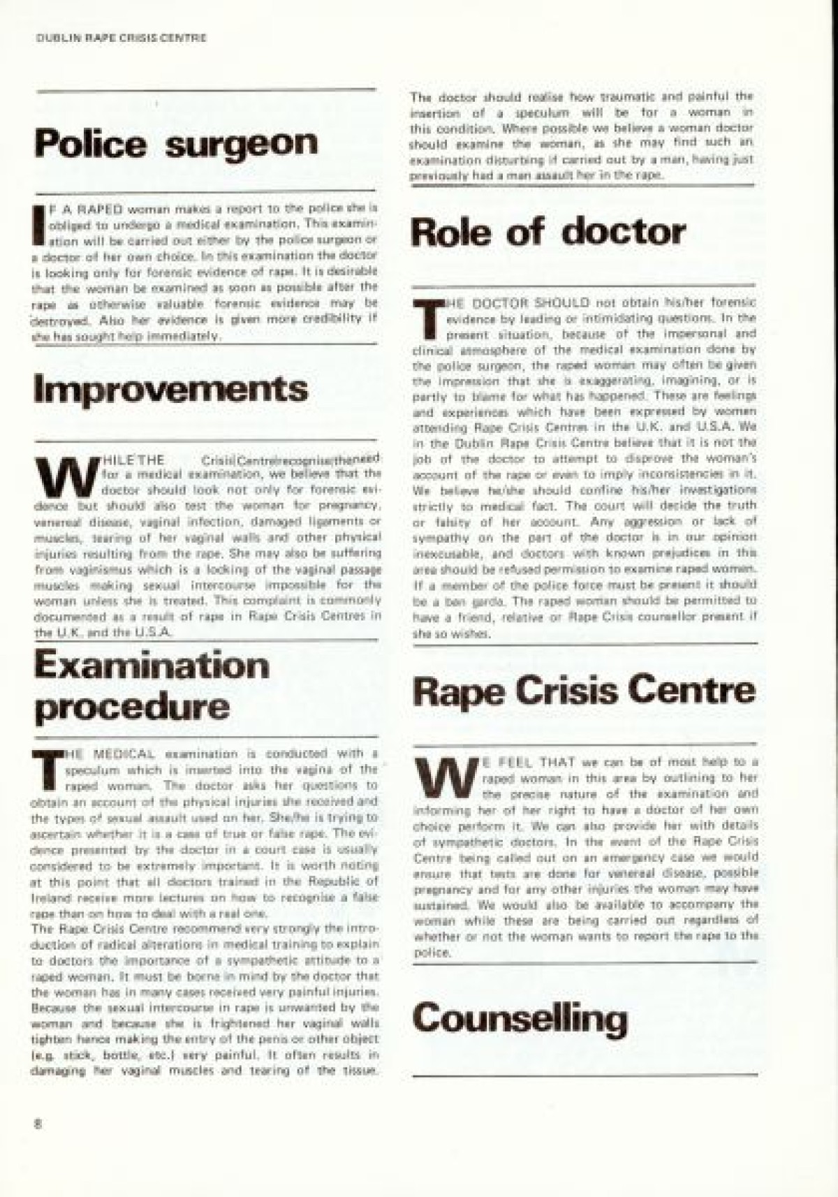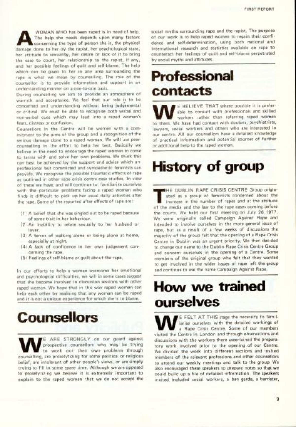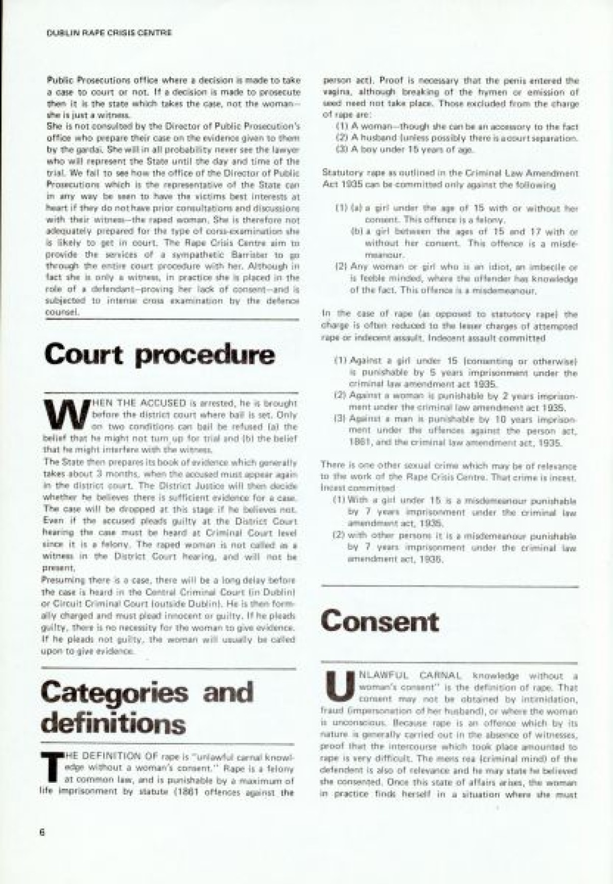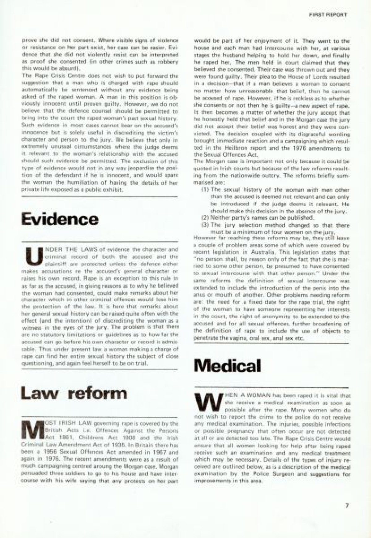 Northern Ireland Women's Rights Movement on the cover. First published in January 1979. Contents include: Aims and Intentions of the report to launch the Dublin Rape Crisis Centre; Reality of Rape; Marital Rape; Violence; Property; War; Torture; Deterrents to Reporting Rape; Social Acceptance and Myths; Laws; Police Procedure; Court Procedure; Categories and Definitions; Consent; Evidence; Law Reform; Medical; Examination Procedure; Rape Crisis Centre; and Professional Training.