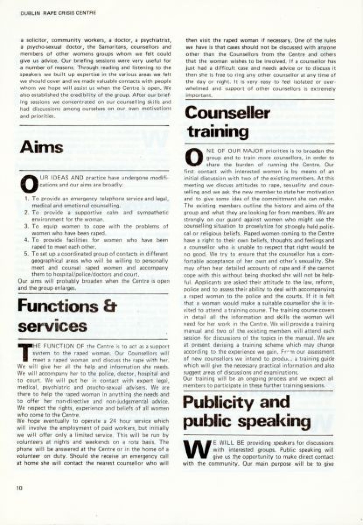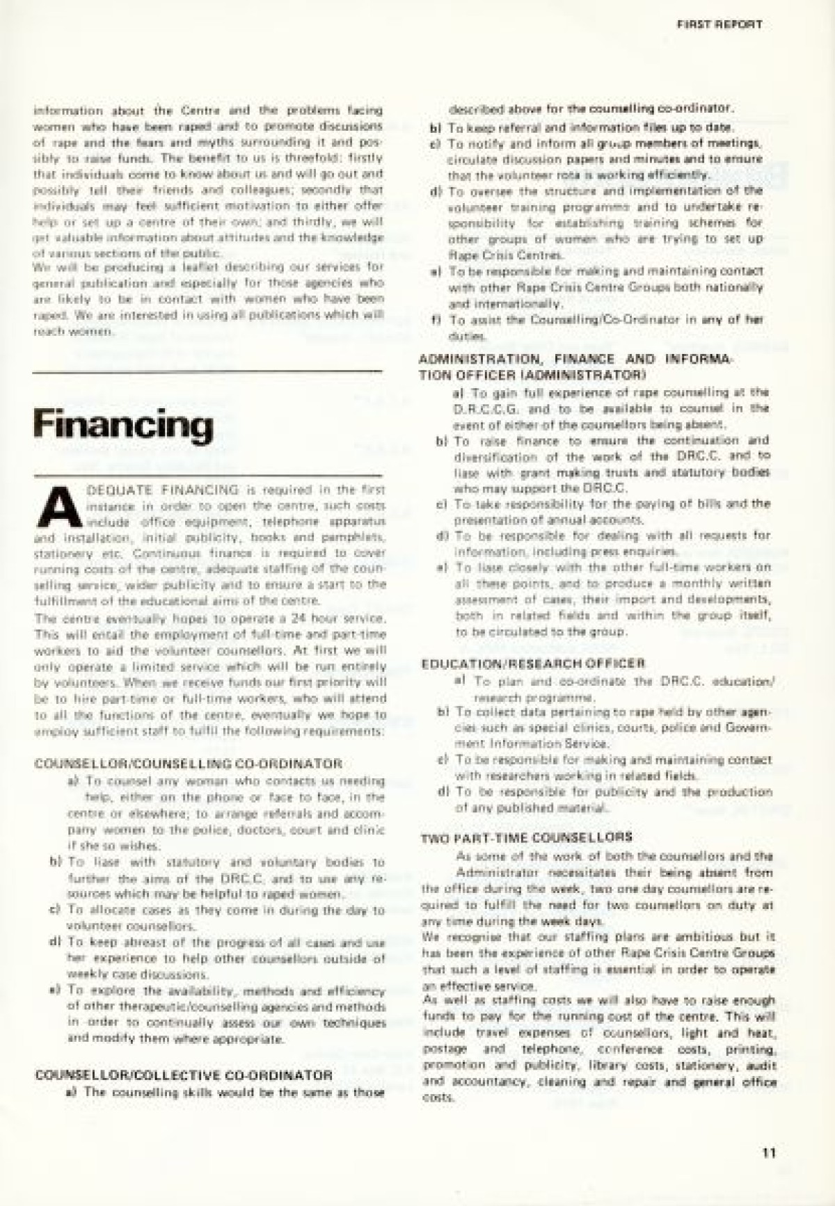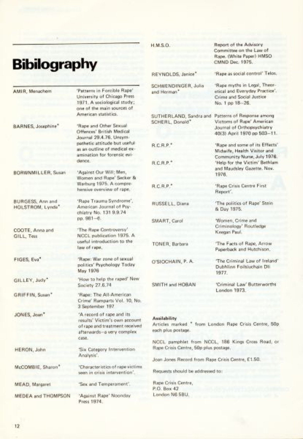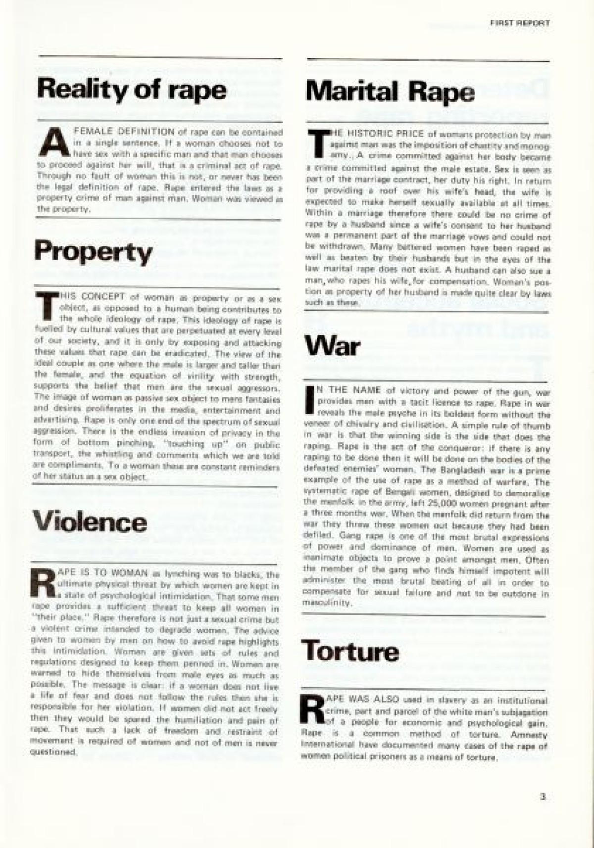 Northern Ireland Women's Rights Movement on the cover. First published in January 1979. Contents include: Aims and Intentions of the report to launch the Dublin Rape Crisis Centre; Reality of Rape; Marital Rape; Violence; Property; War; Torture; Deterrents to Reporting Rape; Social Acceptance and Myths; Laws; Police Procedure; Court Procedure; Categories and Definitions; Consent; Evidence; Law Reform; Medical; Examination Procedure; Rape Crisis Centre; and Professional Training.