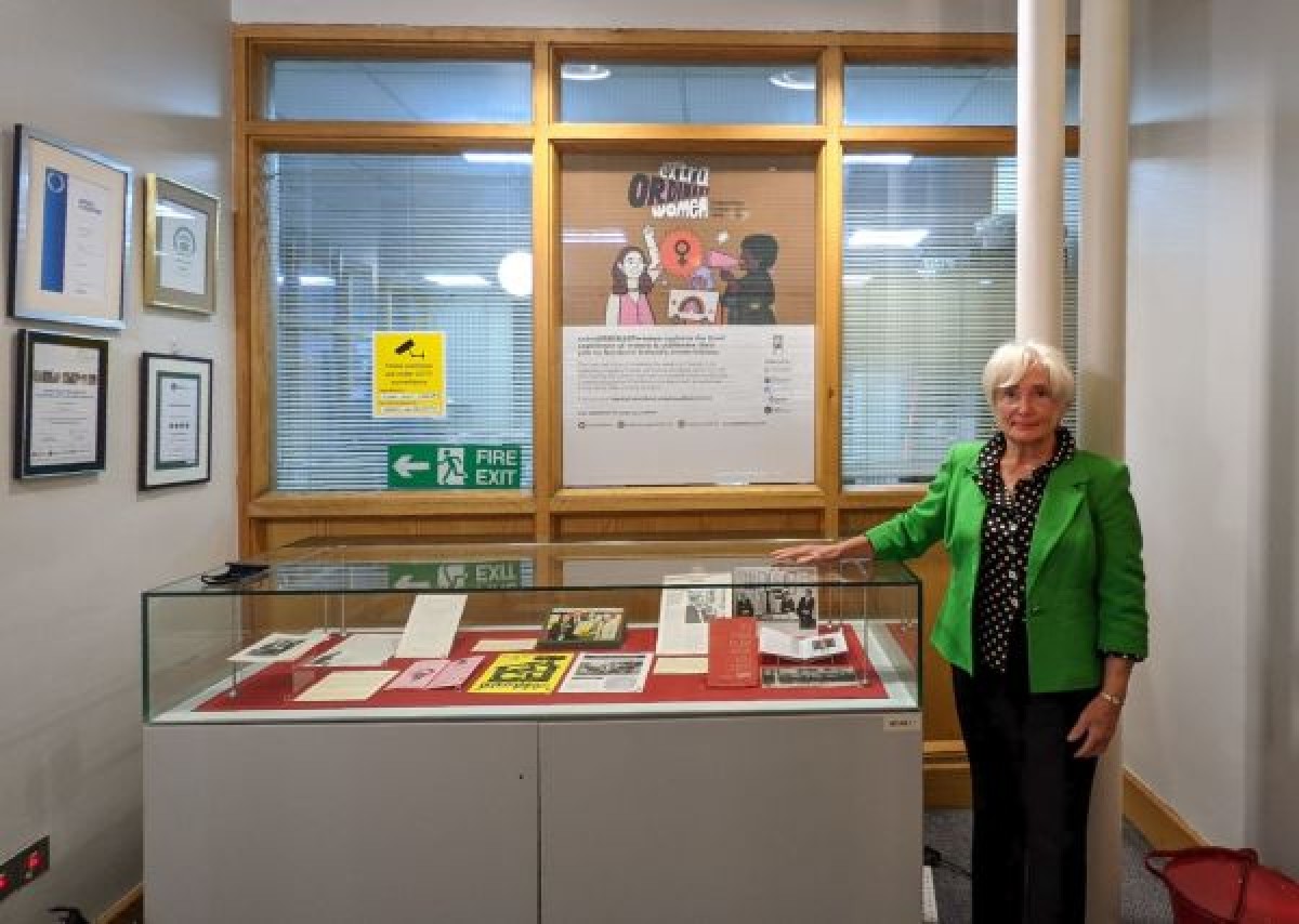 Northern Ireland Community Education Association (NICEA) which she founded in 1981. The display case also featured a selection of items from the Northern Ireland Political Collection at the Linen Hall Library, including documents donated by the Belfast Law Centre, the Vine centre, and 'Women in Law,' a project by photographer Susie Rea.