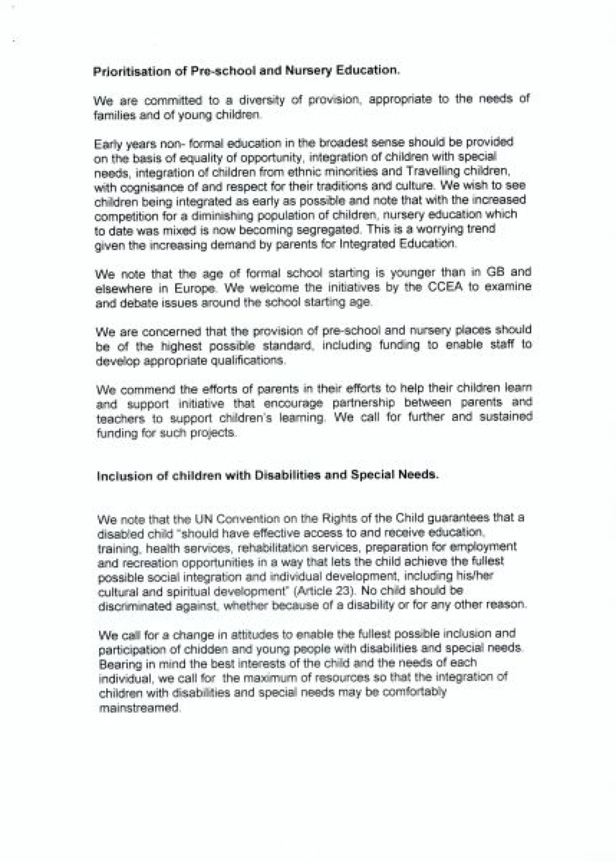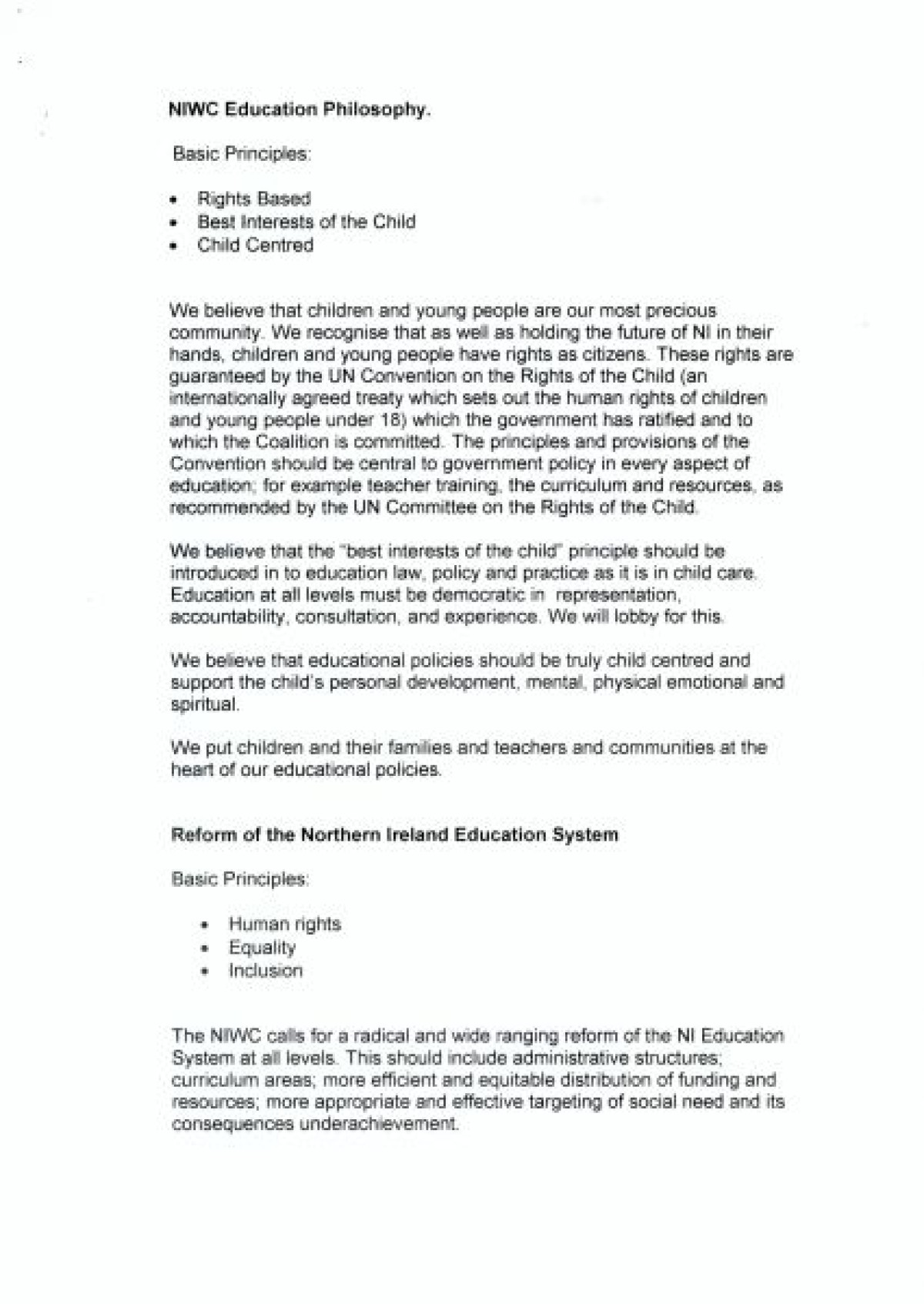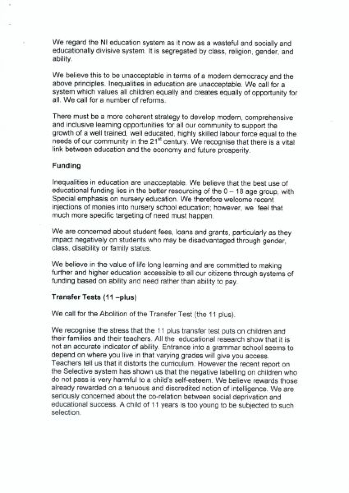 Northern Ireland Women's Coalition. Features reform proposals for the Northern Ireland education system, including a call to abolish transfer tests (11-plus), prioritisation of pre-school and nursery education, inclusion of children with disabilities and special needs, and more support for integrated education.
