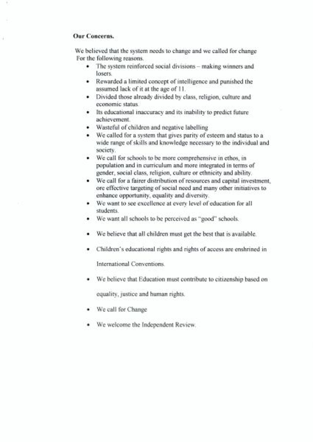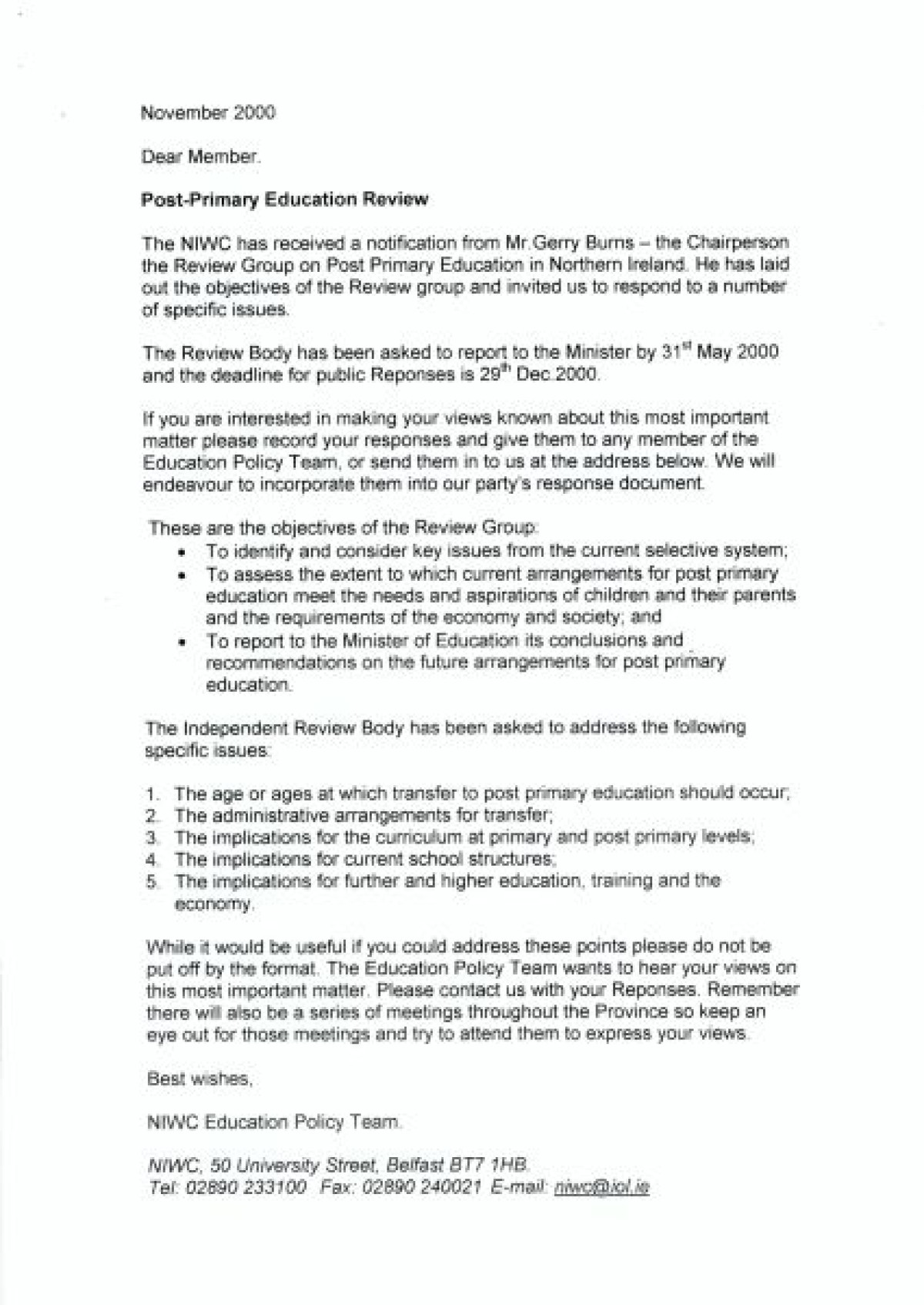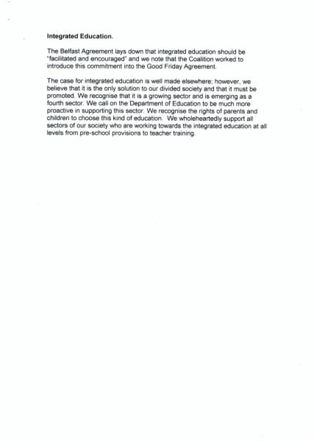 Northern Ireland Women's Coalition. Features reform proposals for the Northern Ireland education system, including a call to abolish transfer tests (11-plus), prioritisation of pre-school and nursery education, inclusion of children with disabilities and special needs, and more support for integrated education.
