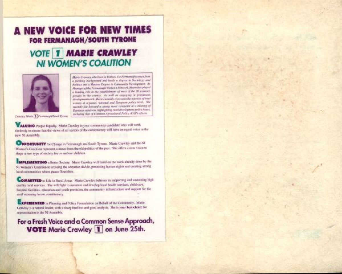 Election flyers x 2 for Marie Crawley, laminated, titled 'A New Voice for New Times for Fermanagh/South Tyrone. Vote 1 Marie Crawley NI Women's Coalition', with further leaflet also titled 'NI Women's Coalition: A New Voice for New Times for Fermanagh/South Tyrone' with larger image of Crawley and details of her agenda. Both flyers are attached to a scrapbook created by Crawley featuring newspaper clippings, letters, cards and leaflets for Marie Crawley in the 1998 election, featuring poem by Audre Lorde on cover.