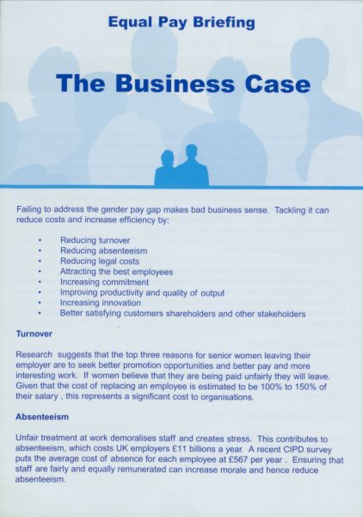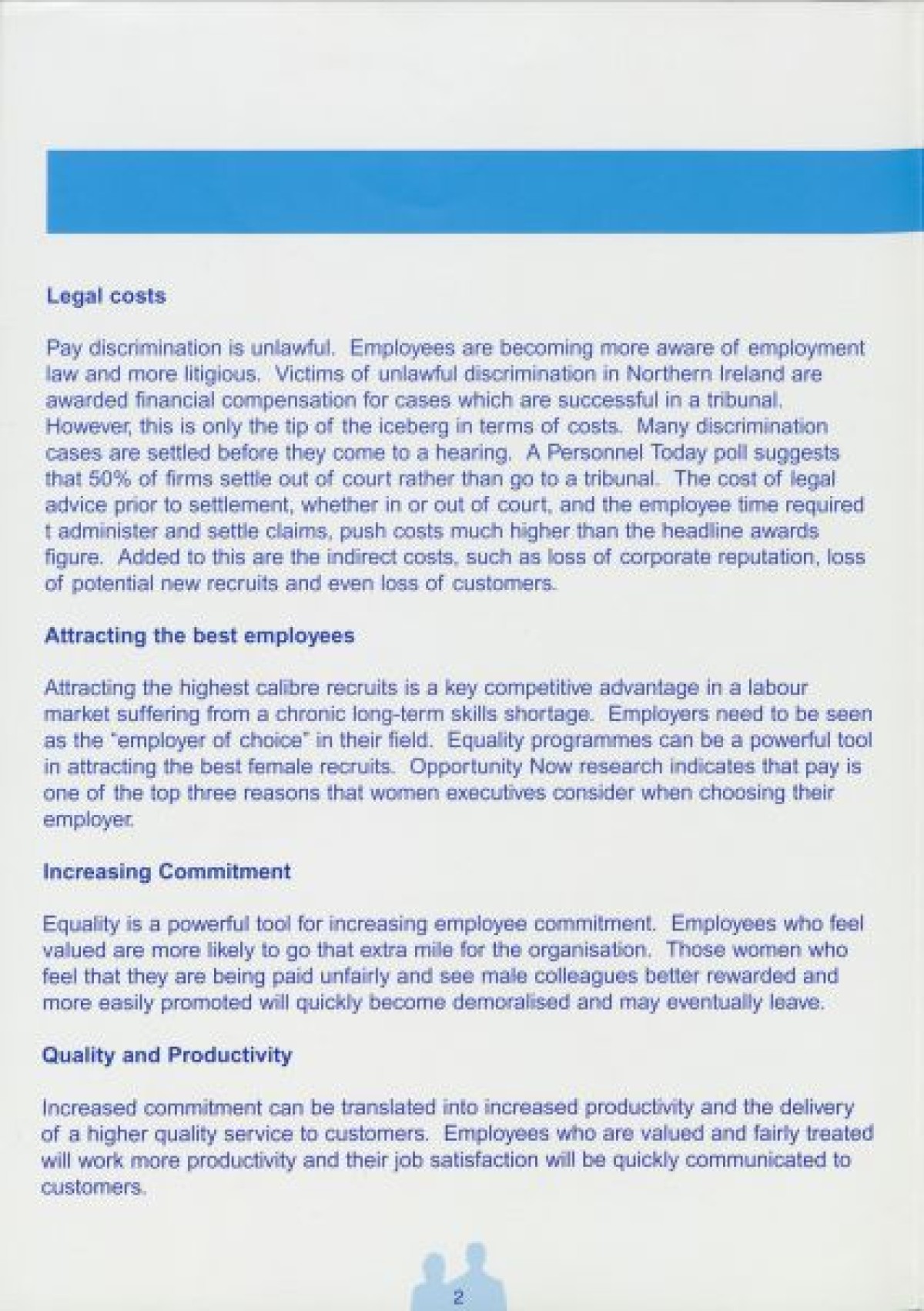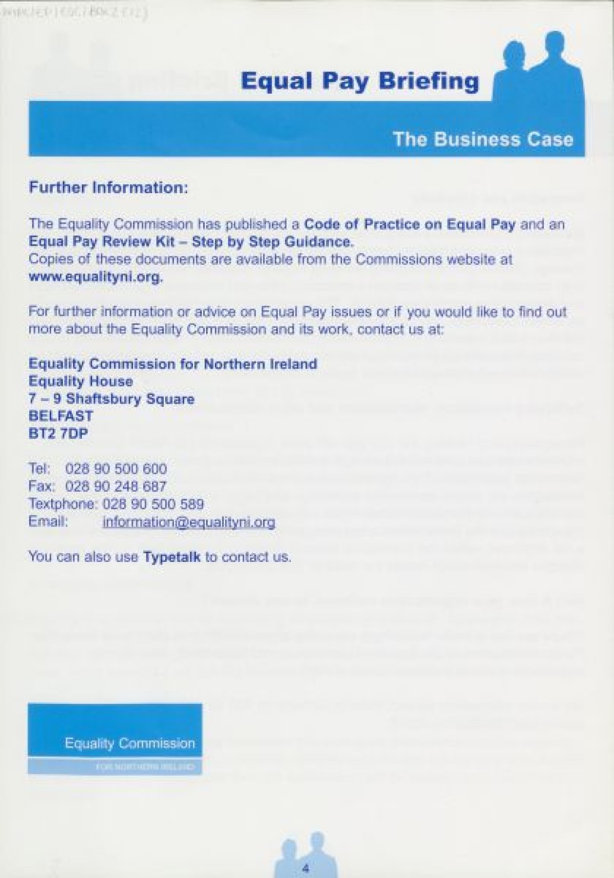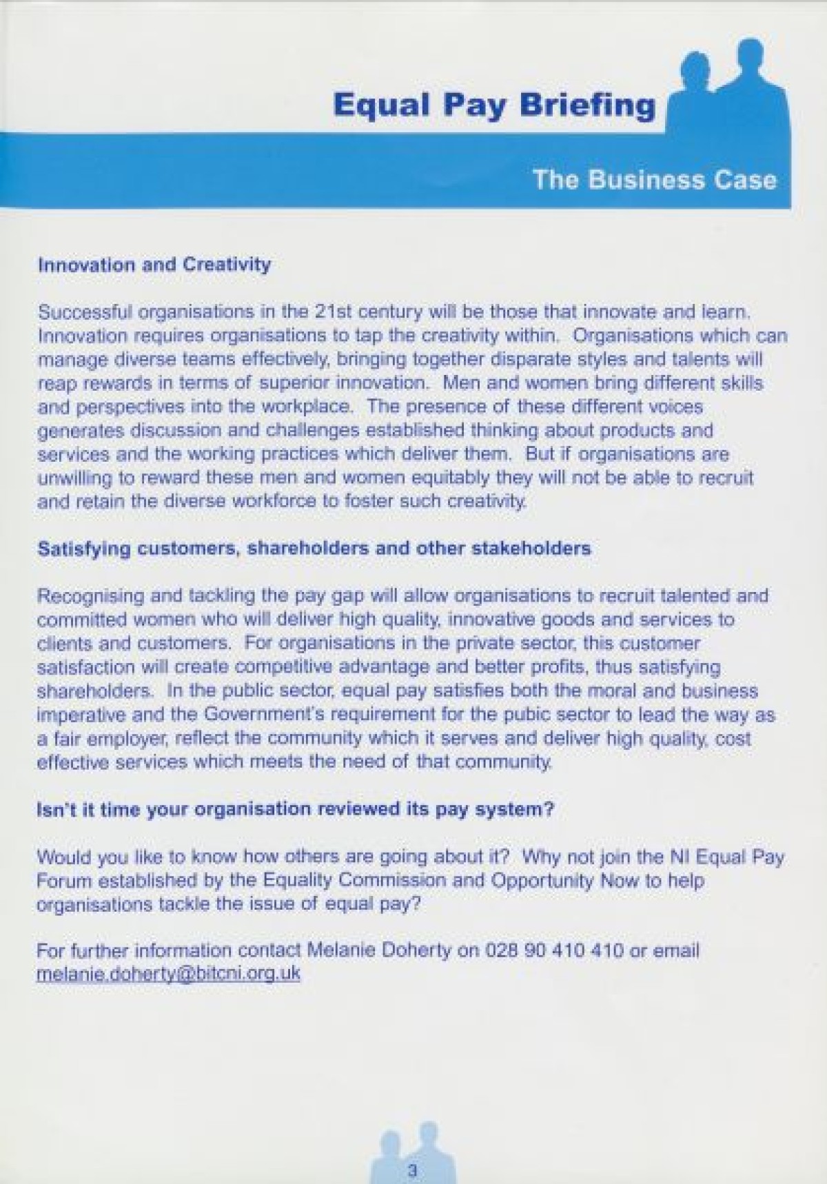Booklet produced by the Equality Commission Northern Ireland, titled 'Equal Pay Briefing: The Business Case', containing information to help employers and trade union representatives deal with common causes of unequal pay to improve efficiency of workplace.