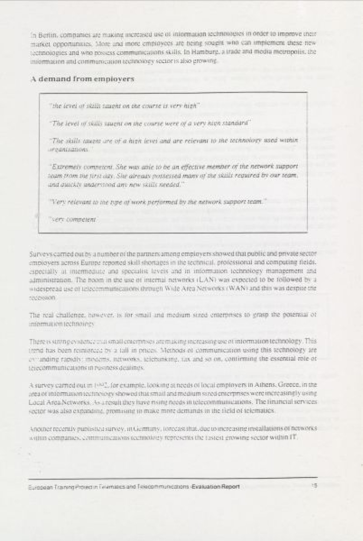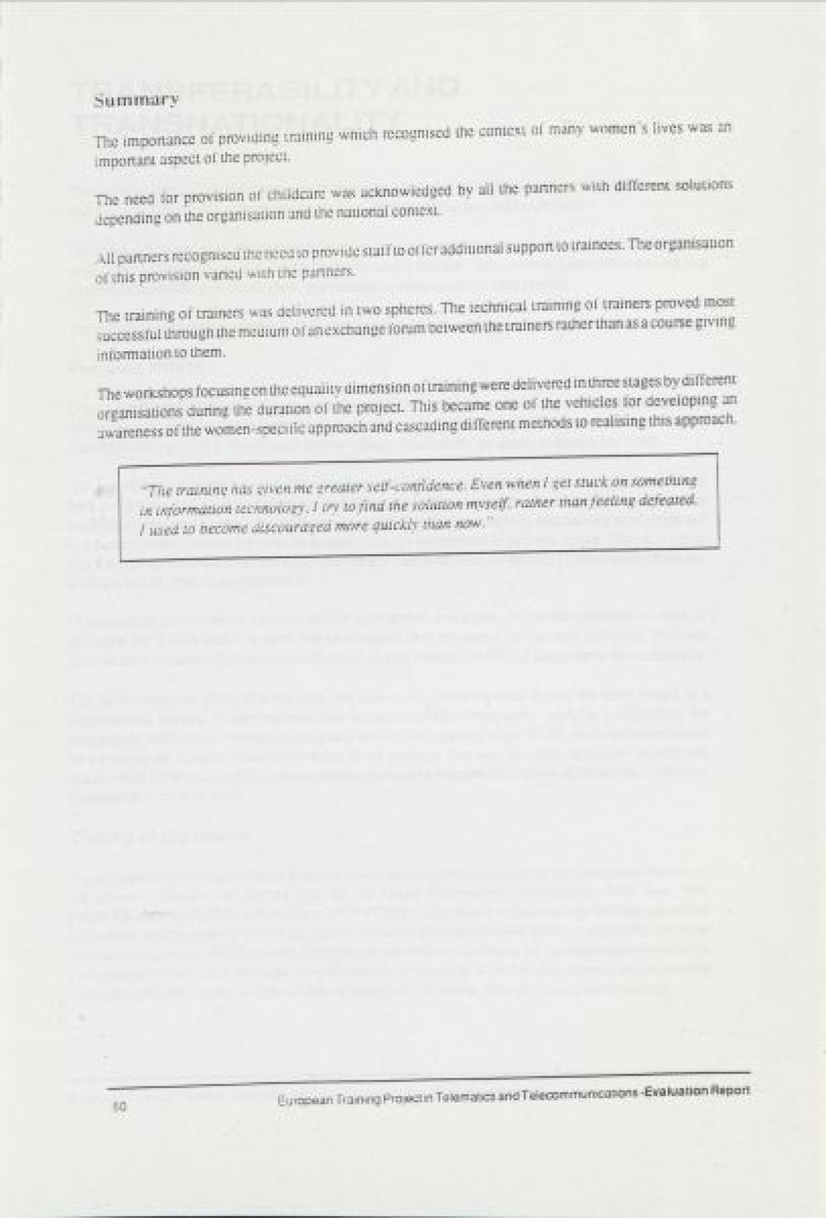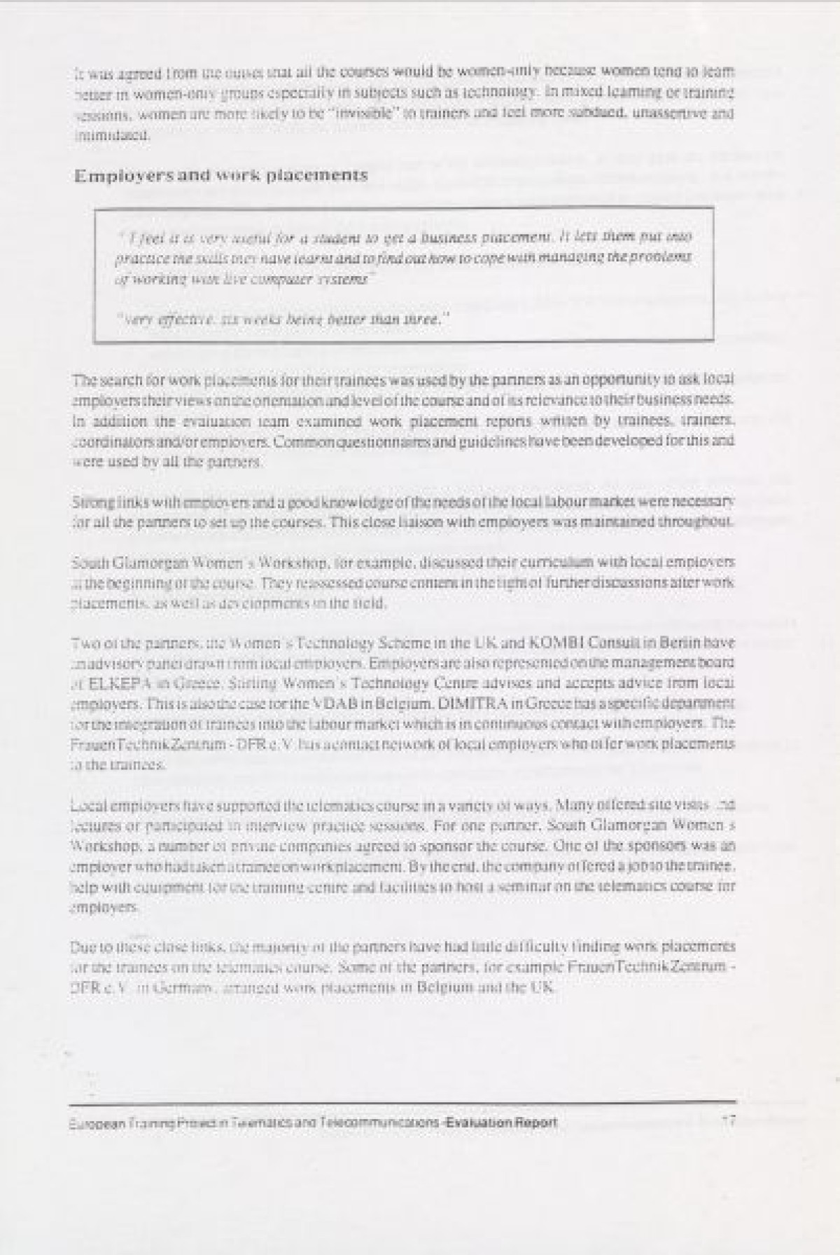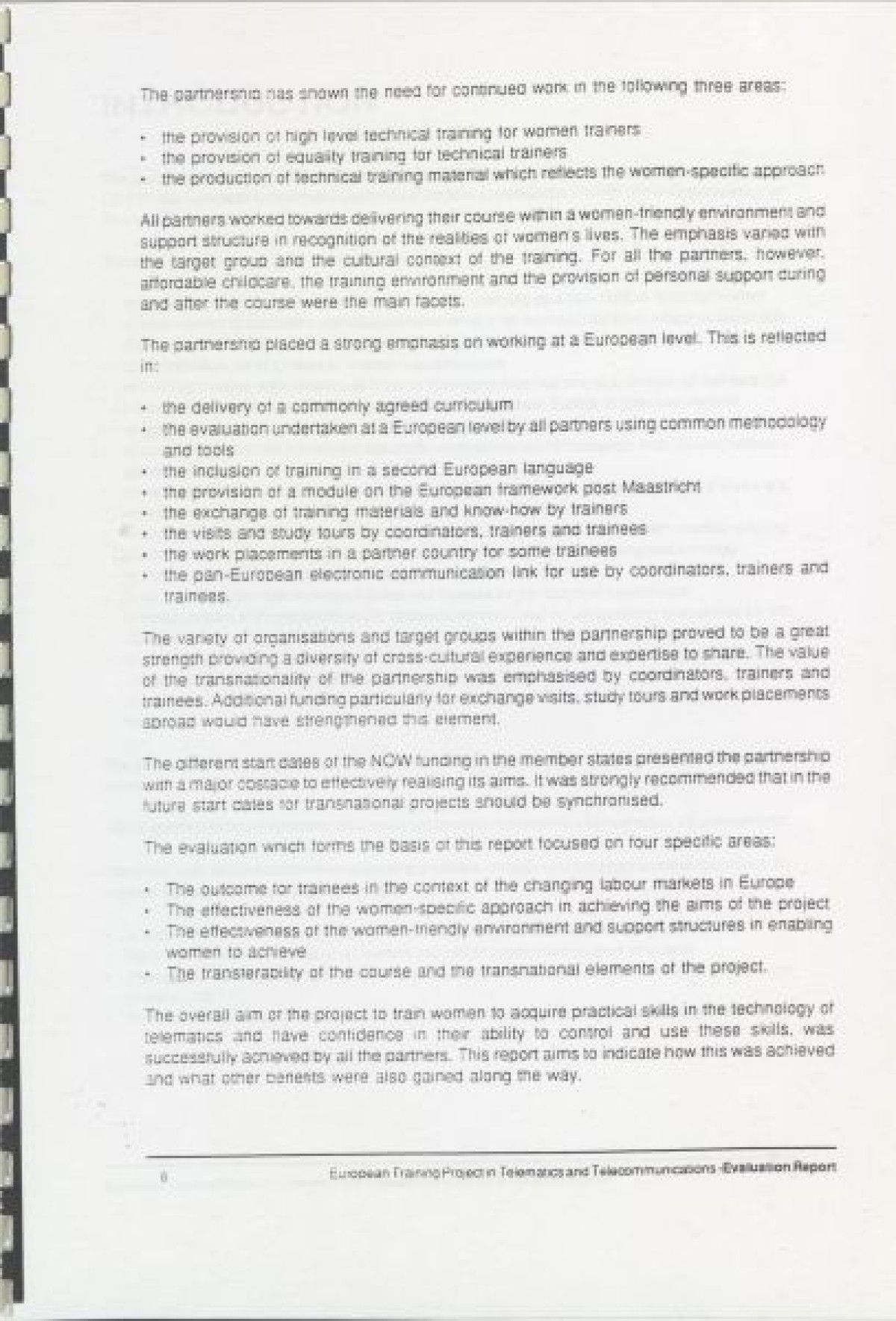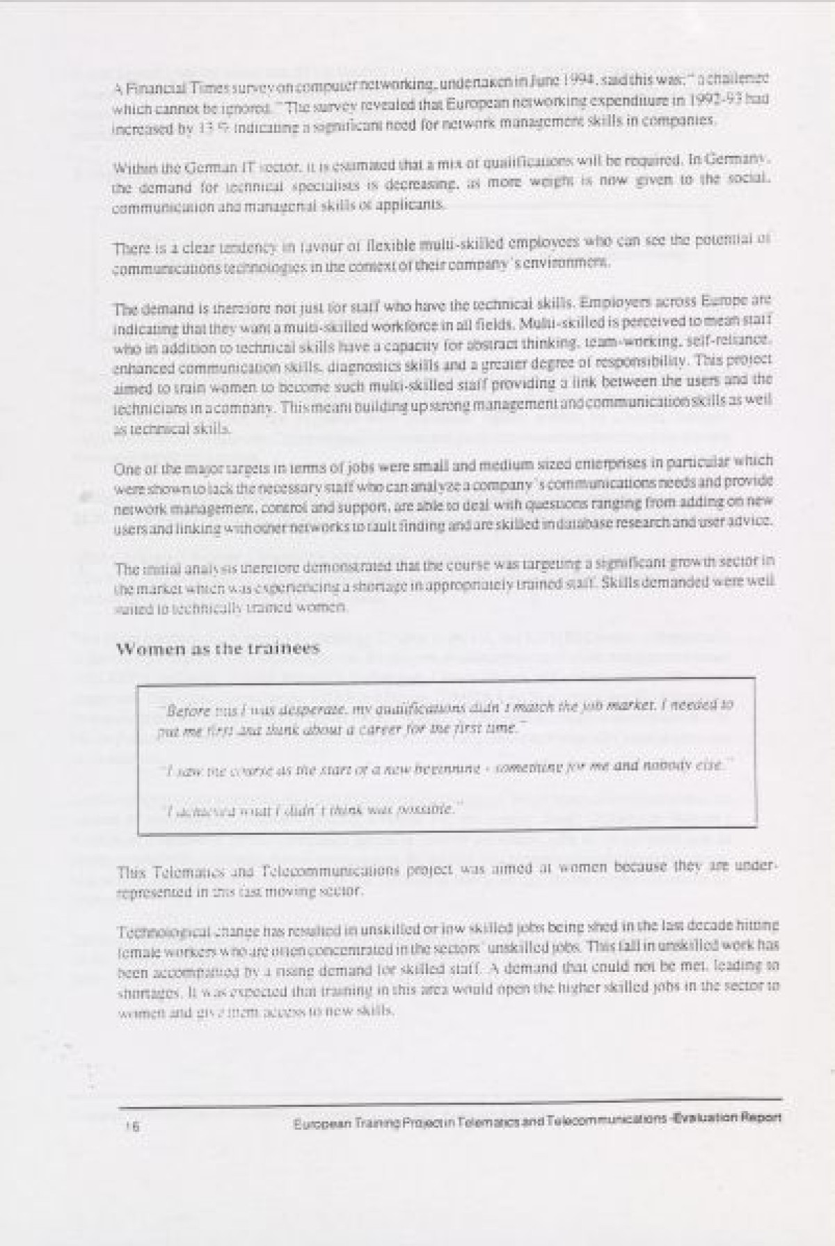 Pages from a report, containing an evaluation summary of a European project to train women in Telematics and Telecommunications. Includes an Executive Summary outlining a women's specific approach to training in technology; introduction and background to the project; reports from women trainees, graphs showing levels of previous employment; and a report on the effectiveness of the women friendly environment and support structures.