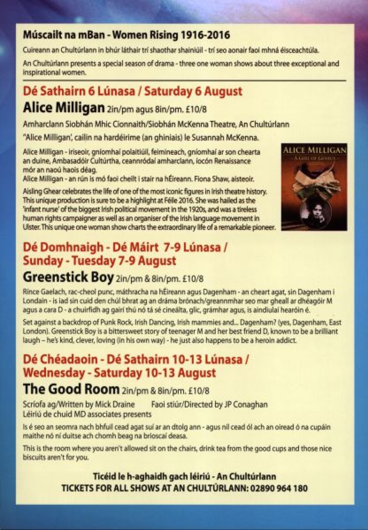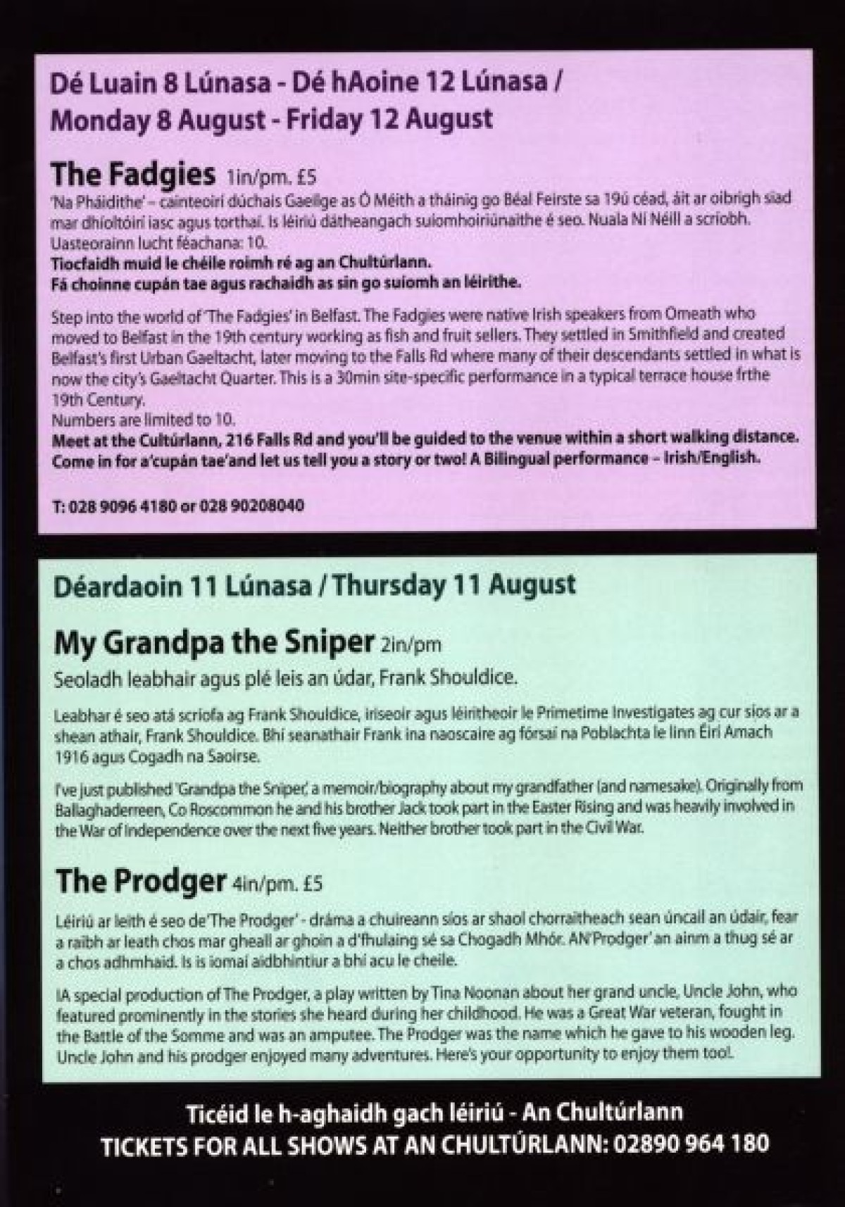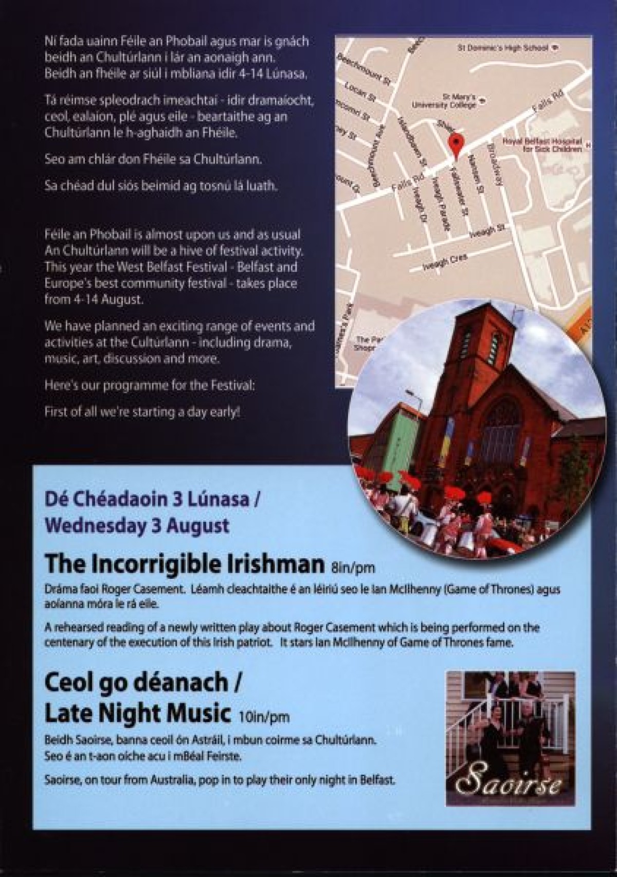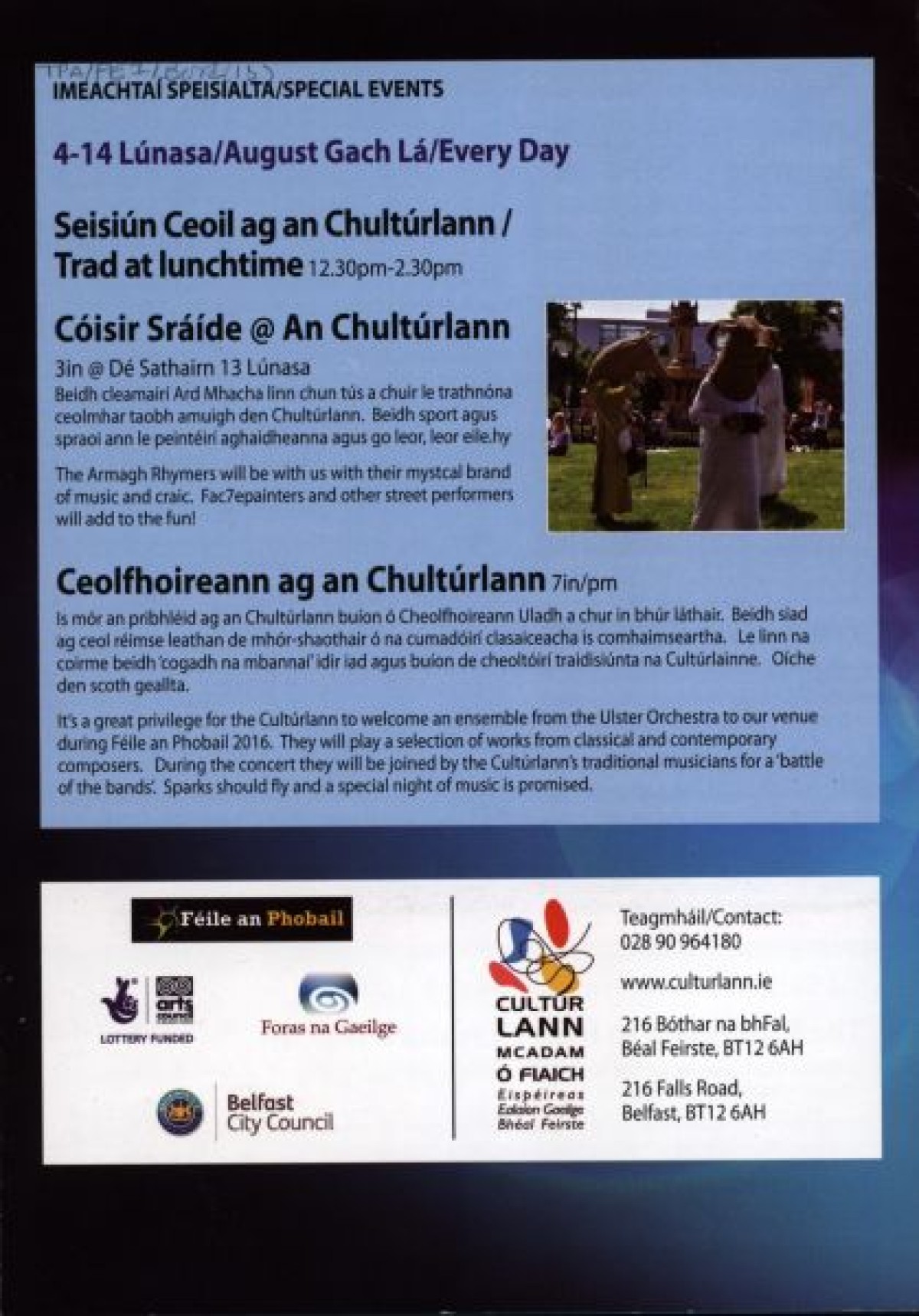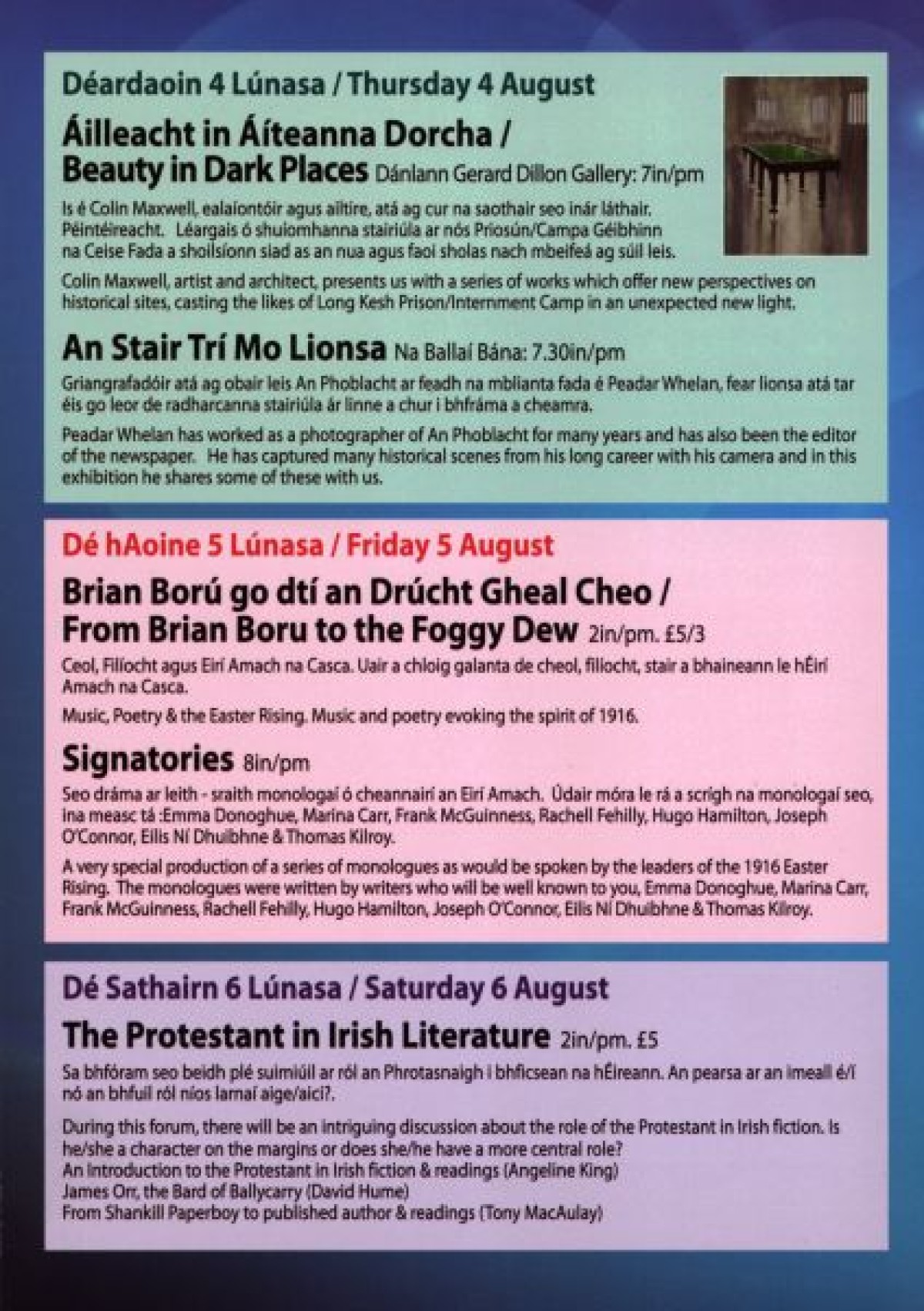 Flyer, Féile an Phobail, giving details for events for August 2016. Includes talks, music and literature.