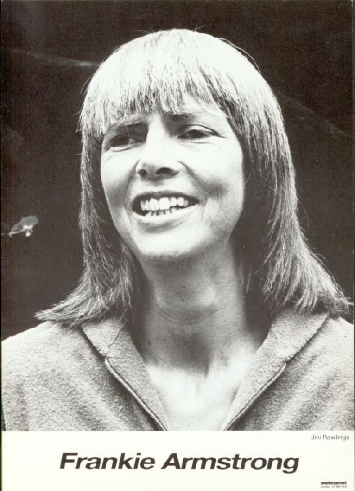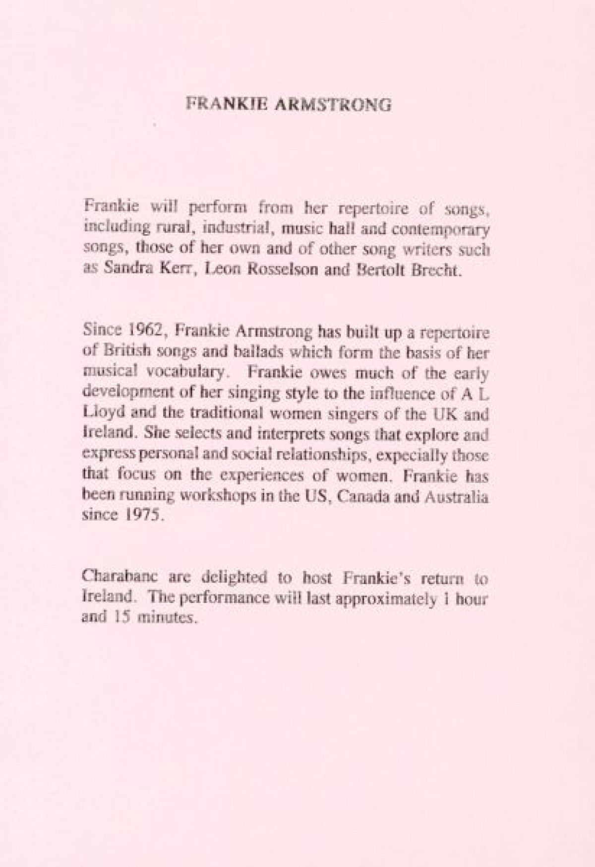 Photograph of Frankie Armstrong, singer and educator from Wales. Includes pink leaflet introducing Armstrong's performance at workshop hosted by