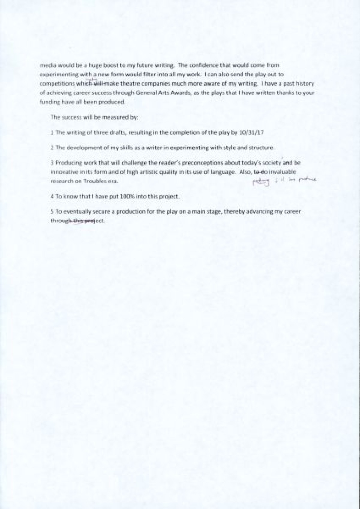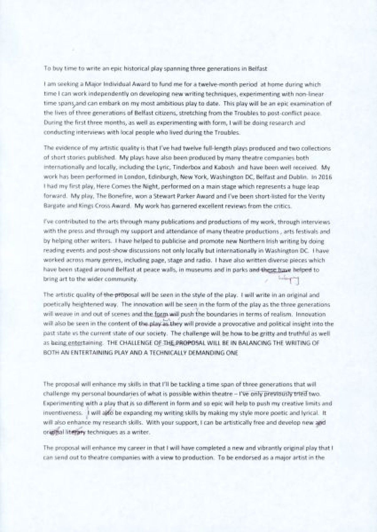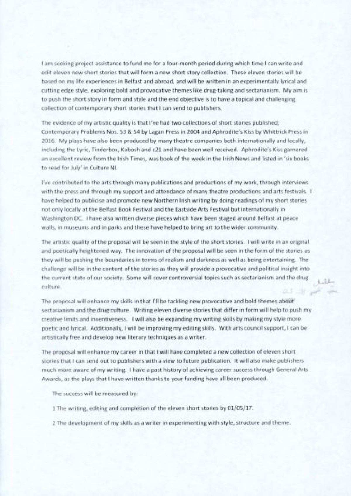 Proposal for a Major Individual Award with the Arts Council Northern Ireland, written by Rosemary Jenkinson, applying for 12-month funding support to write a short story collection. Contains evidence of artistic quality, measurements of success, and financial breakdown for the project.
