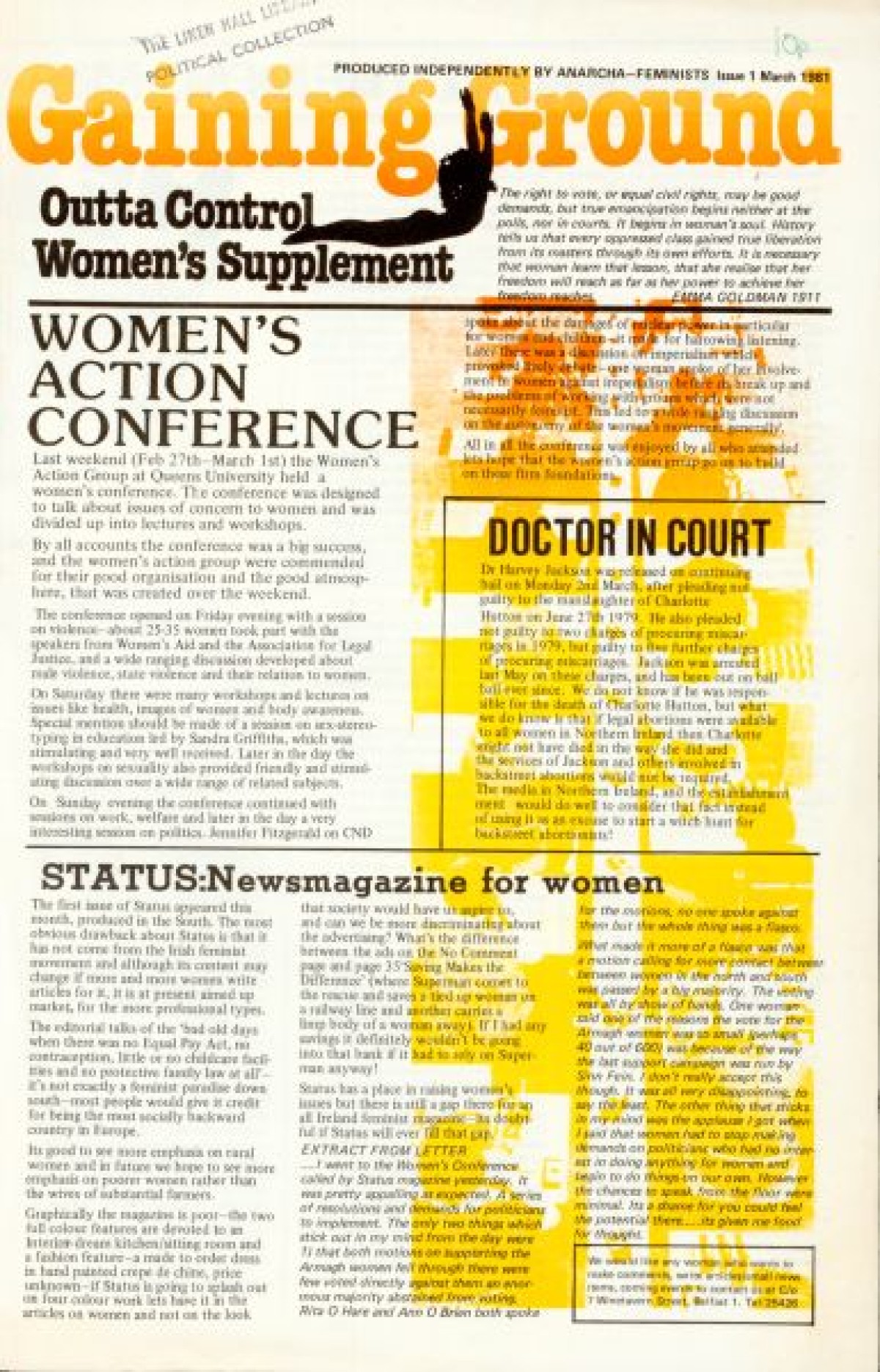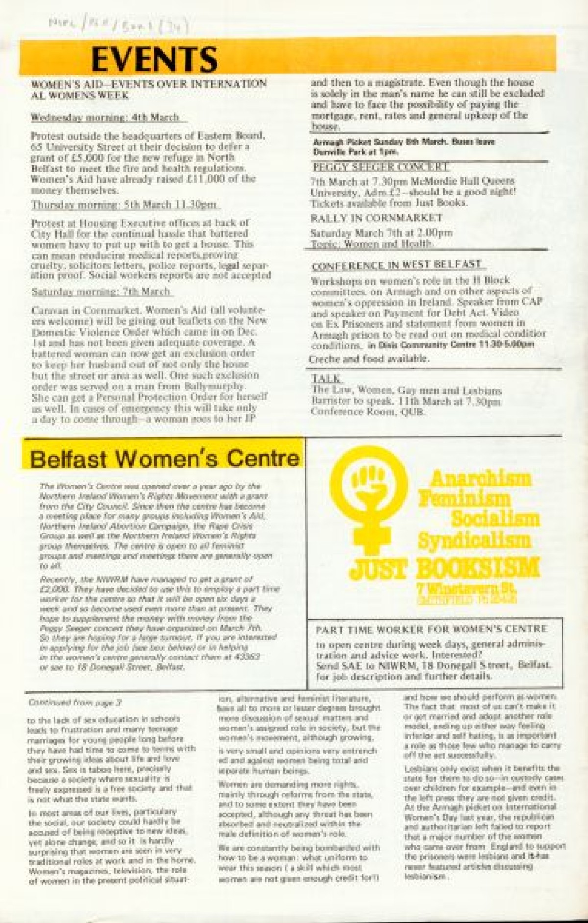 Anarcha-Feminists. Discusses a Women's Action Conference, launch of Status: Newsmagazine for women in Dublin, a Look at the Demands of the Women's Movement; Women's Aid Events during International Women's Week; and the Belfast Women's Centre.