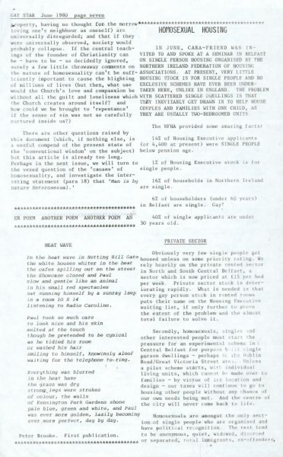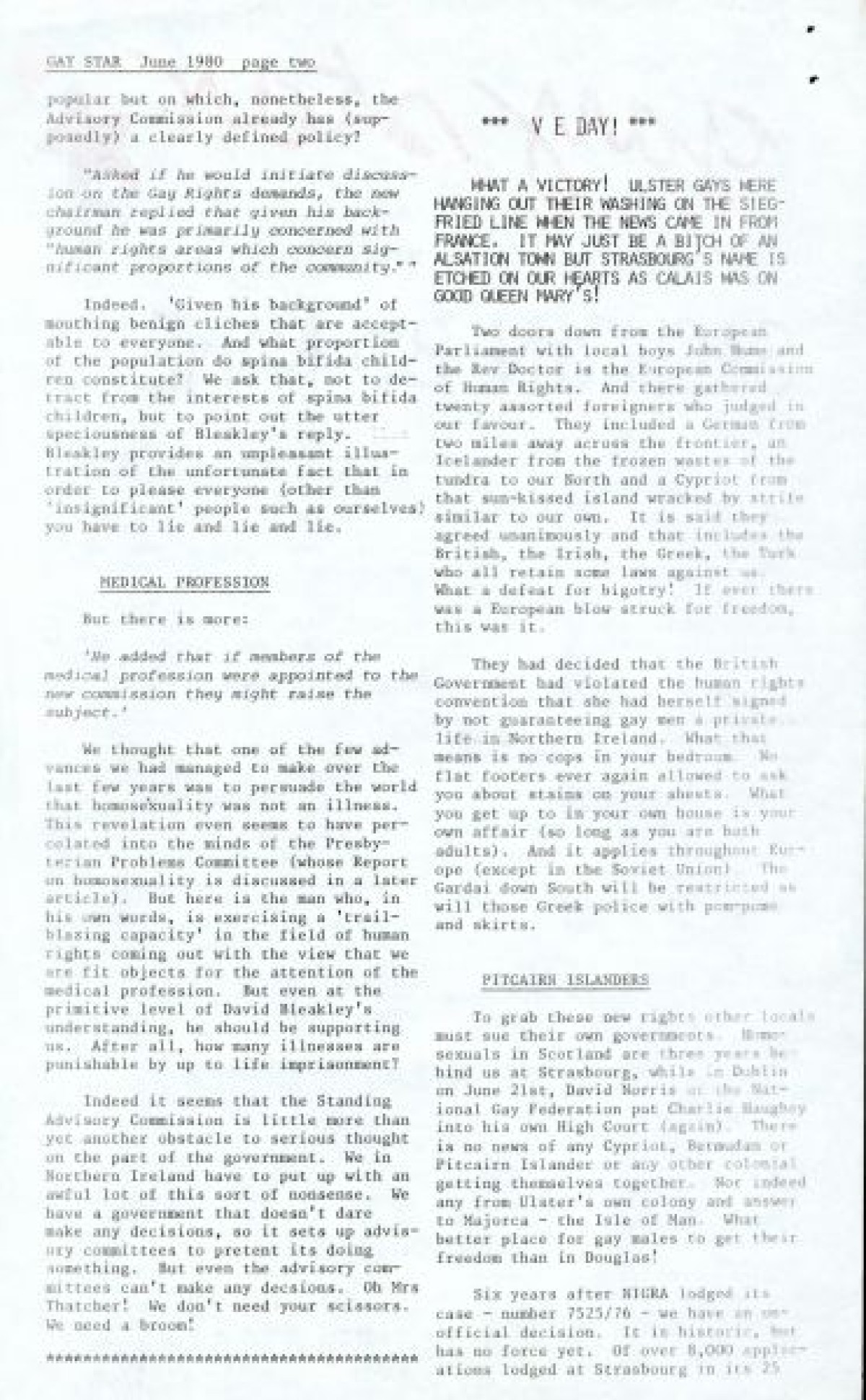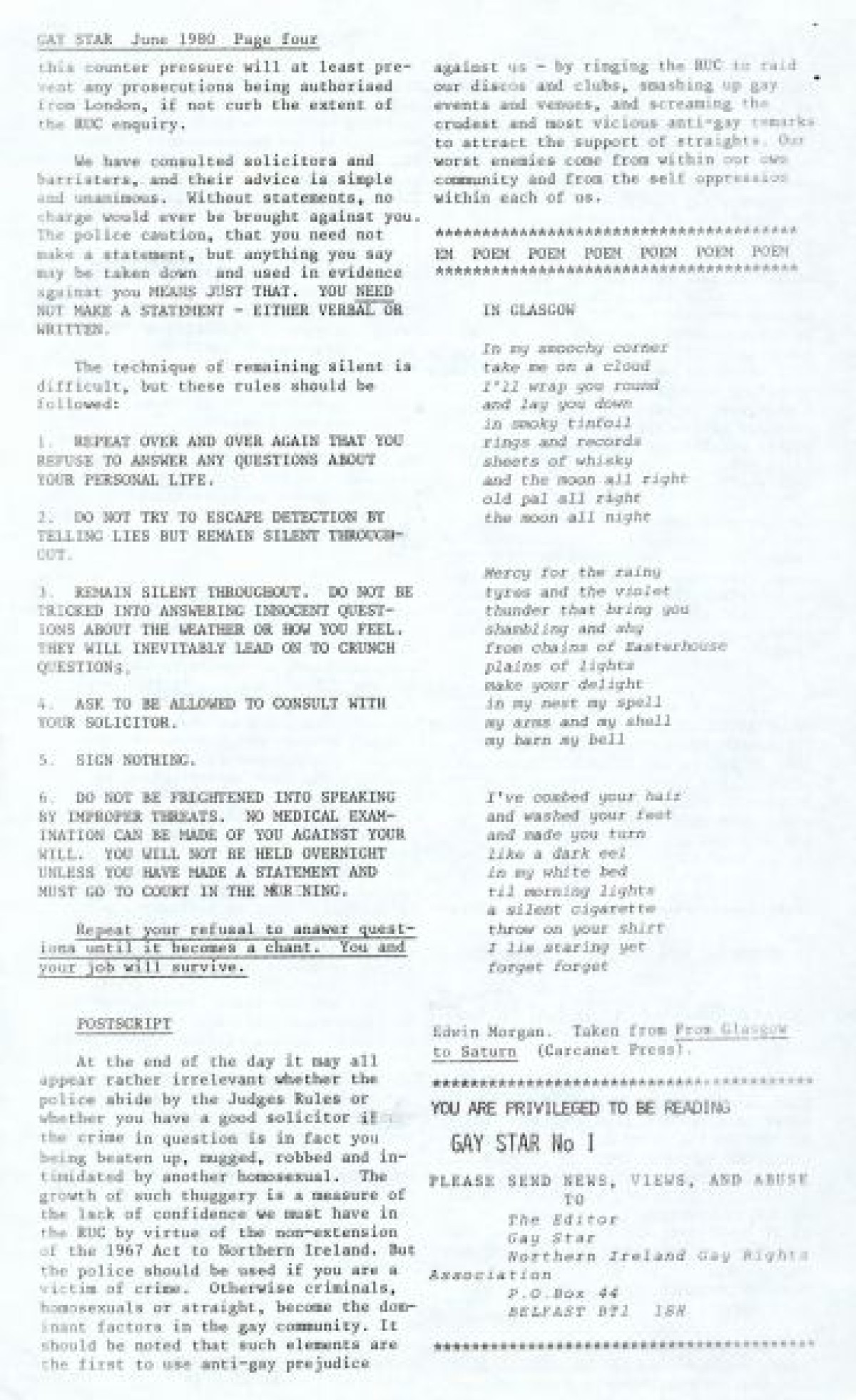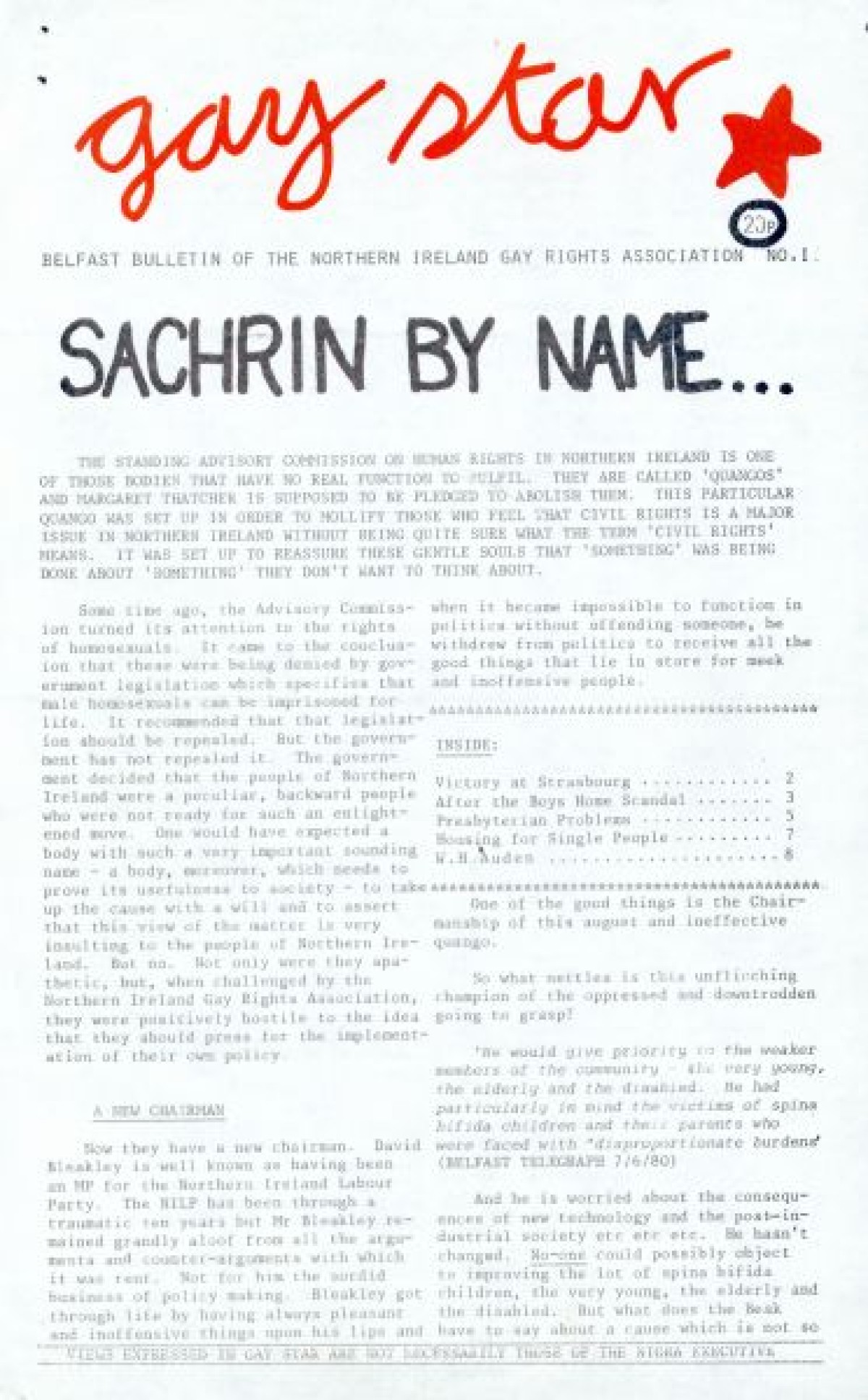 Gay Star, issue 1, June 1980. Contains a cover article about the Standing Advisory Commission on Human Rights in Northern Ireland, and other articles including: "Victory at Strasbourg"; "After the Boys Home Scandal"; "Presbyterian Problems"; "Housing for Single People"; poems by Peter Brooke and Edwin Morgan; and a review of Charles Osborne's biography of W H Auden.