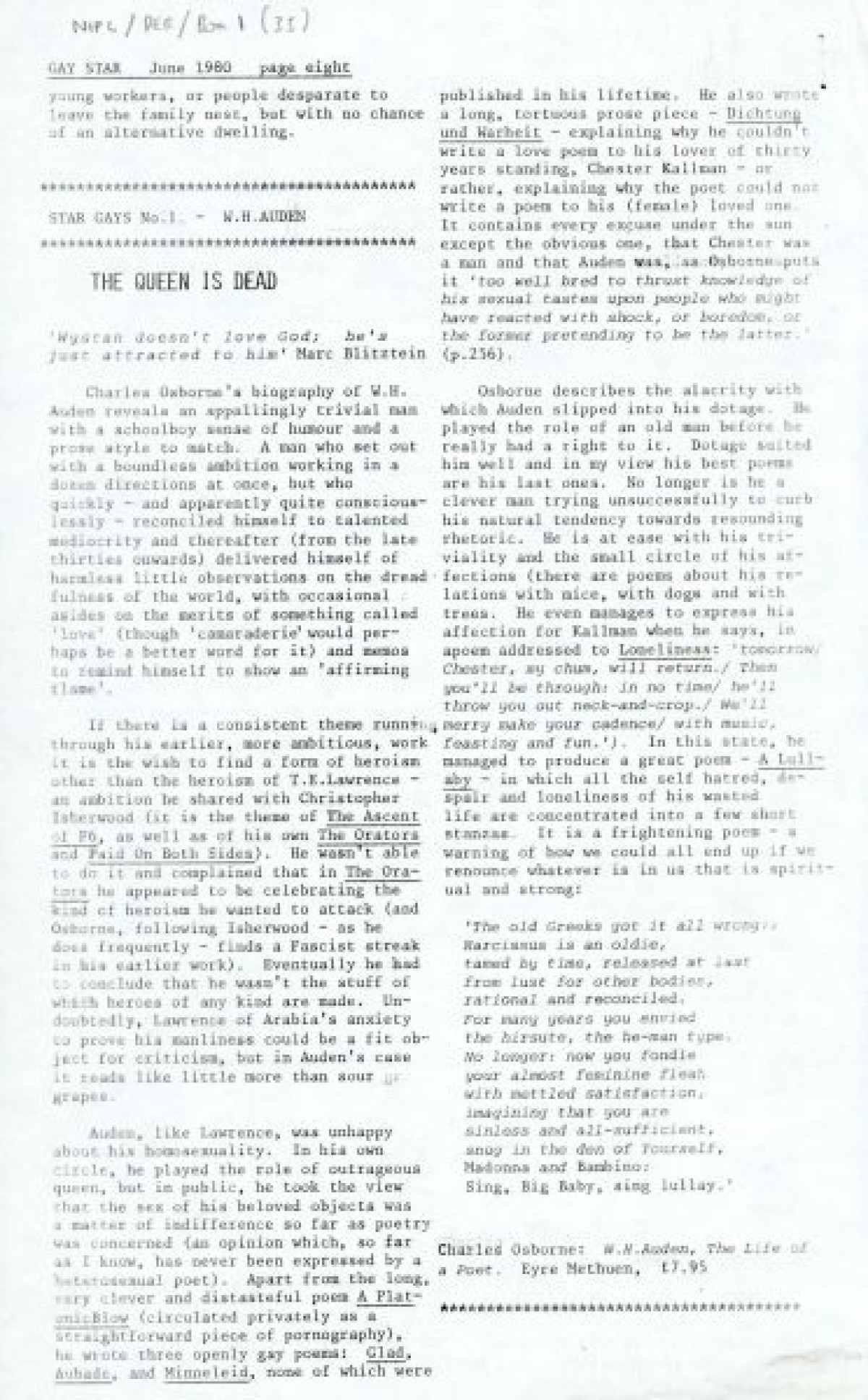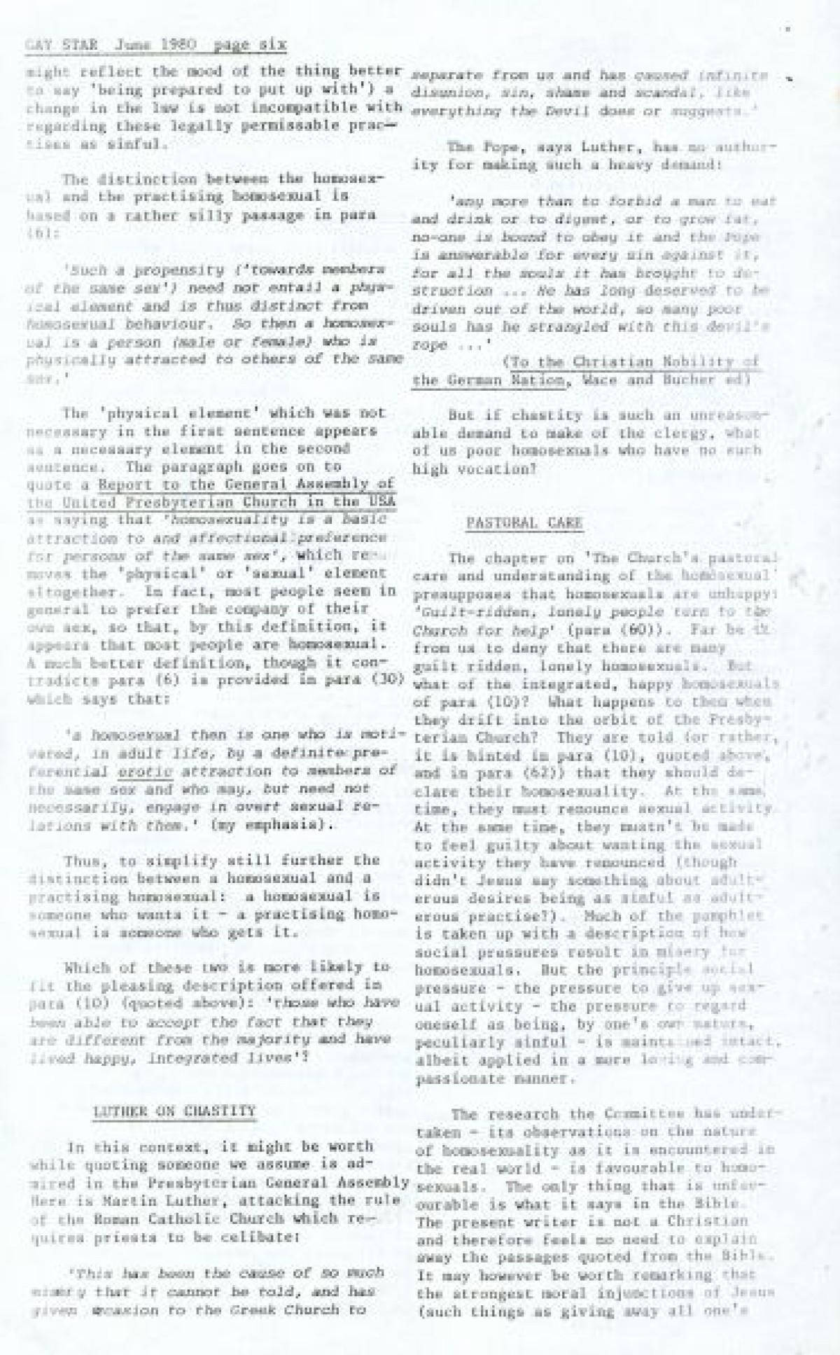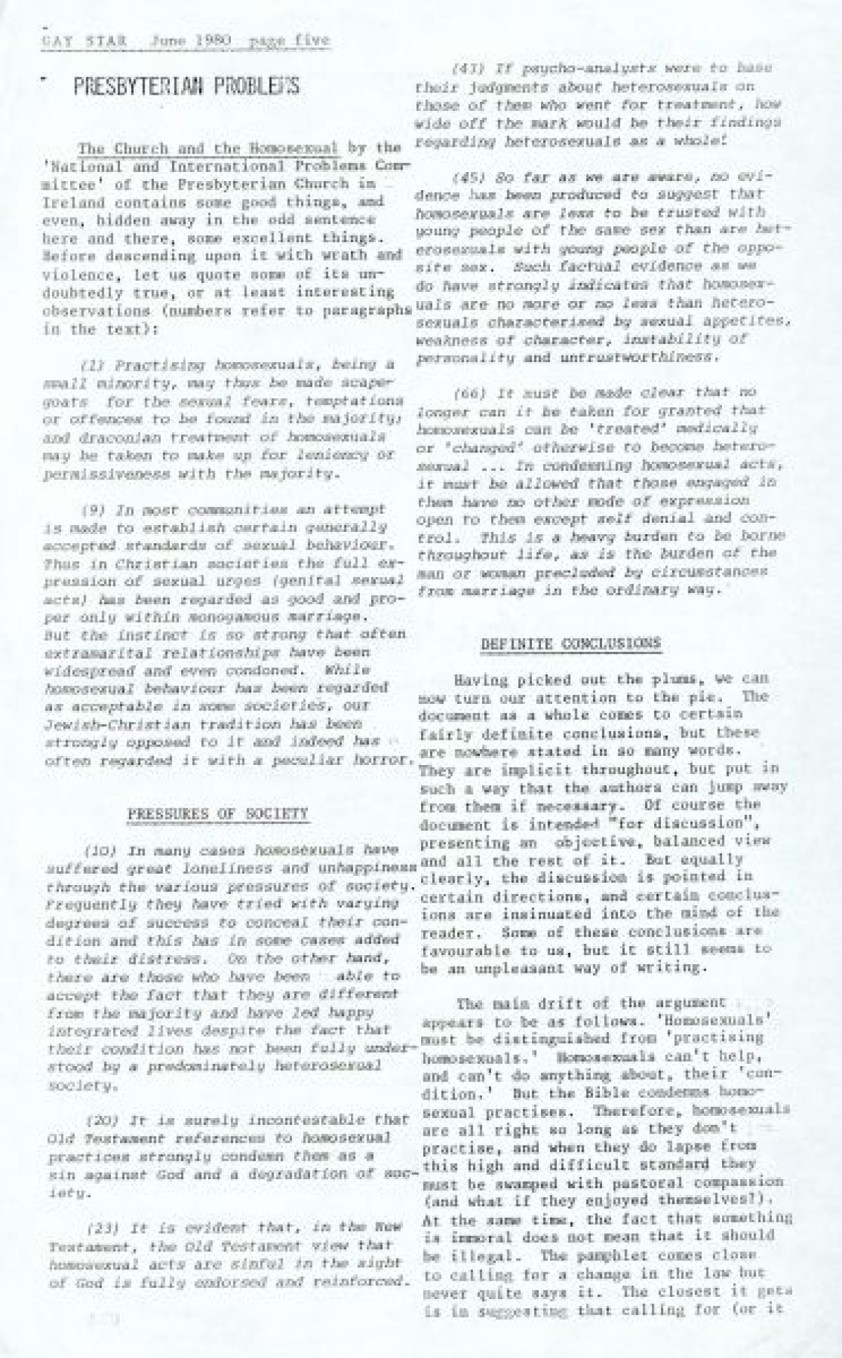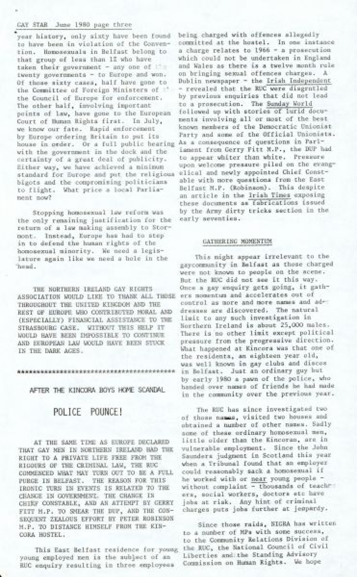 Gay Star, issue 1, June 1980. Contains a cover article about the Standing Advisory Commission on Human Rights in Northern Ireland, and other articles including: "Victory at Strasbourg"; "After the Boys Home Scandal"; "Presbyterian Problems"; "Housing for Single People"; poems by Peter Brooke and Edwin Morgan; and a review of Charles Osborne's biography of W H Auden.