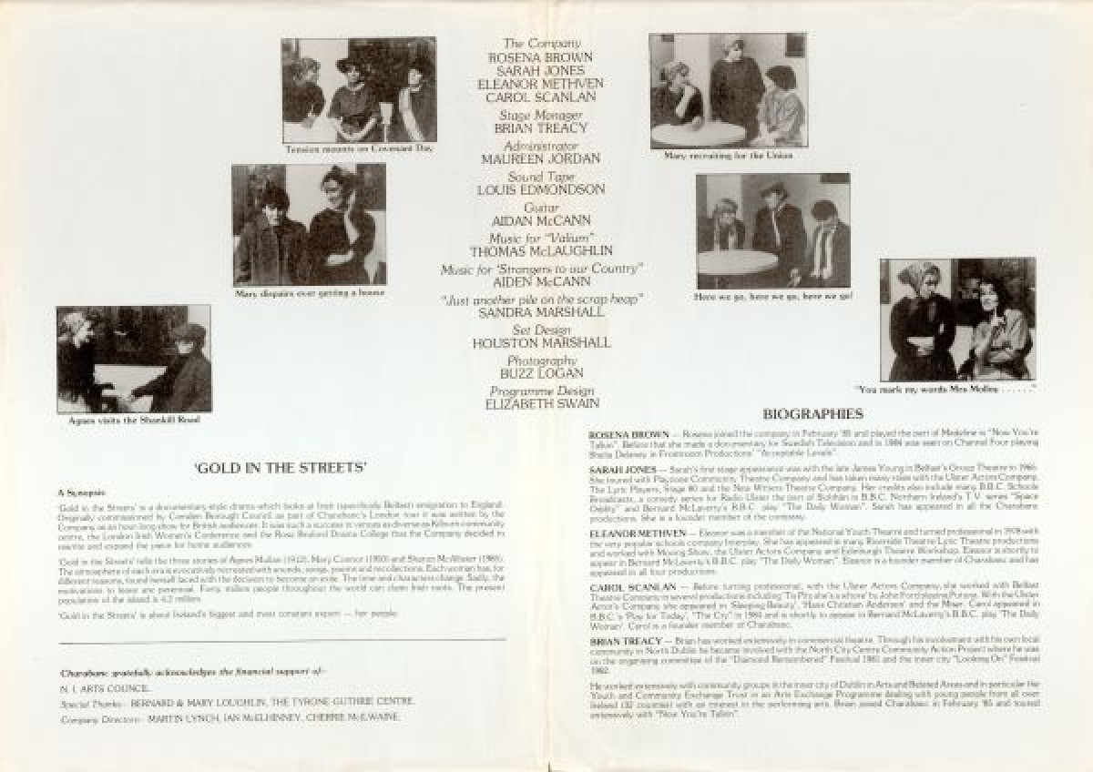Charabanc Theatre Company's 'Gold in the Streets.' The reverse of the poster features a synopsis about the production, as well as cast profiles and a selection of black and white stage photographs from various scenes.
