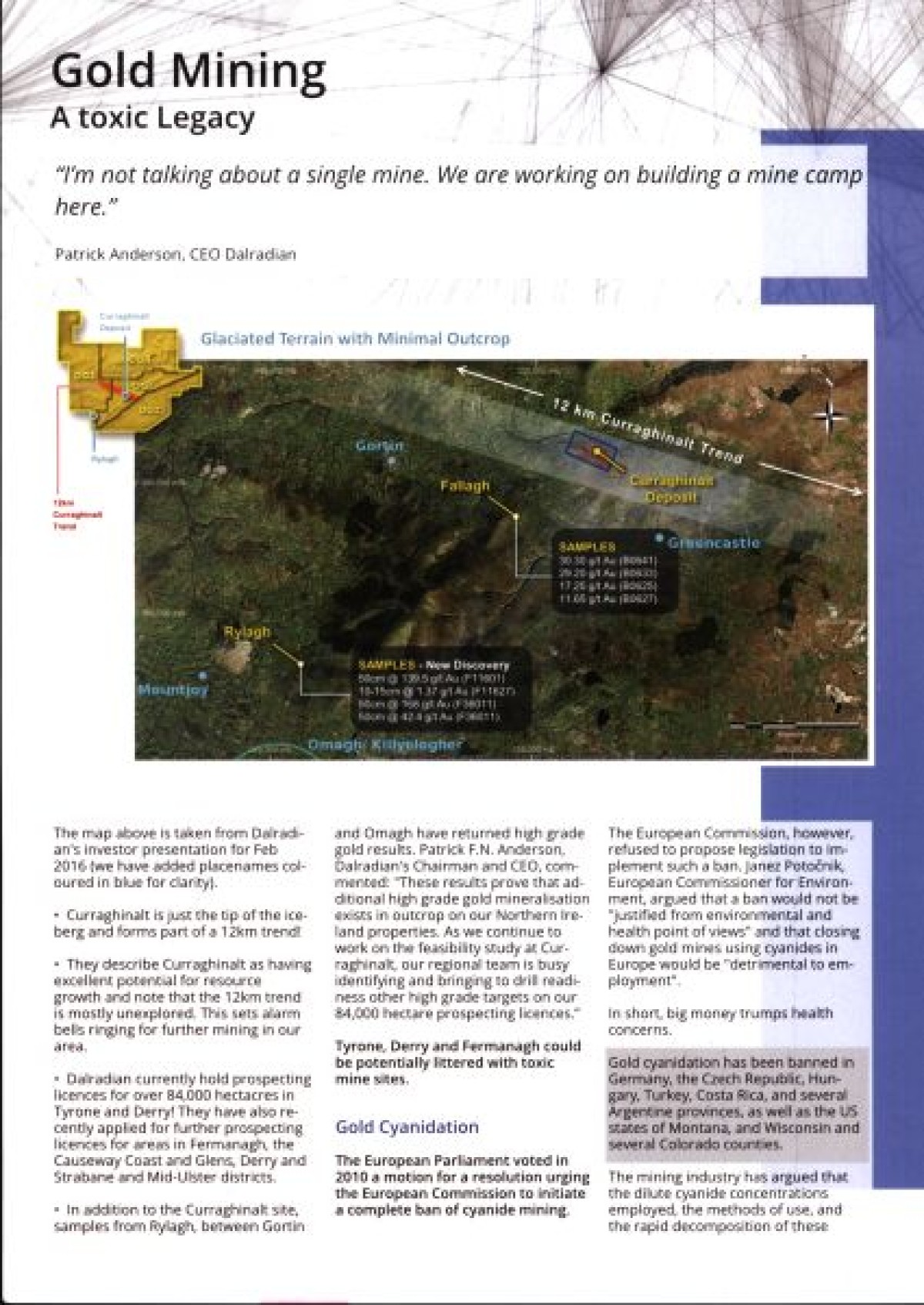 Save Our Sperrins relating to the environmental dangers of a proposed gold mine by Dalradian Gold Ltd. Contains a map of proposed site locations, discussion of gold cyanidation and questions and answers about the impact of goldmining on the Sperrins. Also contains a statement from Finnish Biochemist Jari Natunen, about the environmental impact of toxic leaks from the Kittilä gold mine in Finland.
