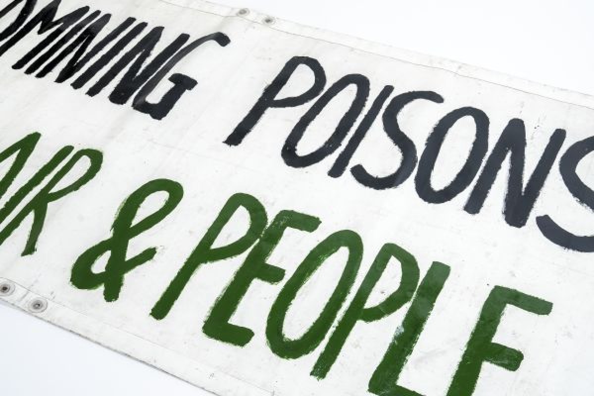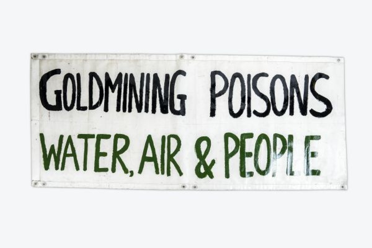Large banner (91cm x 195cm) with green and black lettering reading, 'Goldmining Poisons Water, Air & People,' painted on the back of a food market tarpaulin. Made by activists from the