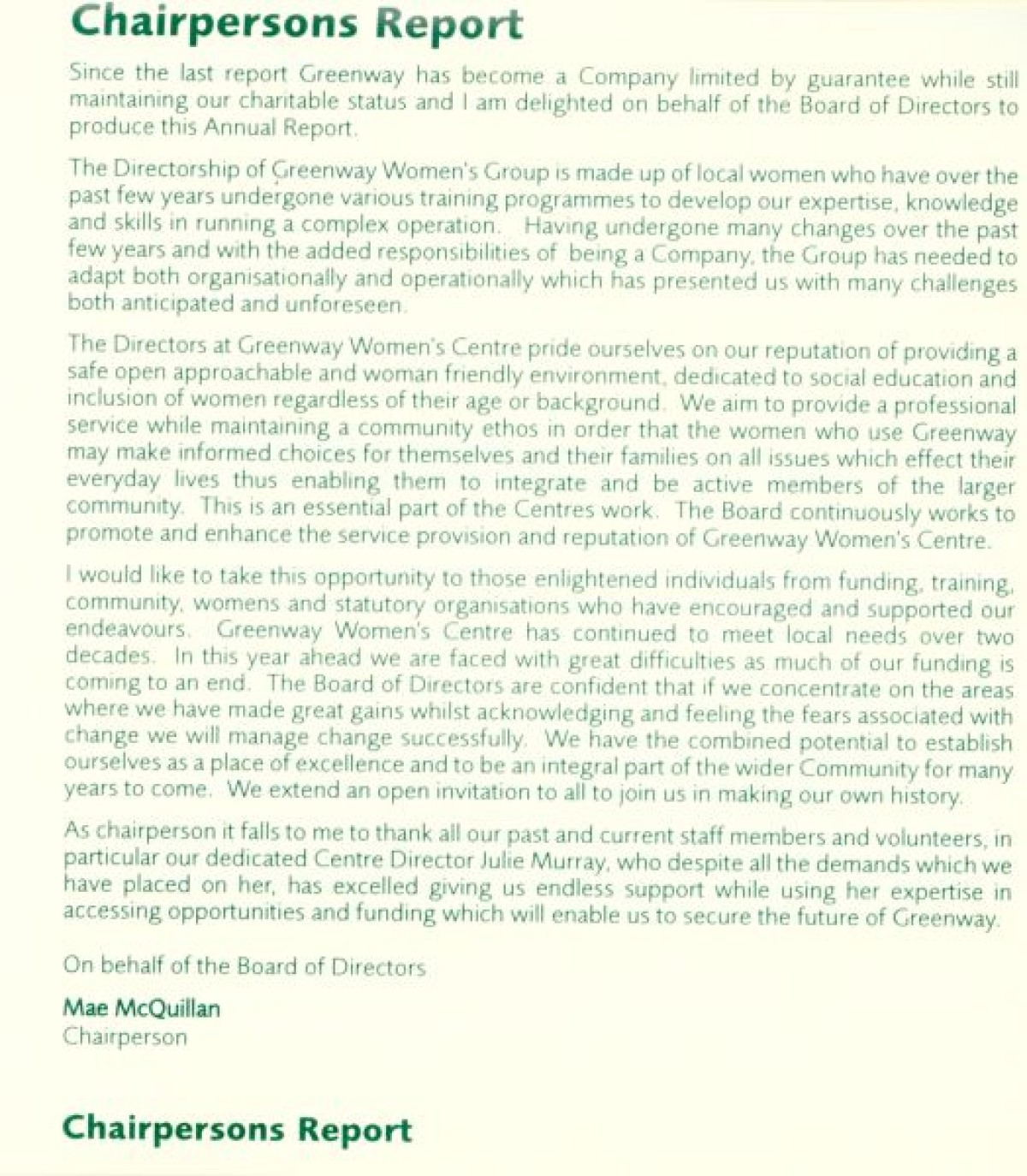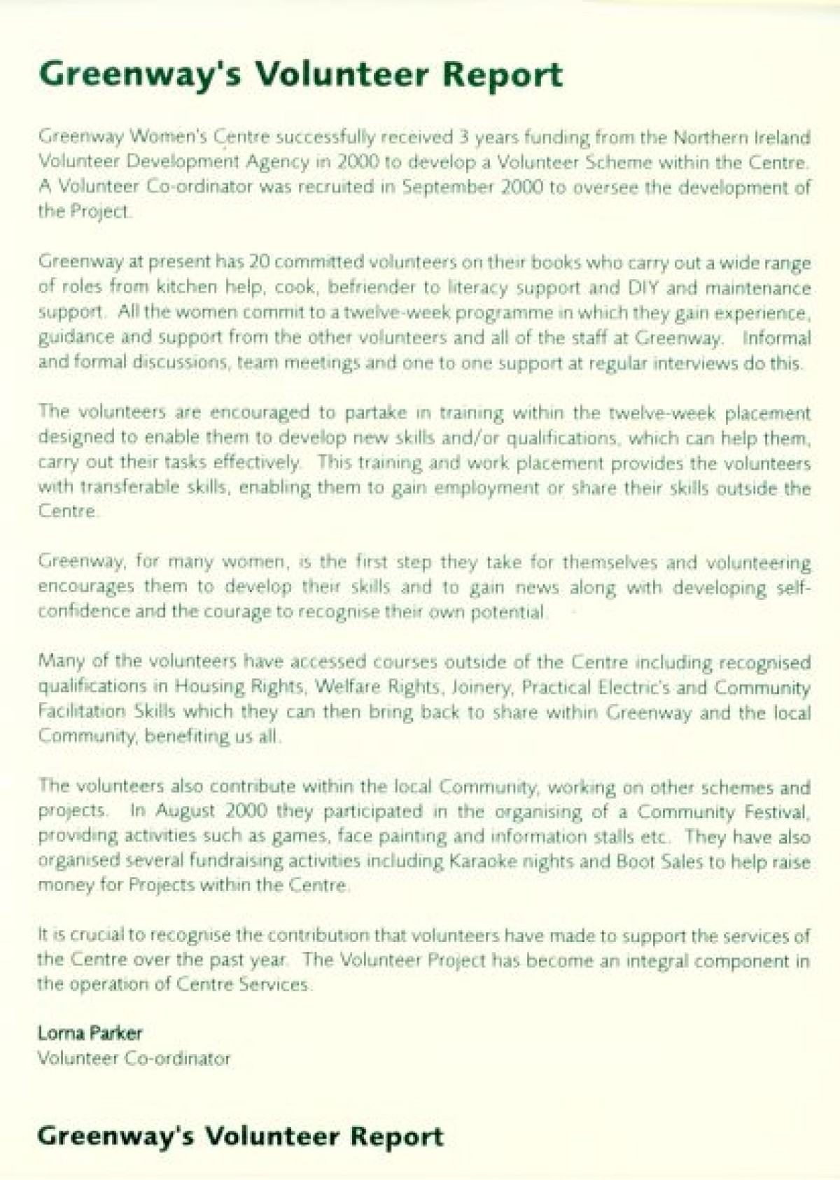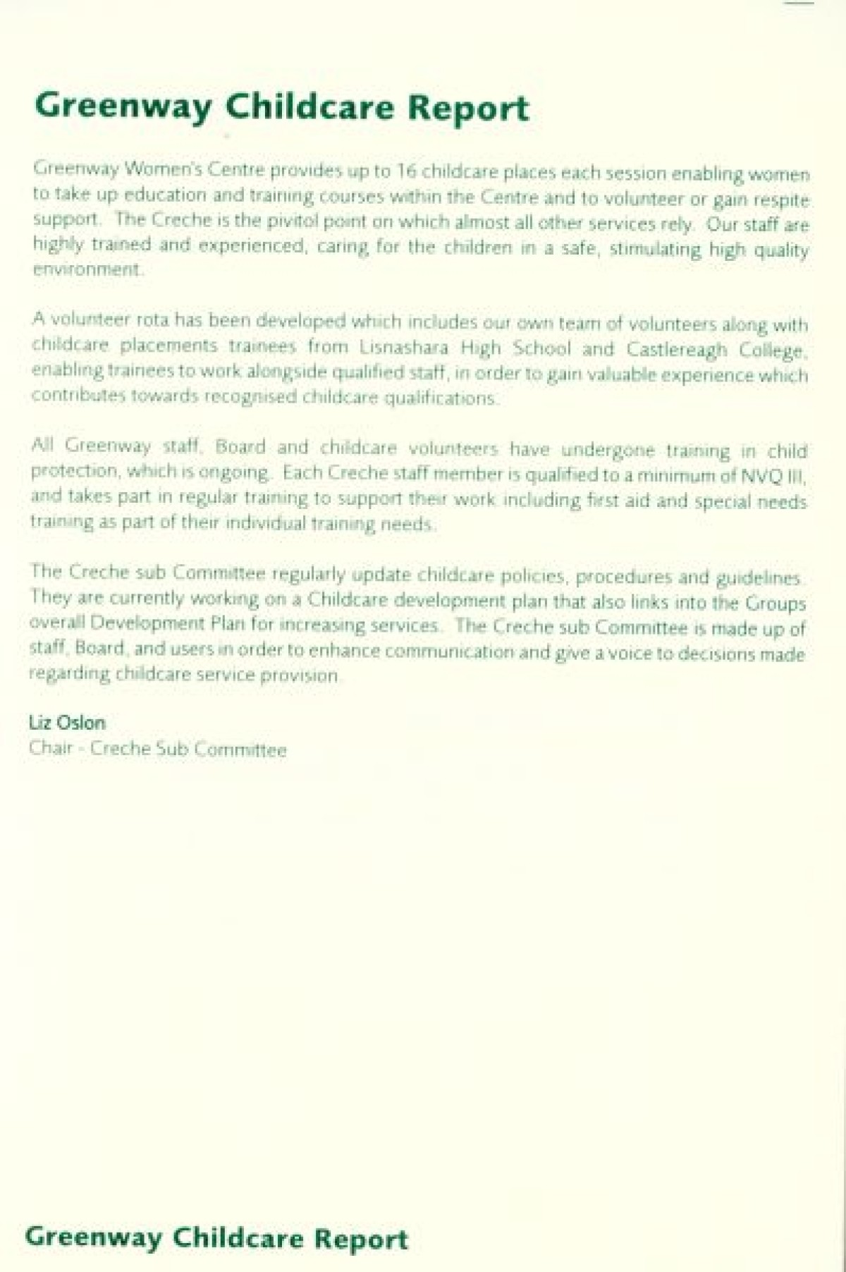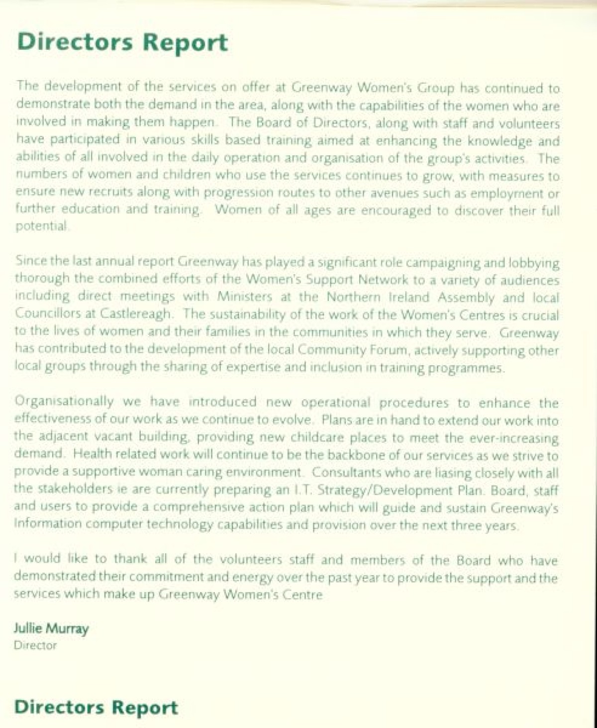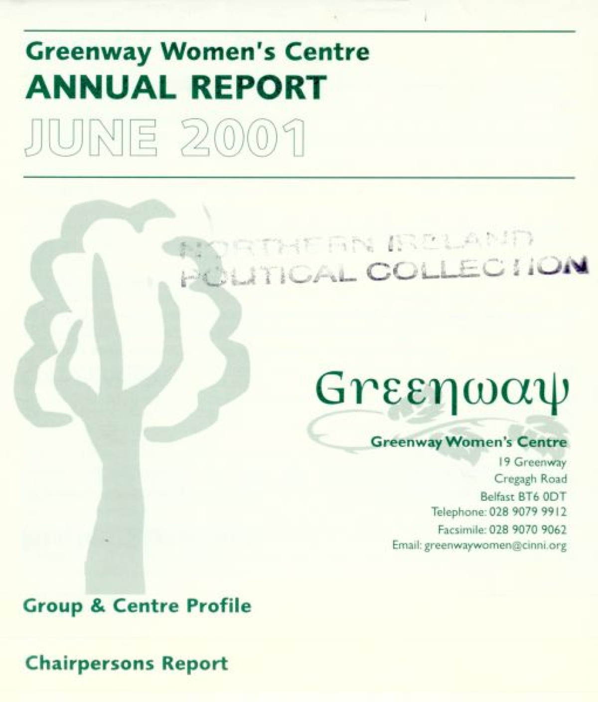 Greenway Women's Centre Annual Report, June 2001. Contents include a Mission Statement and Core Principles to develop, support and encourage women of all ages; Profile of the Greenway Women's Group and Centre; Chairperson's Report by Mae McQuillan; Director's Report by Jullie Murray; Treasurer's Report by Liz Oslon; Greenway's Volunteer Report by Volunteer Co-ordinator Lorna Parker; Greenway Childcare Report; Young Mothers' Project; Enterprise Ulster; Education Report; and the Health Course and Health Report. Also includes a list of events, funders and partners, and a map depicting the location of the centre.