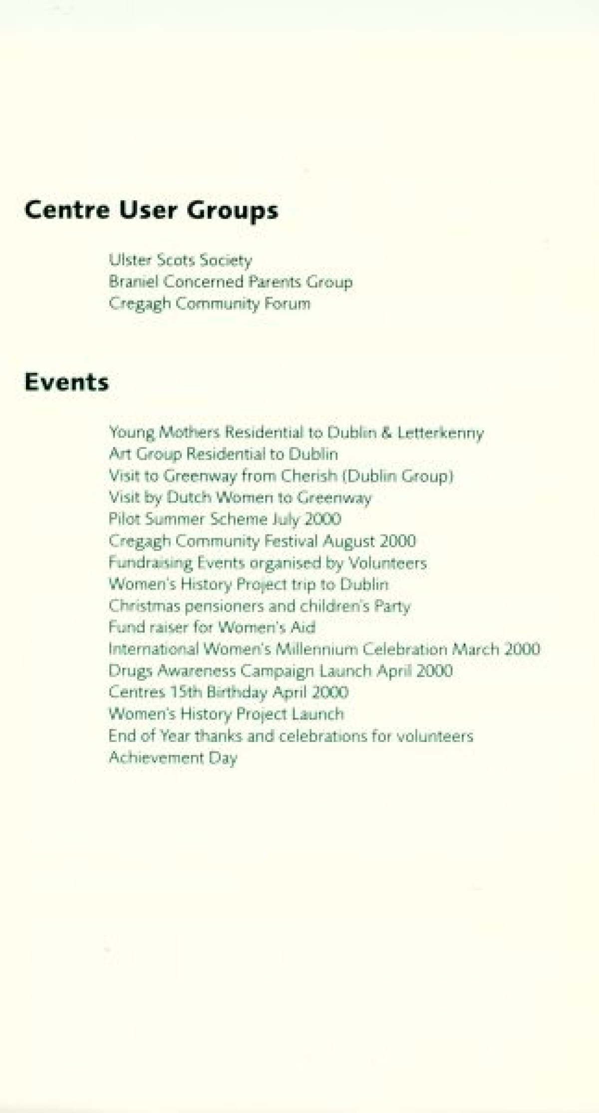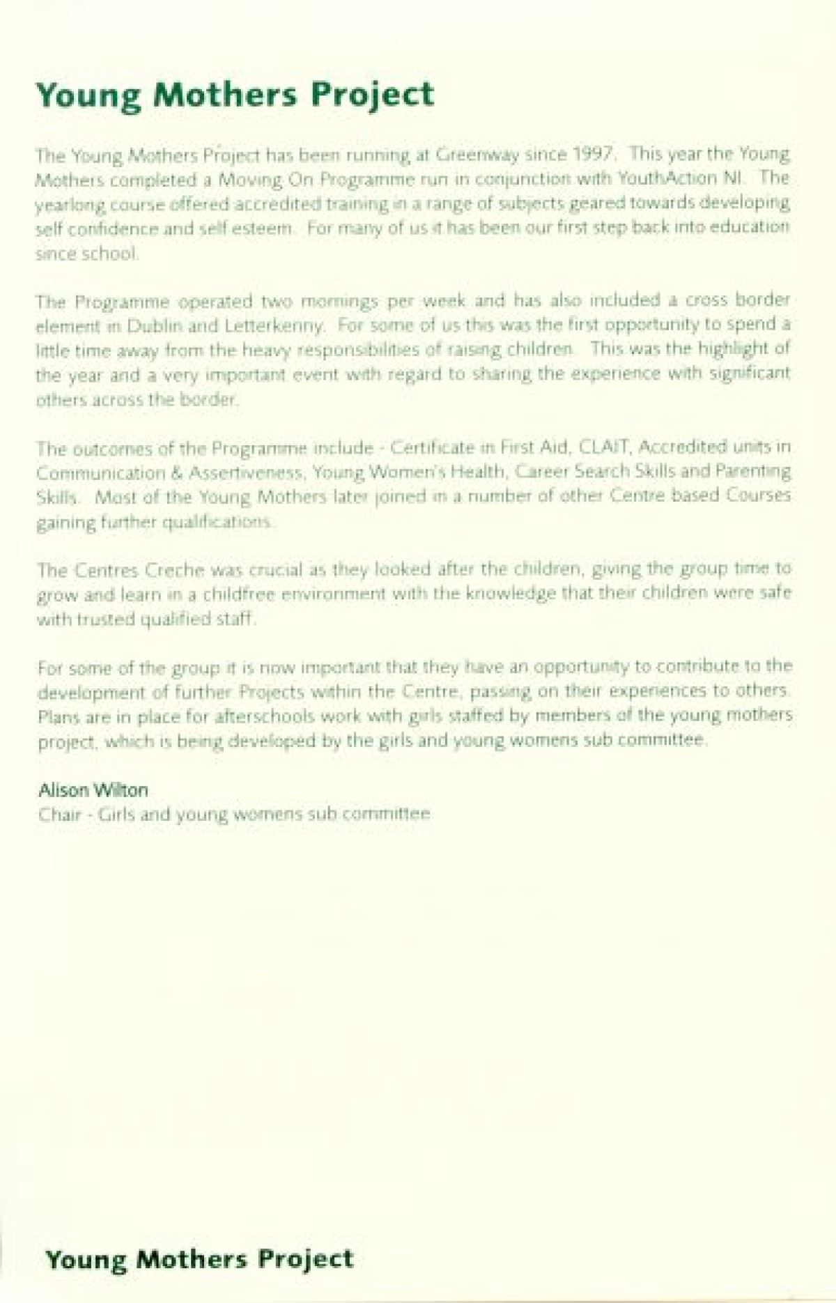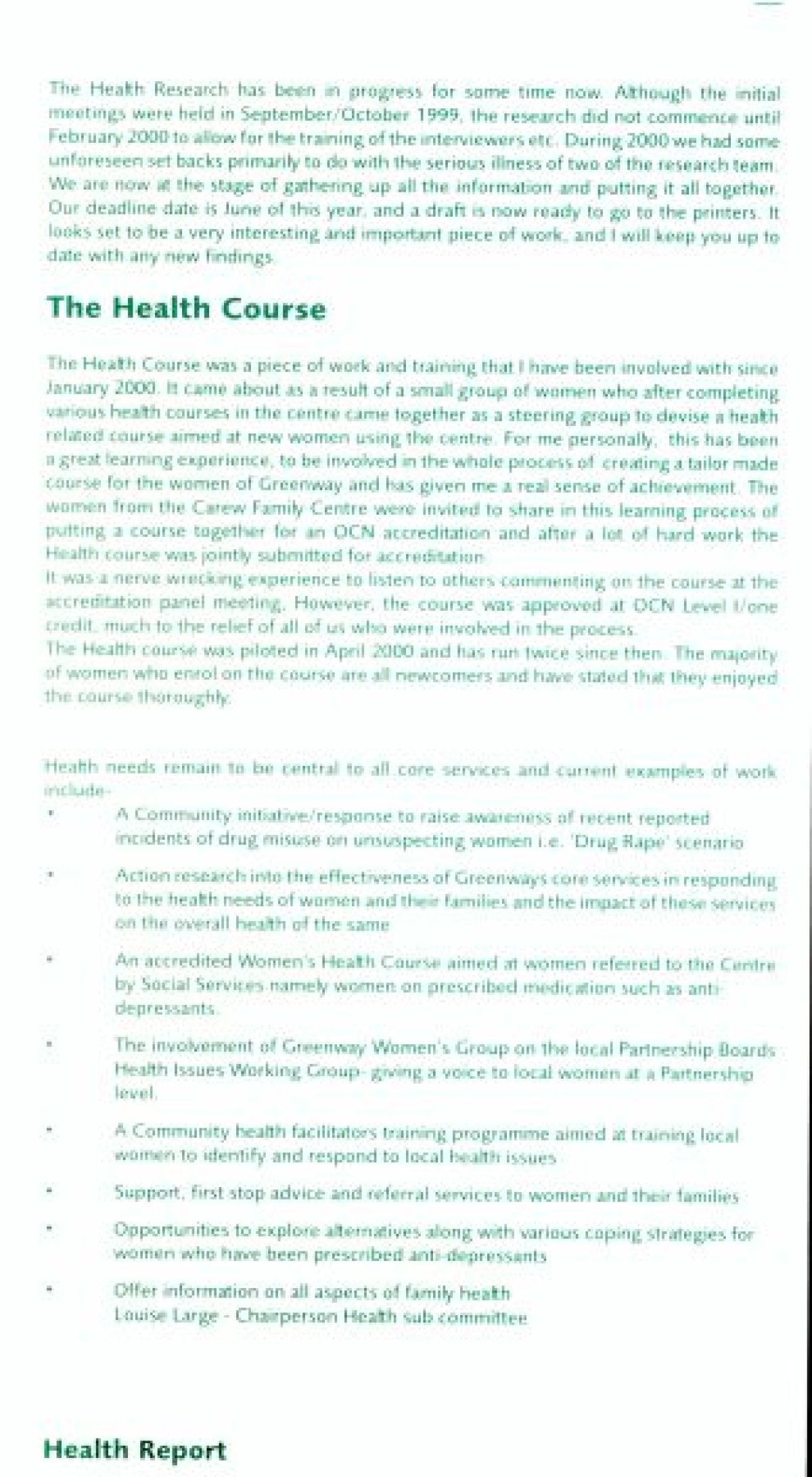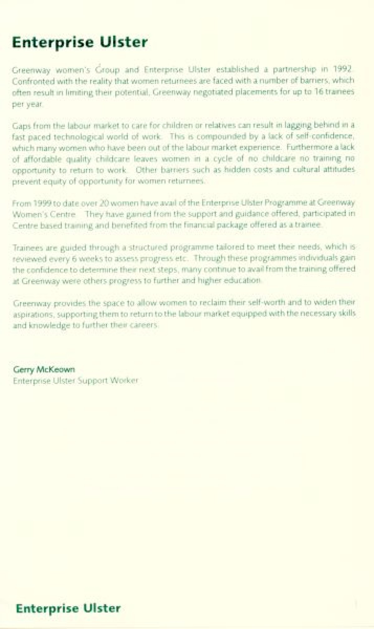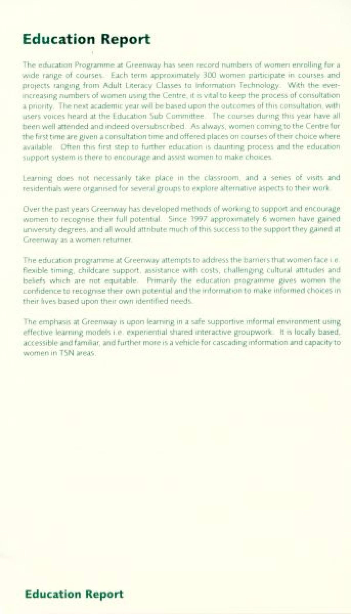 Greenway Women's Centre Annual Report, June 2001. Contents include a Mission Statement and Core Principles to develop, support and encourage women of all ages; Profile of the Greenway Women's Group and Centre; Chairperson's Report by Mae McQuillan; Director's Report by Jullie Murray; Treasurer's Report by Liz Oslon; Greenway's Volunteer Report by Volunteer Co-ordinator Lorna Parker; Greenway Childcare Report; Young Mothers' Project; Enterprise Ulster; Education Report; and the Health Course and Health Report. Also includes a list of events, funders and partners, and a map depicting the location of the centre.