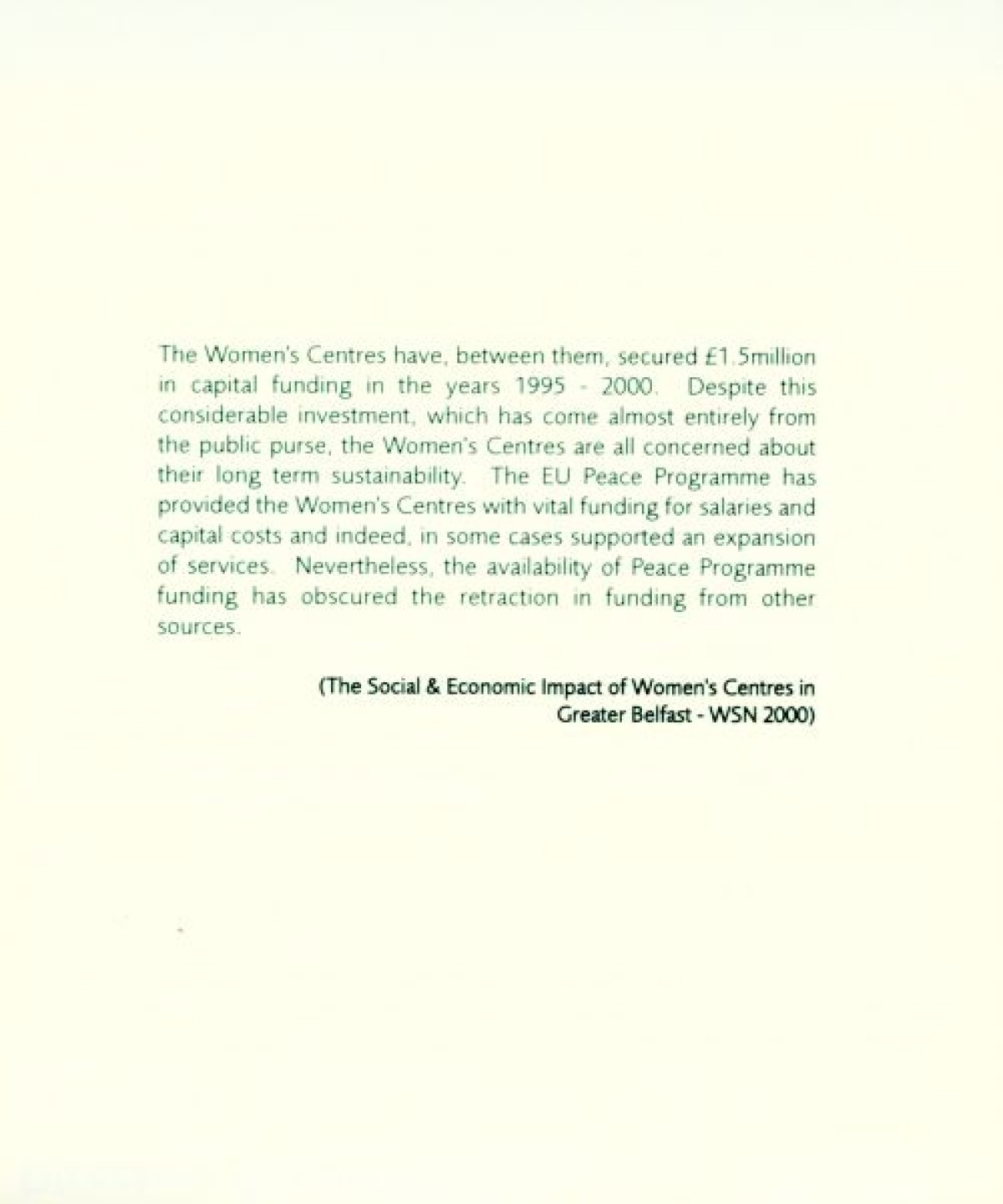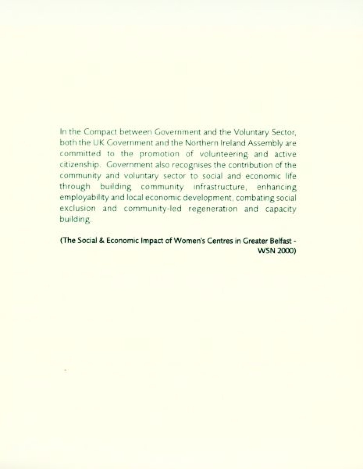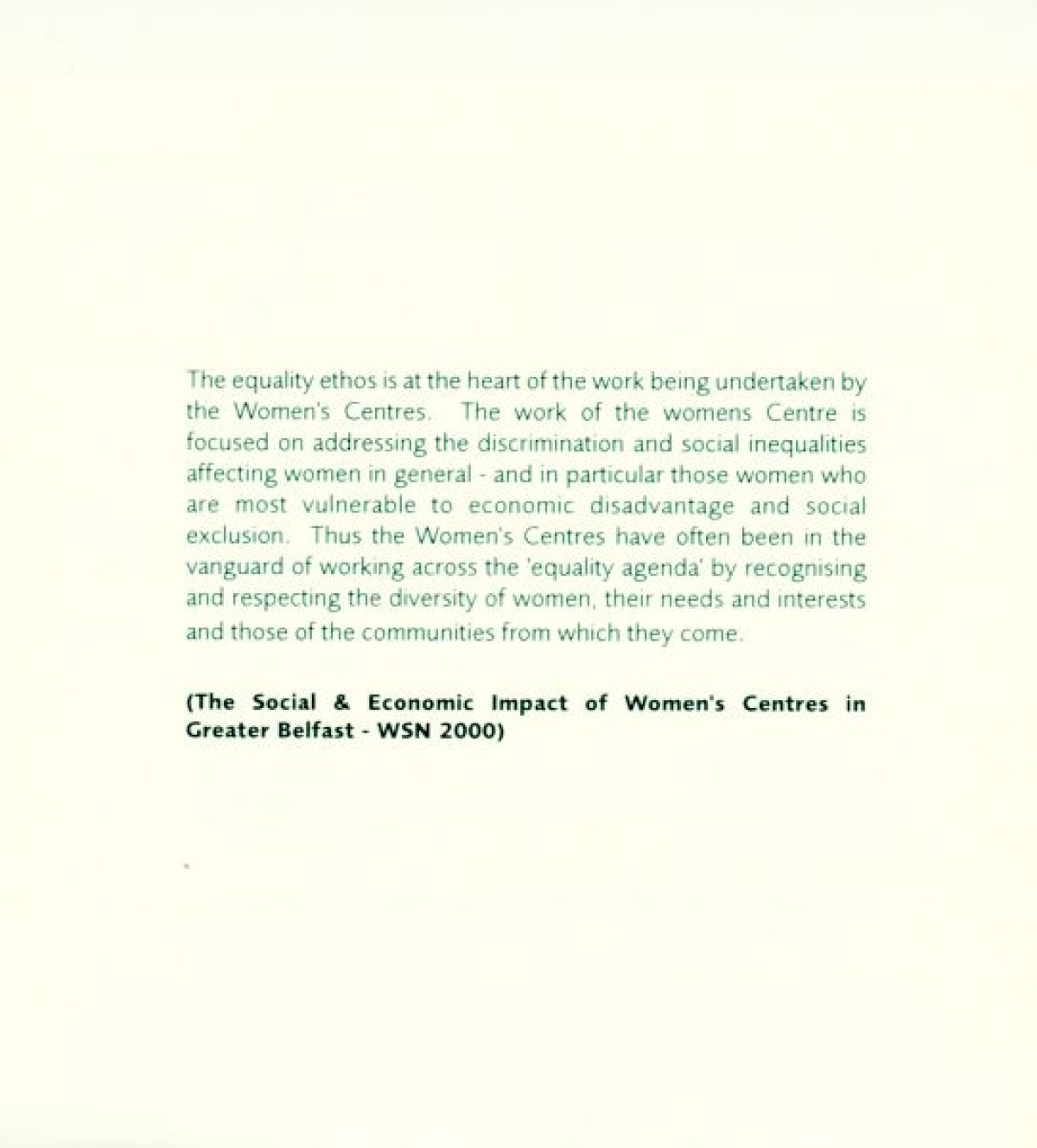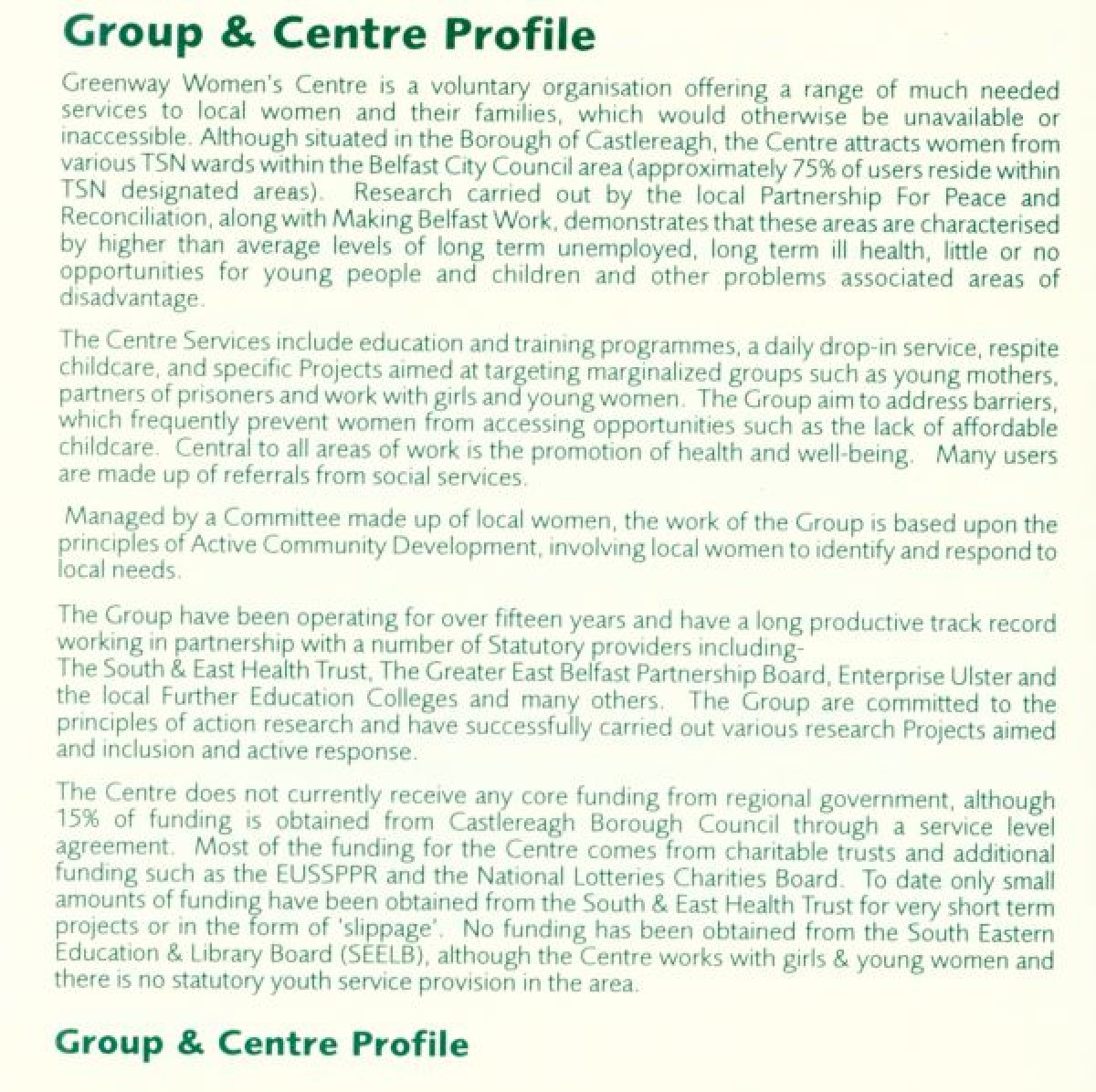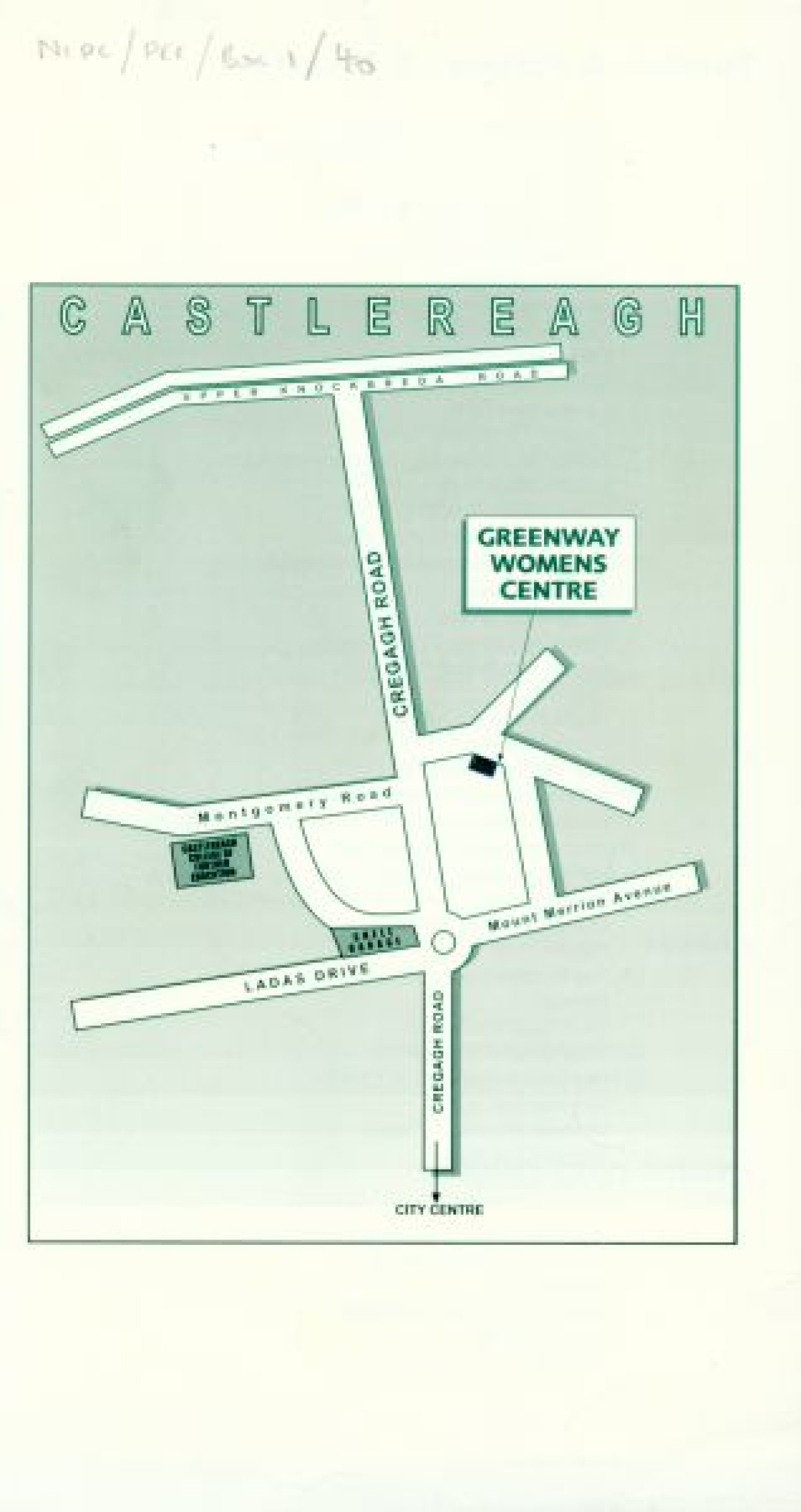 Greenway Women's Centre Annual Report, June 2001. Contents include a Mission Statement and Core Principles to develop, support and encourage women of all ages; Profile of the Greenway Women's Group and Centre; Chairperson's Report by Mae McQuillan; Director's Report by Jullie Murray; Treasurer's Report by Liz Oslon; Greenway's Volunteer Report by Volunteer Co-ordinator Lorna Parker; Greenway Childcare Report; Young Mothers' Project; Enterprise Ulster; Education Report; and the Health Course and Health Report. Also includes a list of events, funders and partners, and a map depicting the location of the centre.