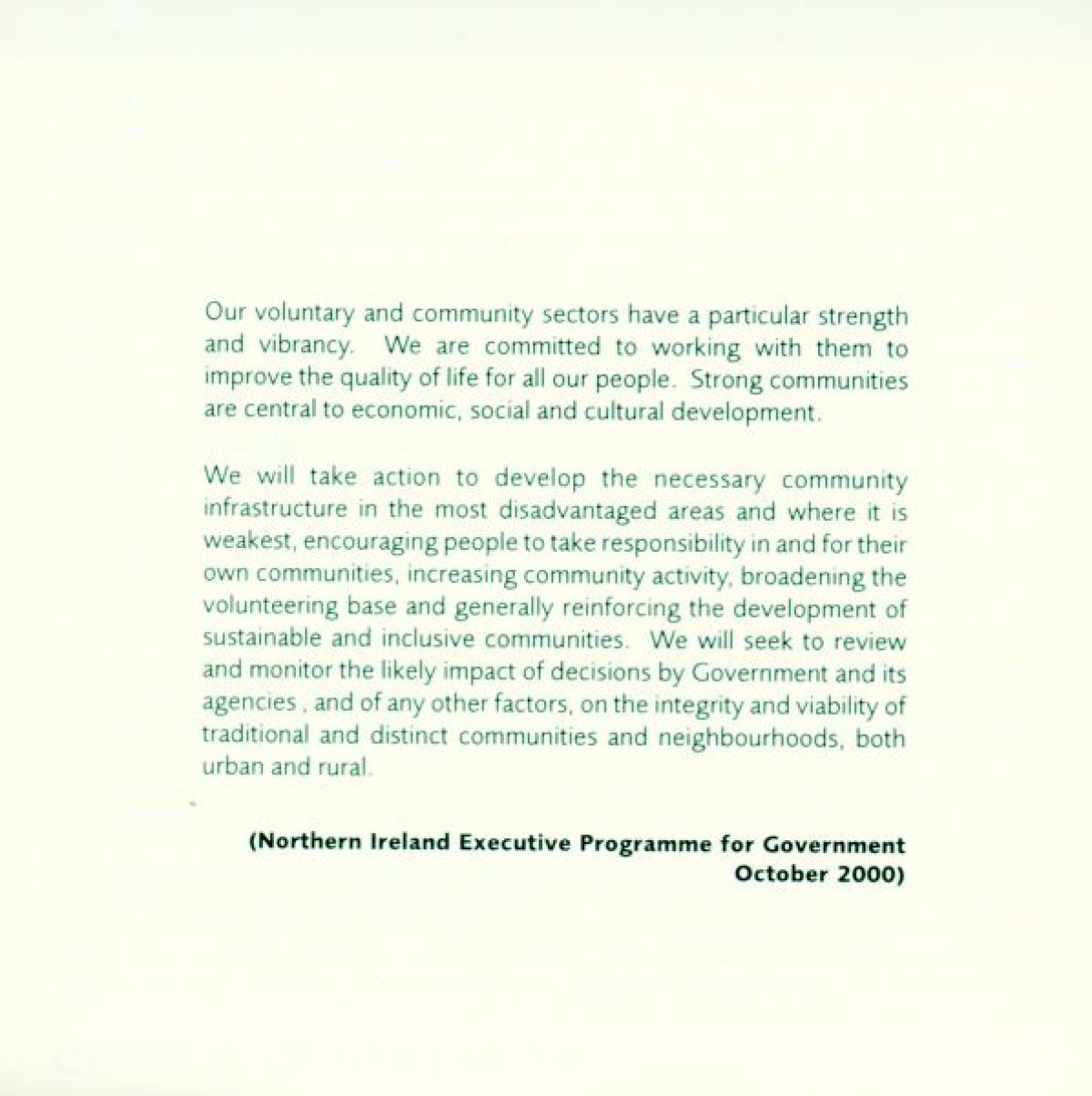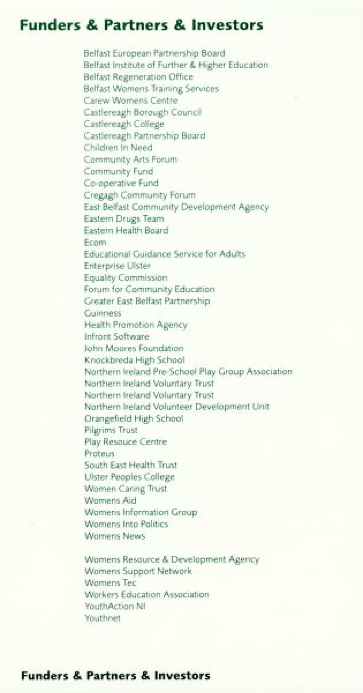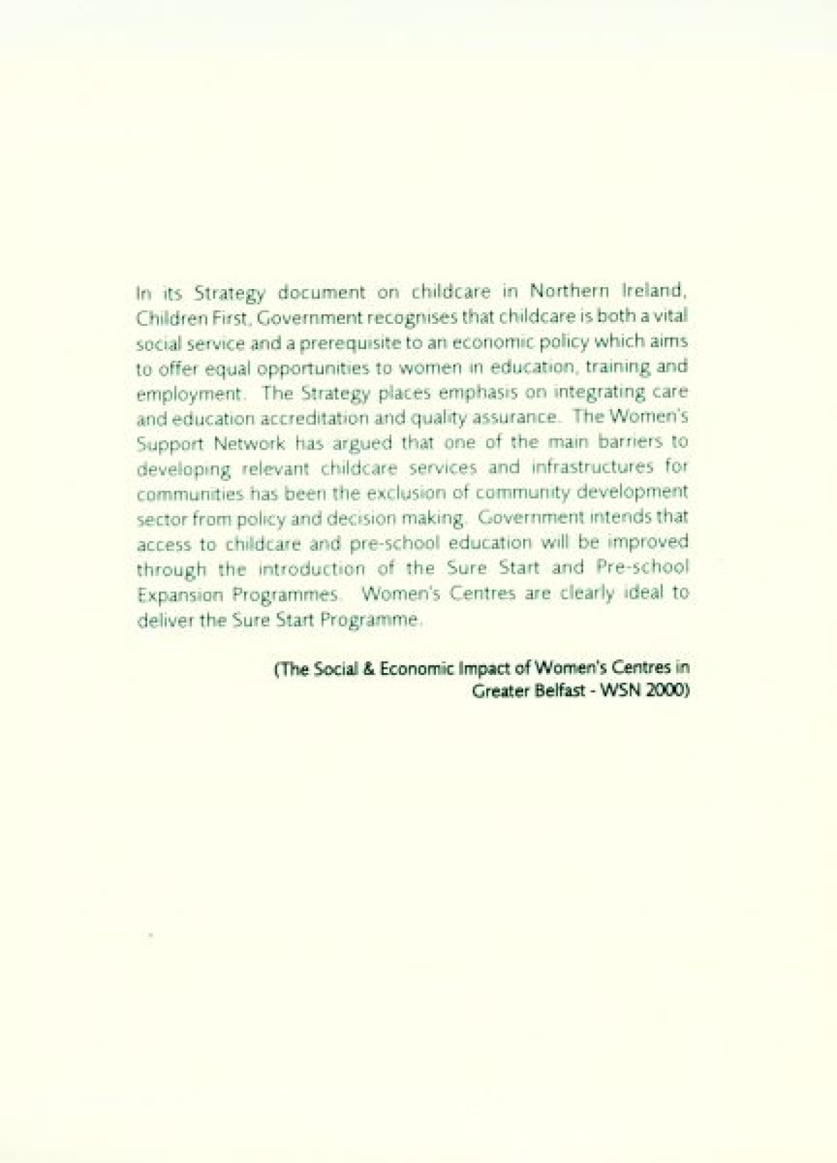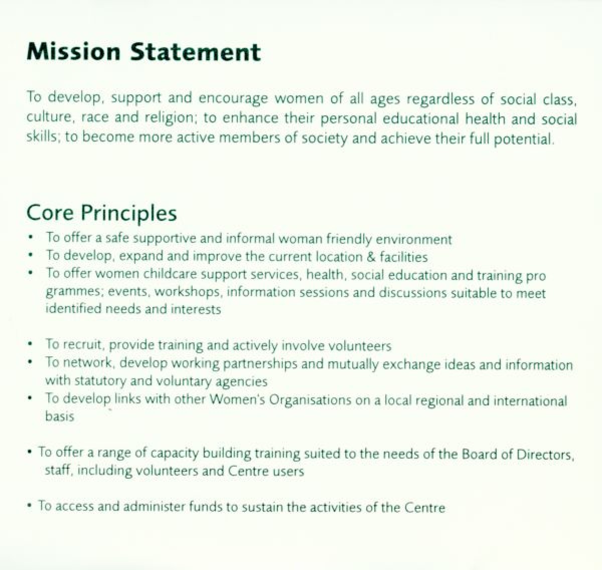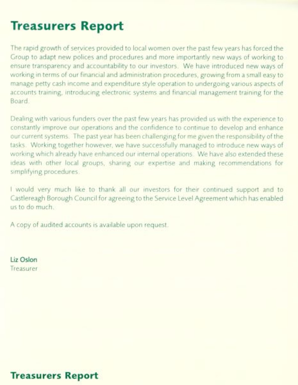 Greenway Women's Centre Annual Report, June 2001. Contents include a Mission Statement and Core Principles to develop, support and encourage women of all ages; Profile of the Greenway Women's Group and Centre; Chairperson's Report by Mae McQuillan; Director's Report by Jullie Murray; Treasurer's Report by Liz Oslon; Greenway's Volunteer Report by Volunteer Co-ordinator Lorna Parker; Greenway Childcare Report; Young Mothers' Project; Enterprise Ulster; Education Report; and the Health Course and Health Report. Also includes a list of events, funders and partners, and a map depicting the location of the centre.