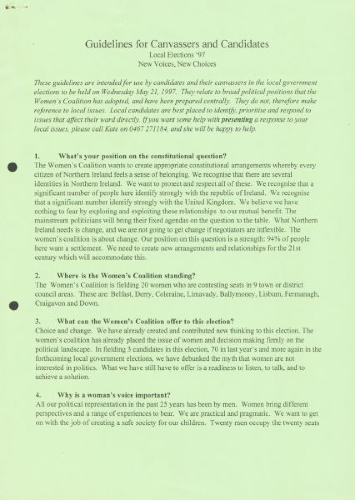 A document issued by the Northern Ireland Women's Coalition titled 'Guidelines for Canvassers and Candidates - Local Elections '97.' Features a selection of questions and answers to aid canvassers and candidates during the 1997 local government election campaign trail. Also includes the party's stance on issues such as decommissioning, policing, marching, and abortion.