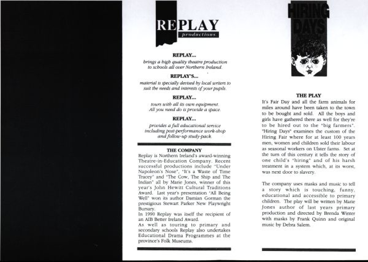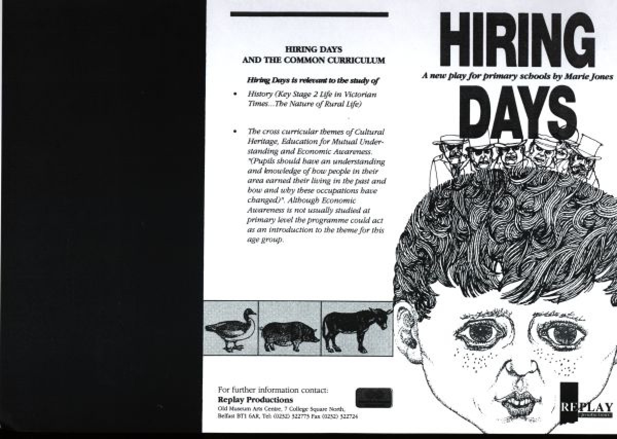 Photocopy of leaflet for "Hiring Days," an educational play written by Marie Jones to introduce cross-curricular themes of cultural heritage, mutual understanding and economic awareness to primary children. Produced by Replay Theatre Company at the Old Museum Arts Centre. Directed by Brenda Winter. See also: TPA/REP/BOX4(6)