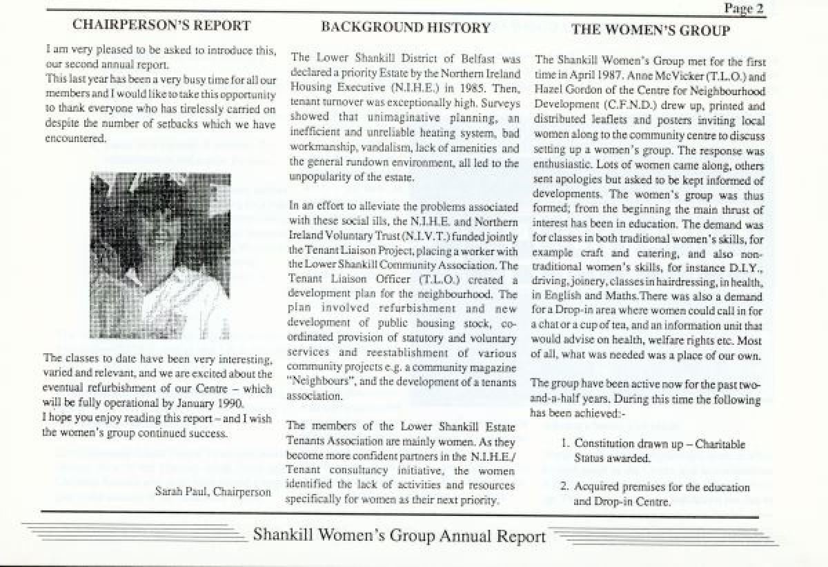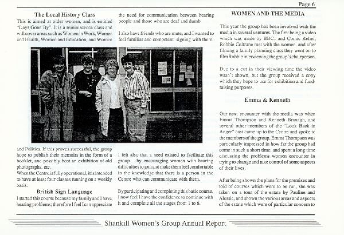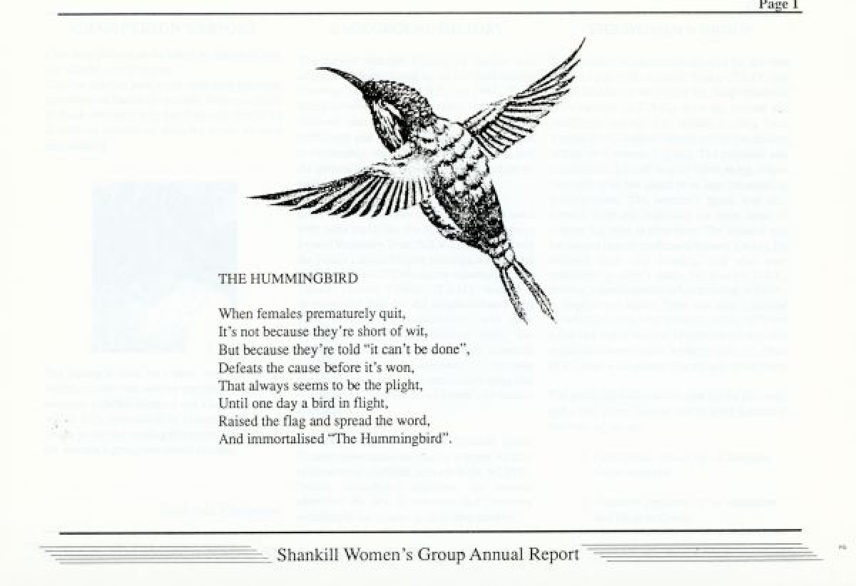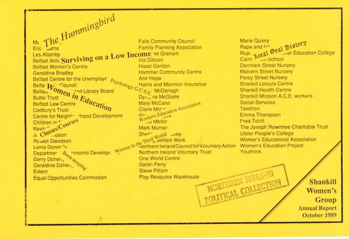 Booklet containing Shankill Women's Group Annual Report, October 1989. Features a poem titled "The Hummingbird"; Chairperson's report by Sarah Paul; and information including background history to the women's group and priorities for the future development of the Hummingbird Centre. Discusses women's courses and media engagement, including a visit to the centre from Kenneth Branagh and Emma Thompson.