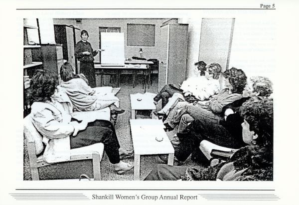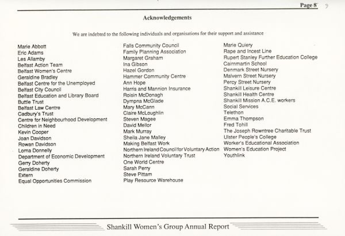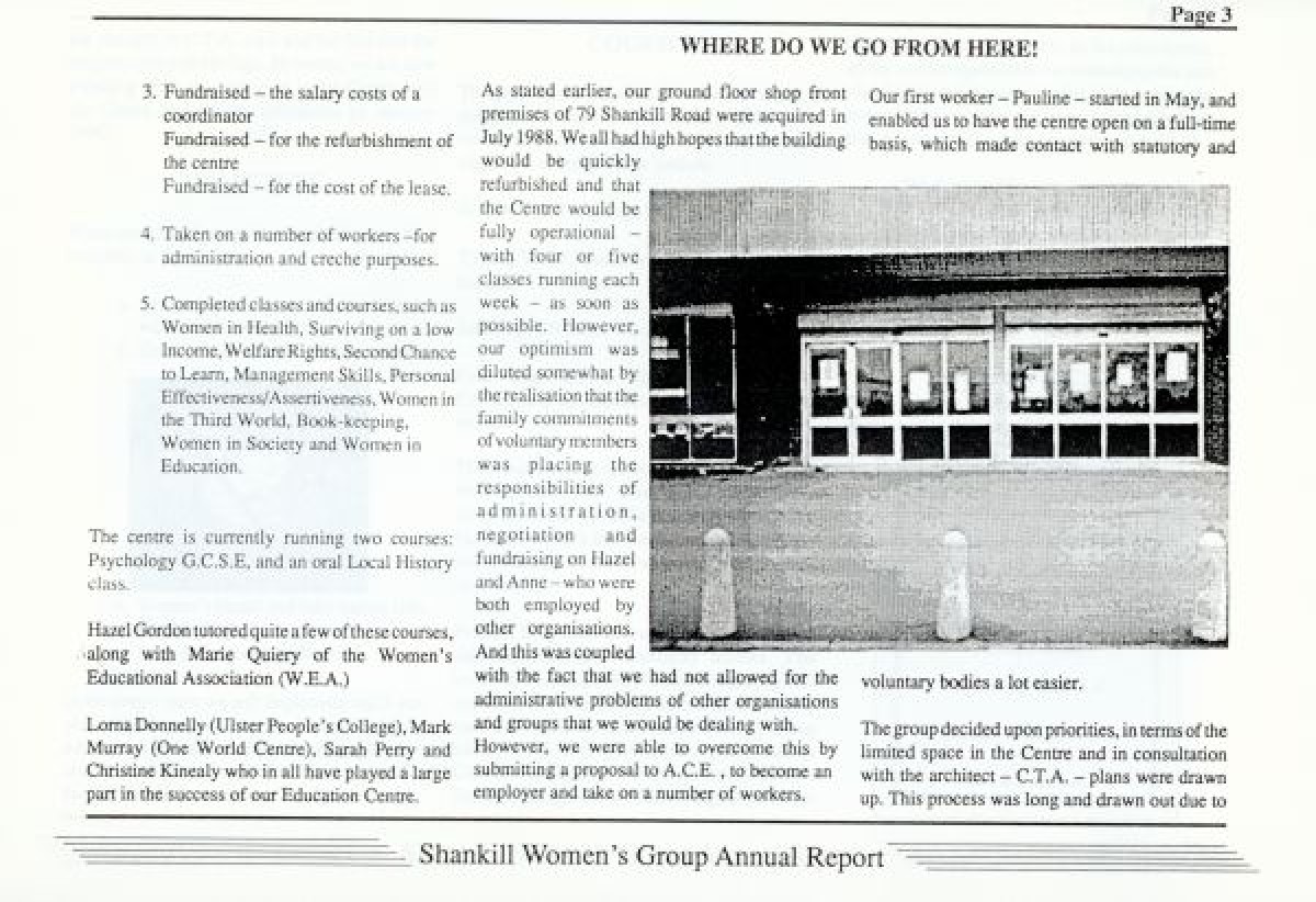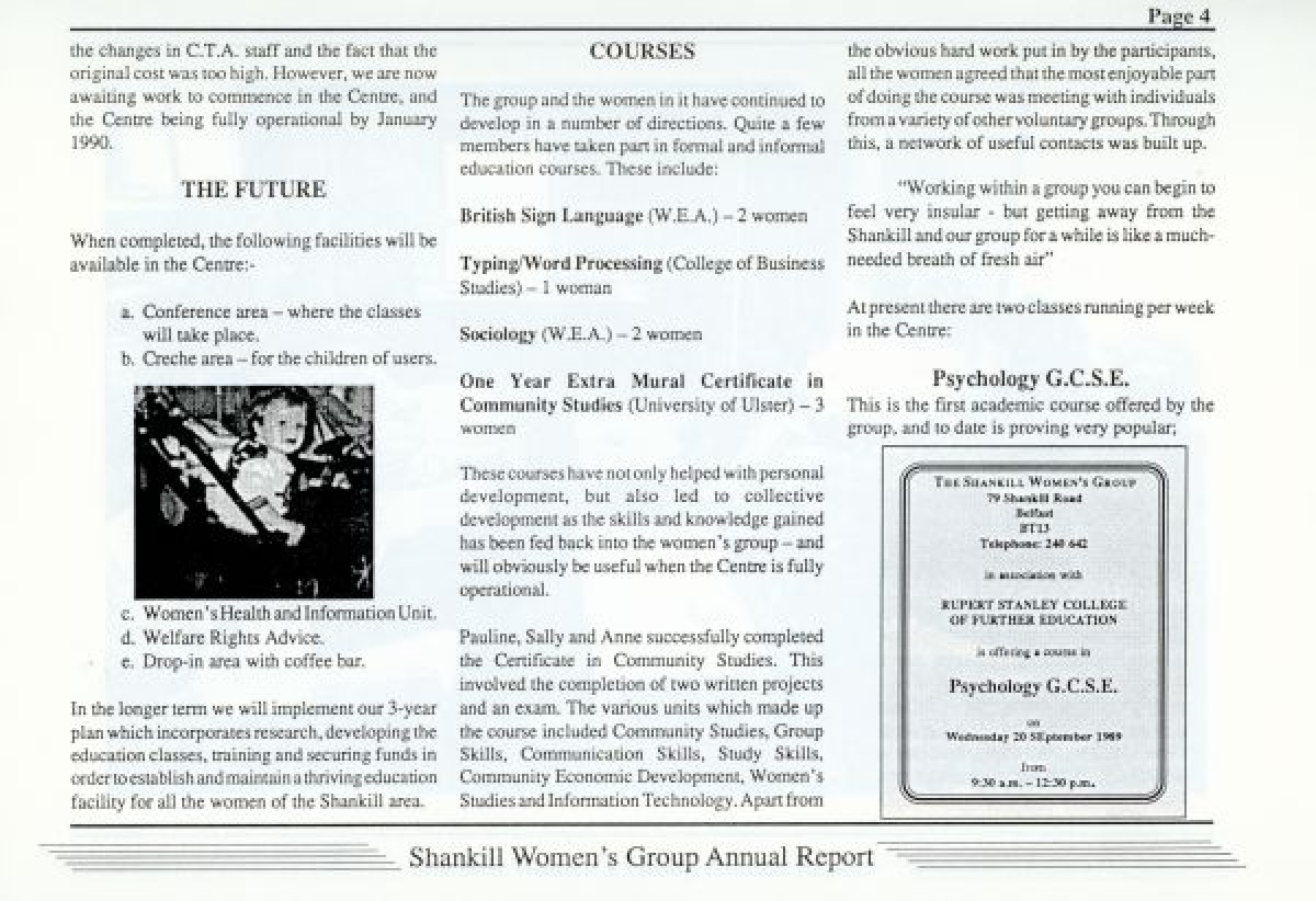 Booklet containing Shankill Women's Group Annual Report, October 1989. Features a poem titled "The Hummingbird"; Chairperson's report by Sarah Paul; and information including background history to the women's group and priorities for the future development of the Hummingbird Centre. Discusses women's courses and media engagement, including a visit to the centre from Kenneth Branagh and Emma Thompson.