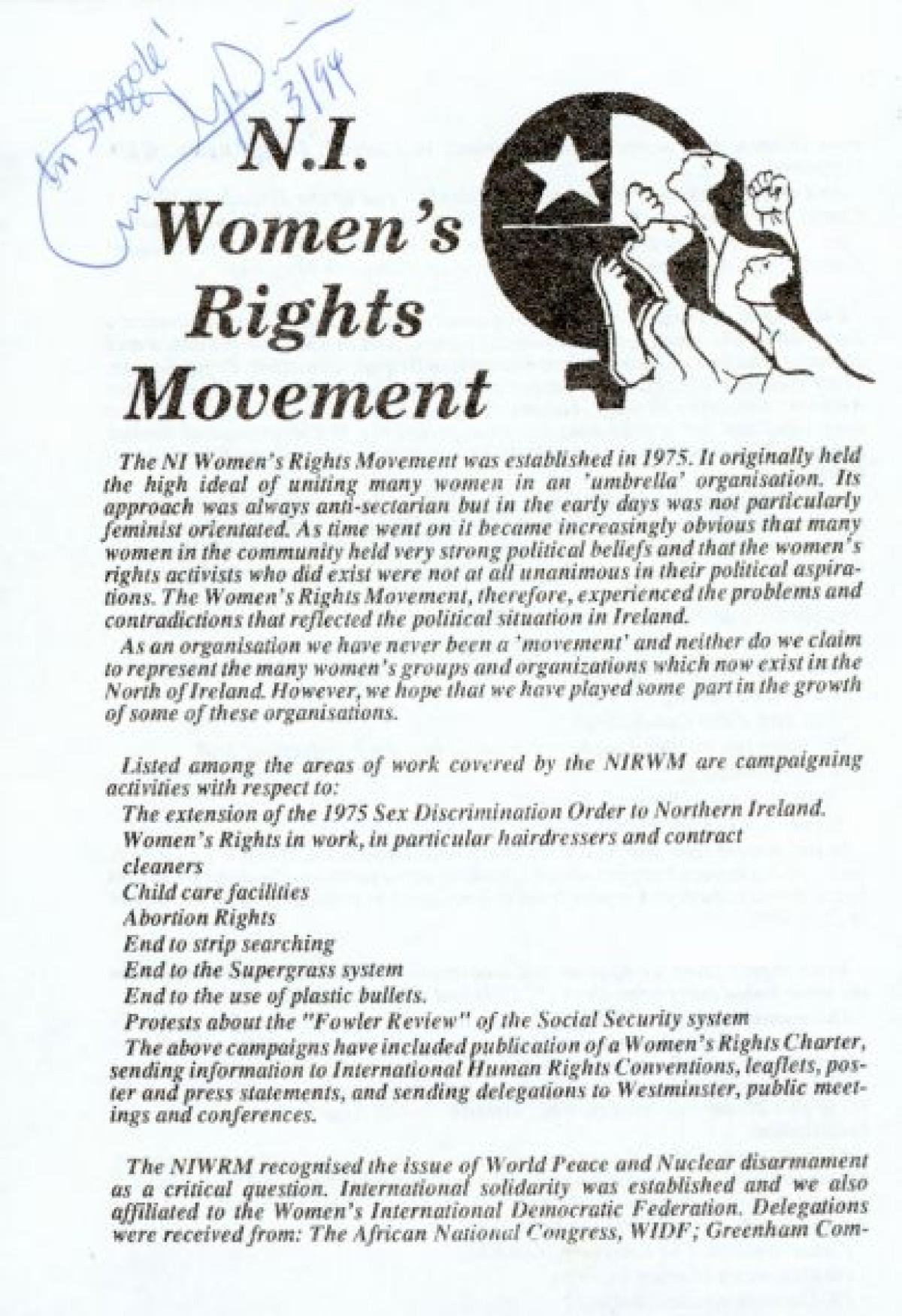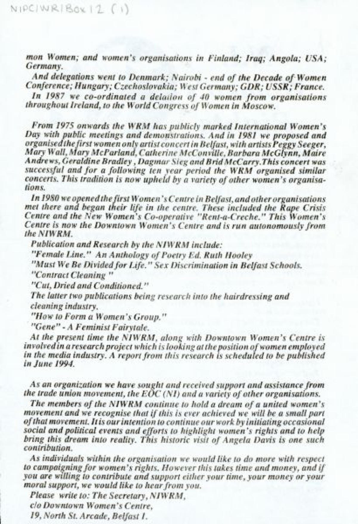 Northern Ireland Women's Rights Movement, titled 'In Struggle, 3/94.' Signed by Angela Davis. The leaflet outlines background information of the Movement and the campaigning activities and areas of work the organisation is involved in.