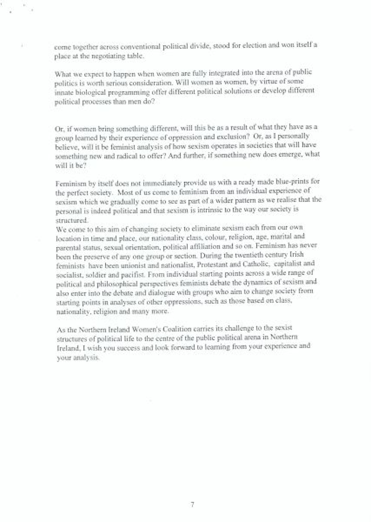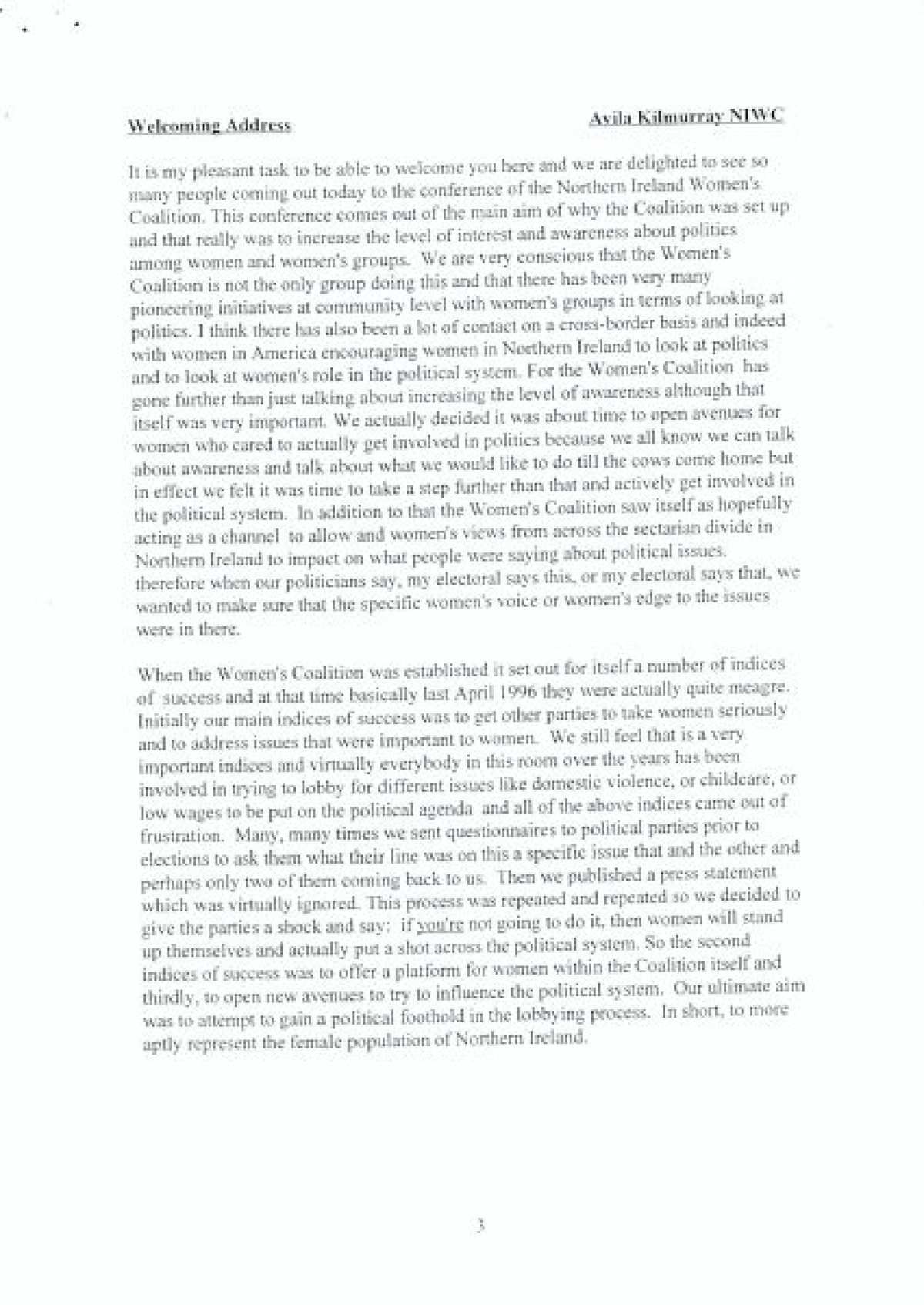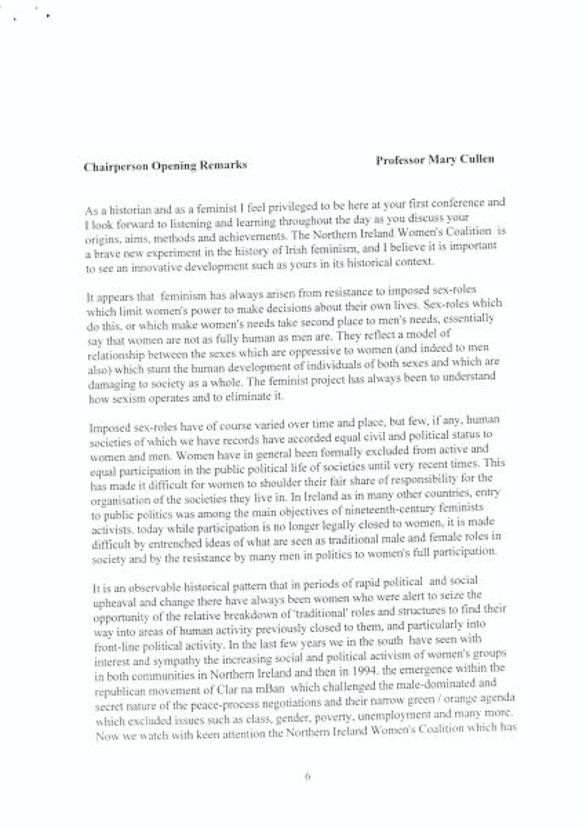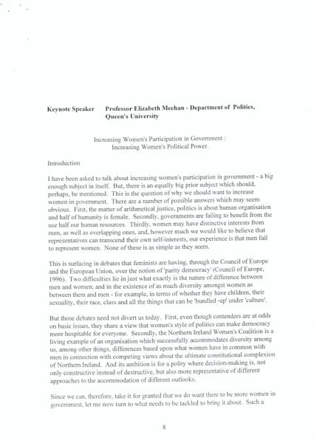 Northern Ireland Women's Coalition Consultative Conference, 'Increasing Women's Political Participation and Influencing Decision Making: Learning and Sharing Experience' by keynote speaker Professor Elizabeth Meehan of Queen's University, Belfast. Includes opening remarks by Avila Kilmurray and Professor Mary Cullen.