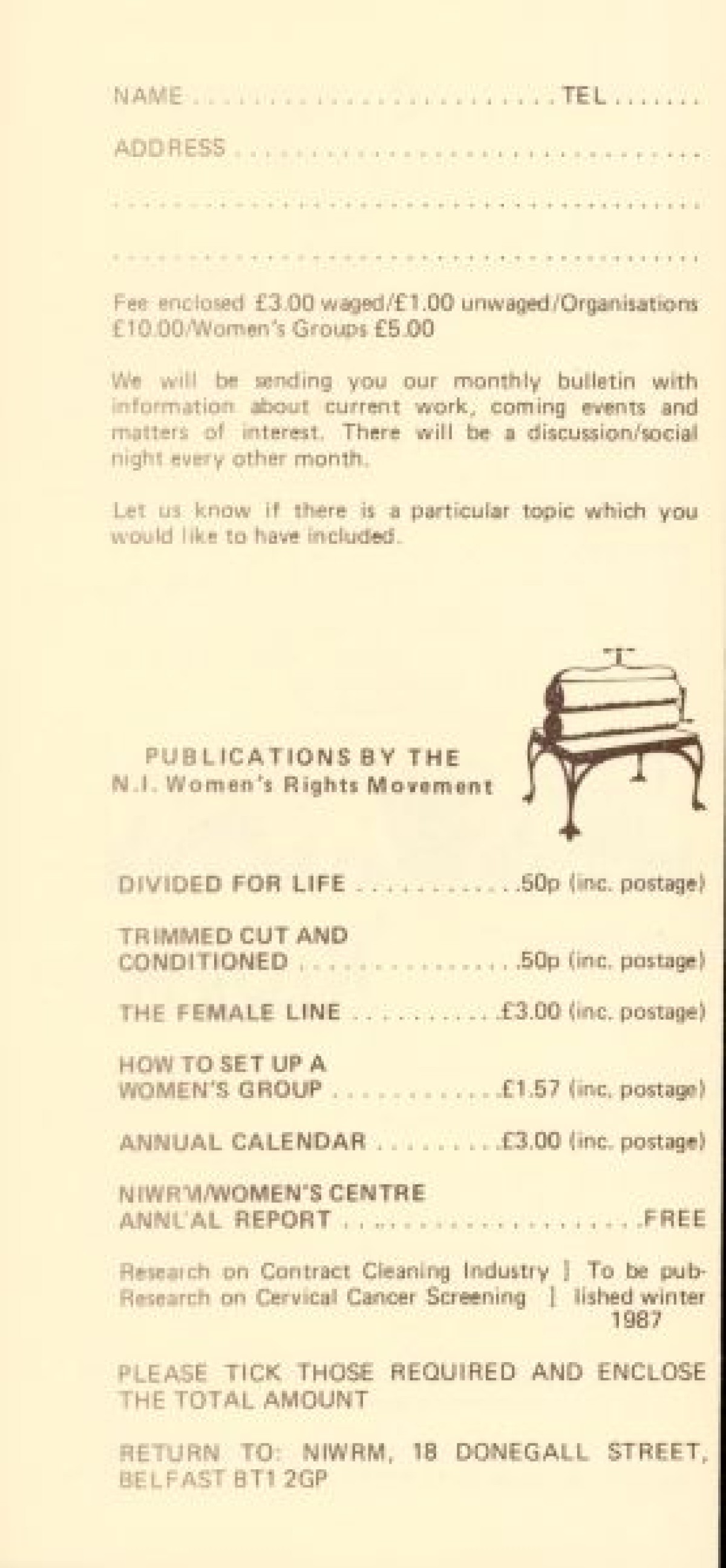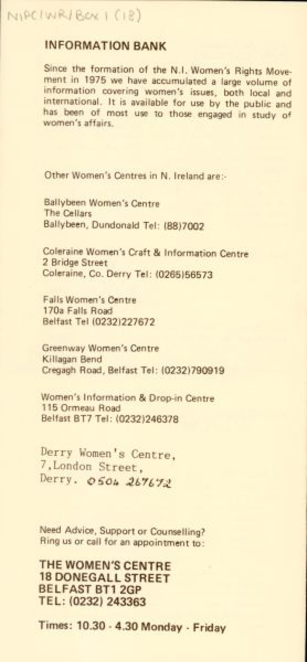 Northern Ireland Women's Rights Movement c1985-89. Provides background information on its outreach activities and campaigns, advice on how to get involved and contact details for other women's centres across Northern Ireland.