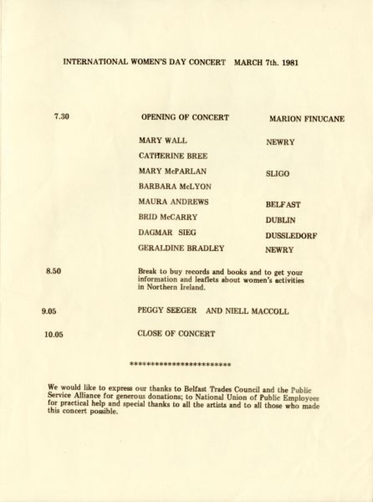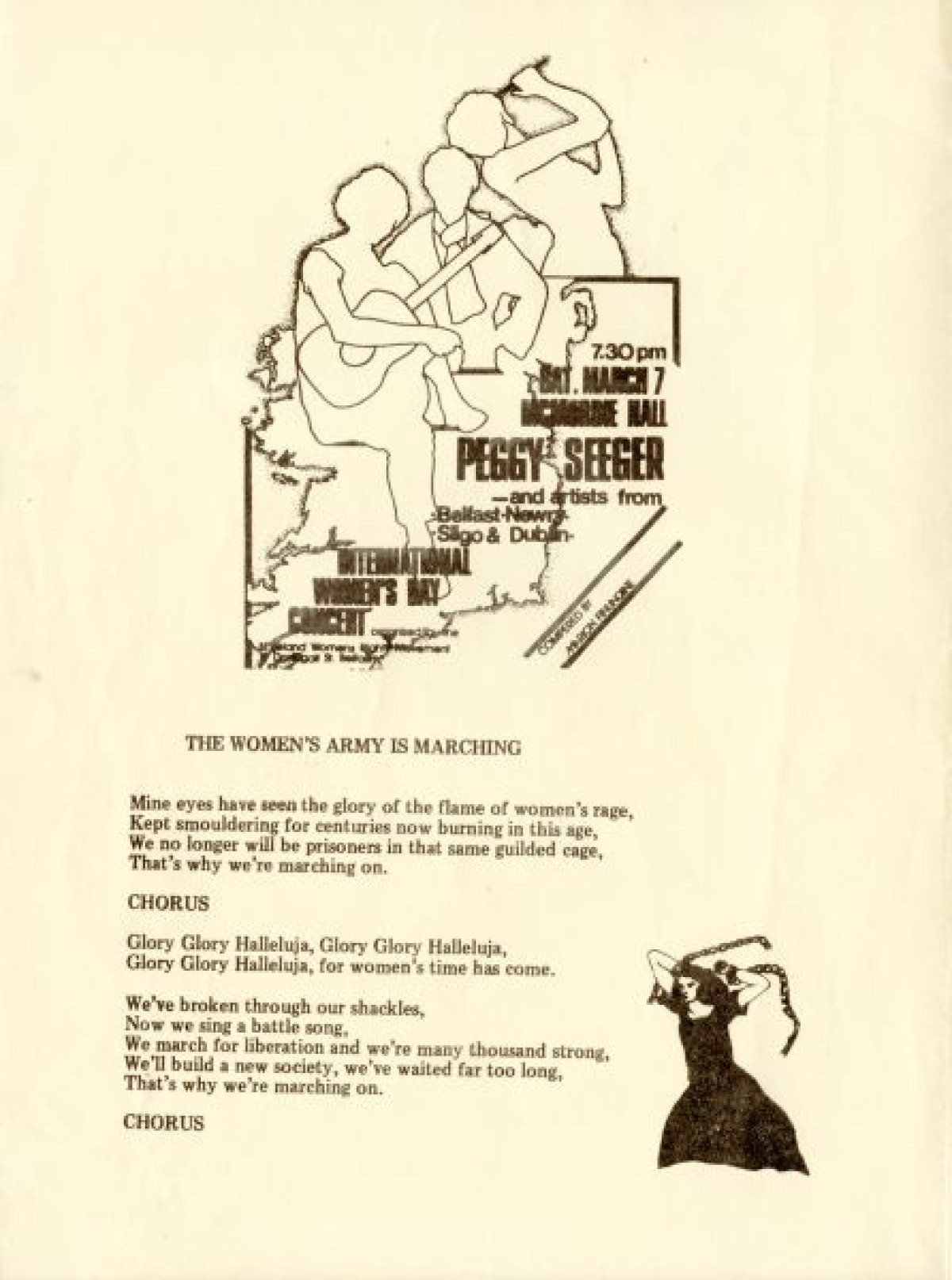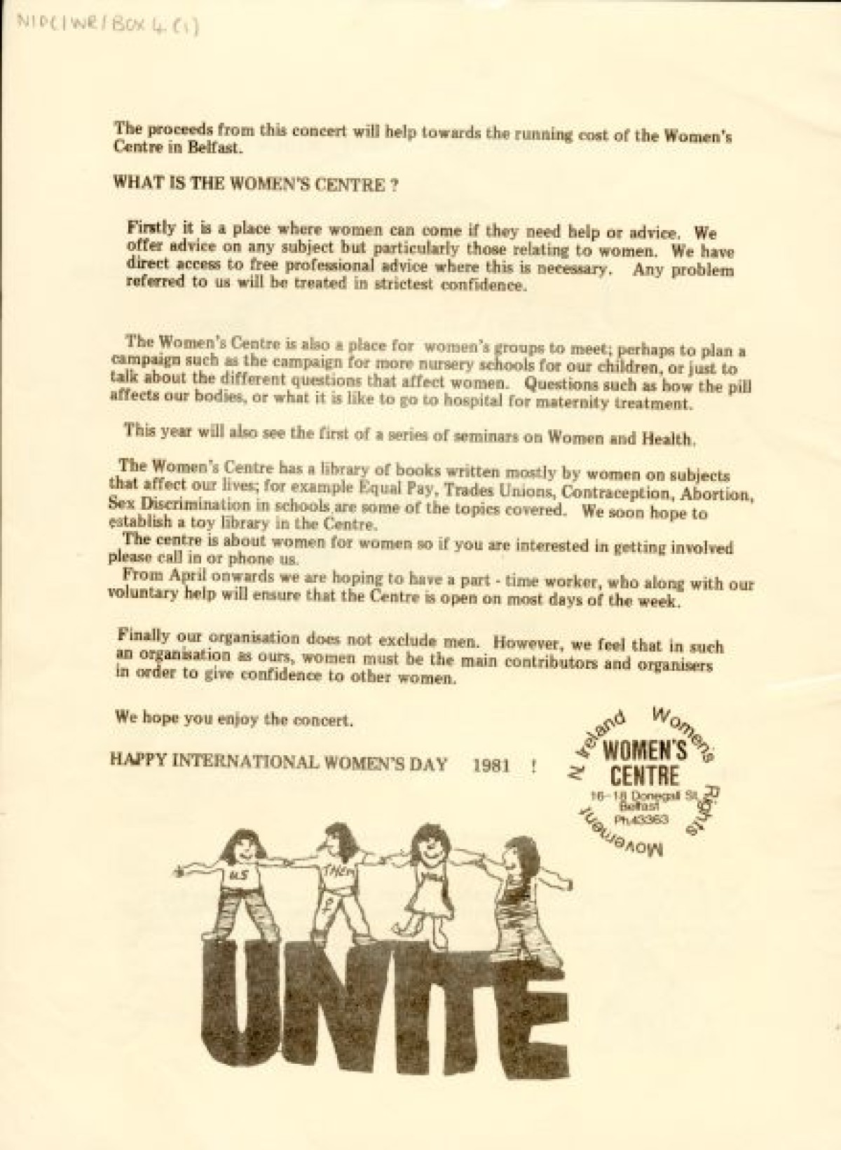 Programme for International Women's Day Concert 1981, including lyrics for 'The women's army is marching', and details of concert by Peggy Seeger. Also contains information on the Women's Centre in Belfast. Organised by the