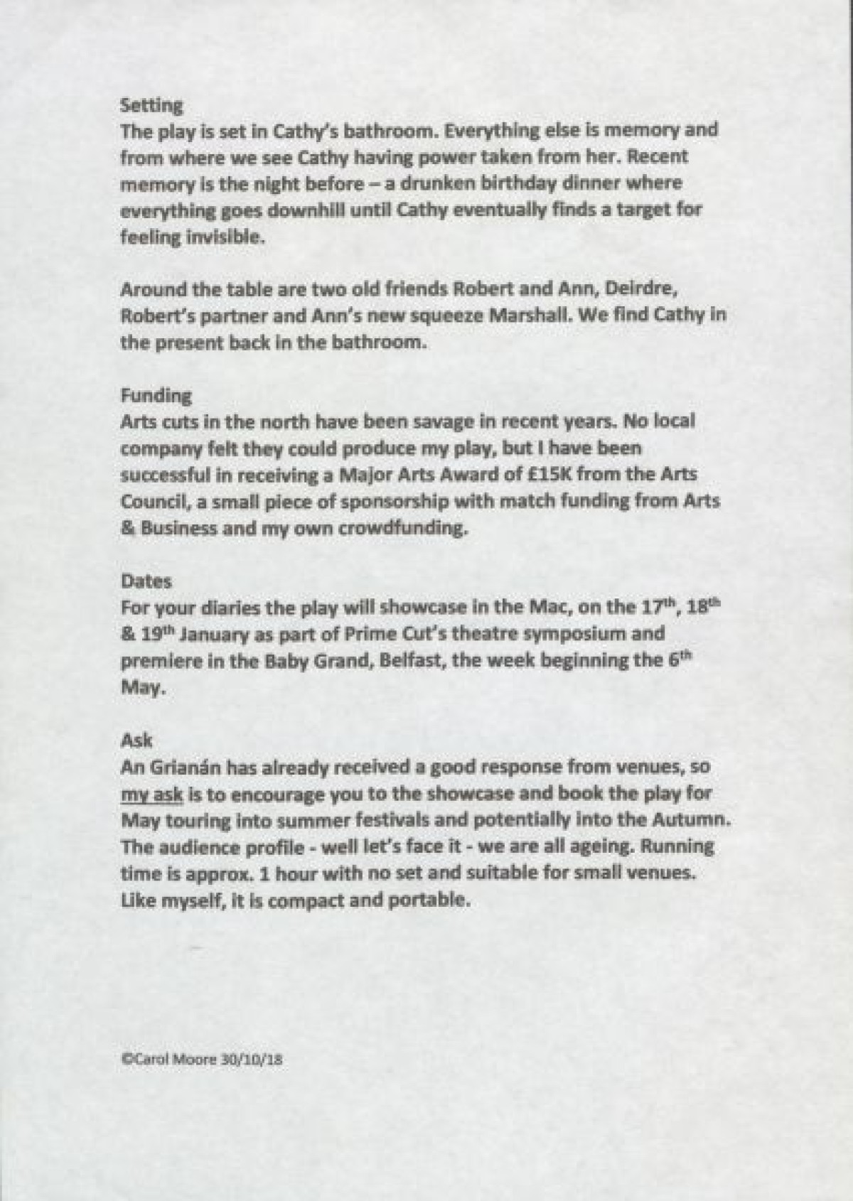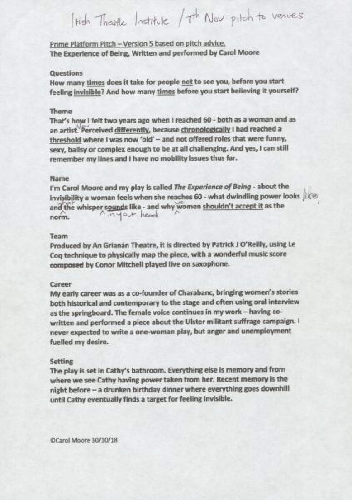 Version 5 of a pitch to venues for "The Experience of Being," a one-woman play written and performed by Carol Moore. The pitch contains questions about older women's experiences and feelings of invisibility; the theme of the play; an introduction to Carol Moore; the production team; an outline of Carol Moore's career experience; setting; funding details; and dates. Contains some handwritten annotations from the author.