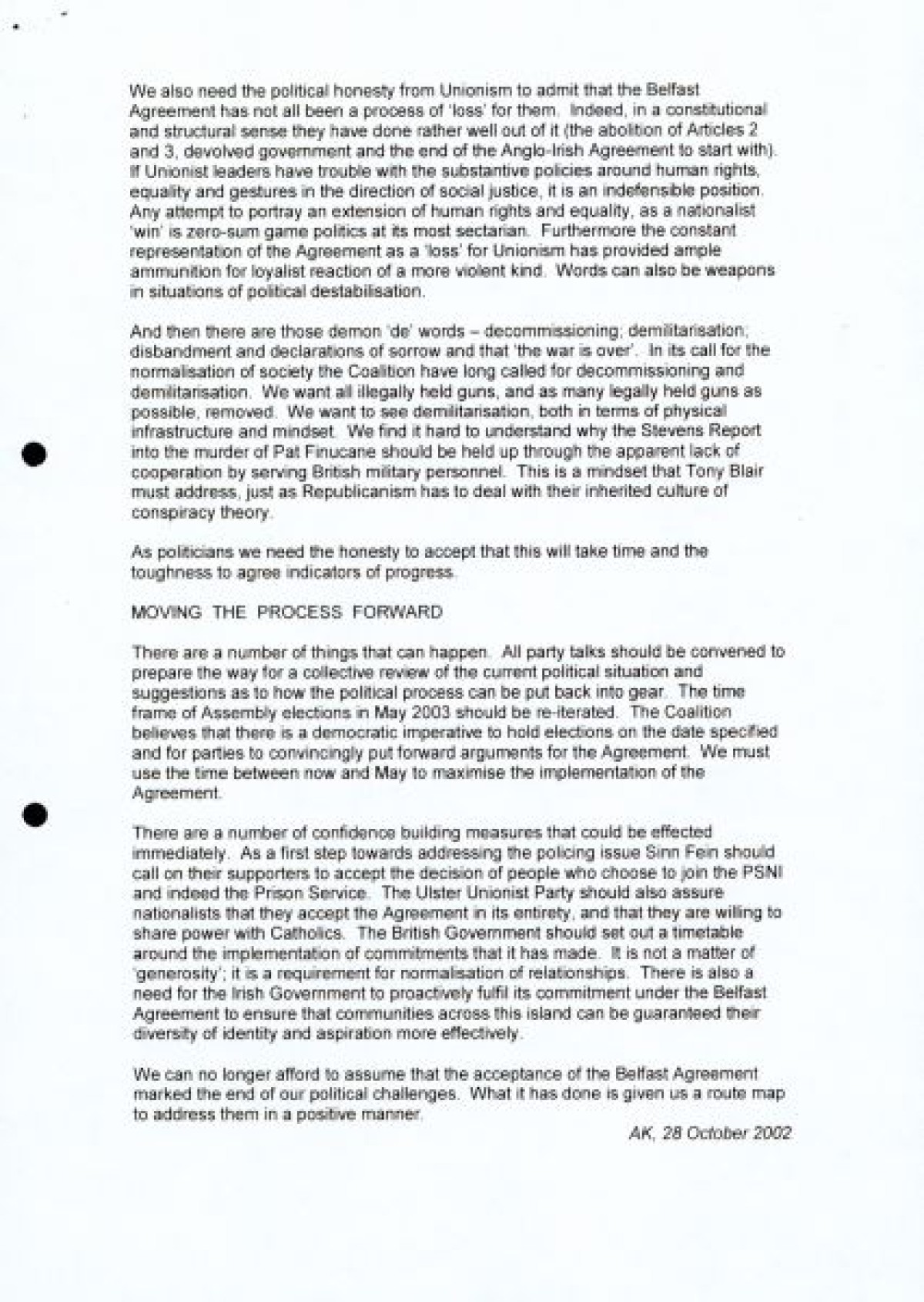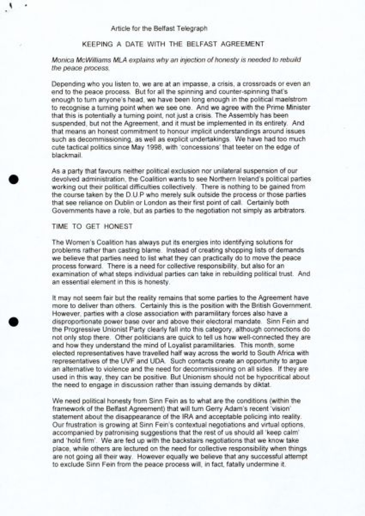 Belfast Telegraph including statements by Monica McWilliams of the Women's Coalition on how the peace process can continue to move forward.