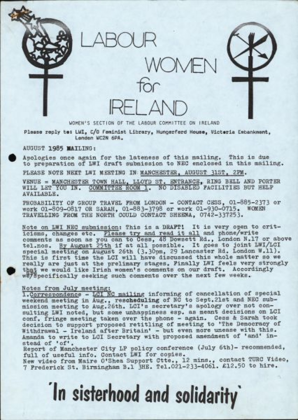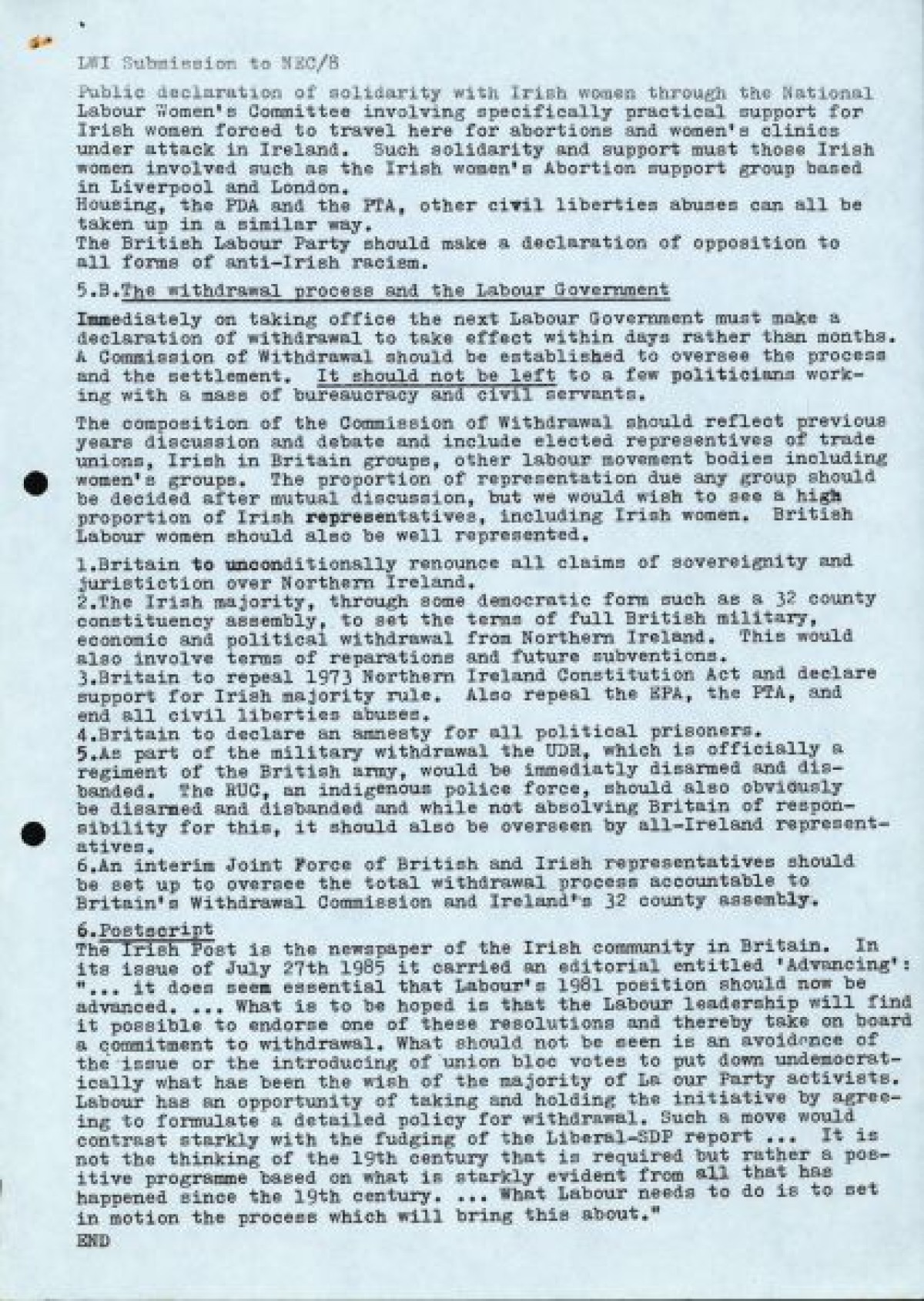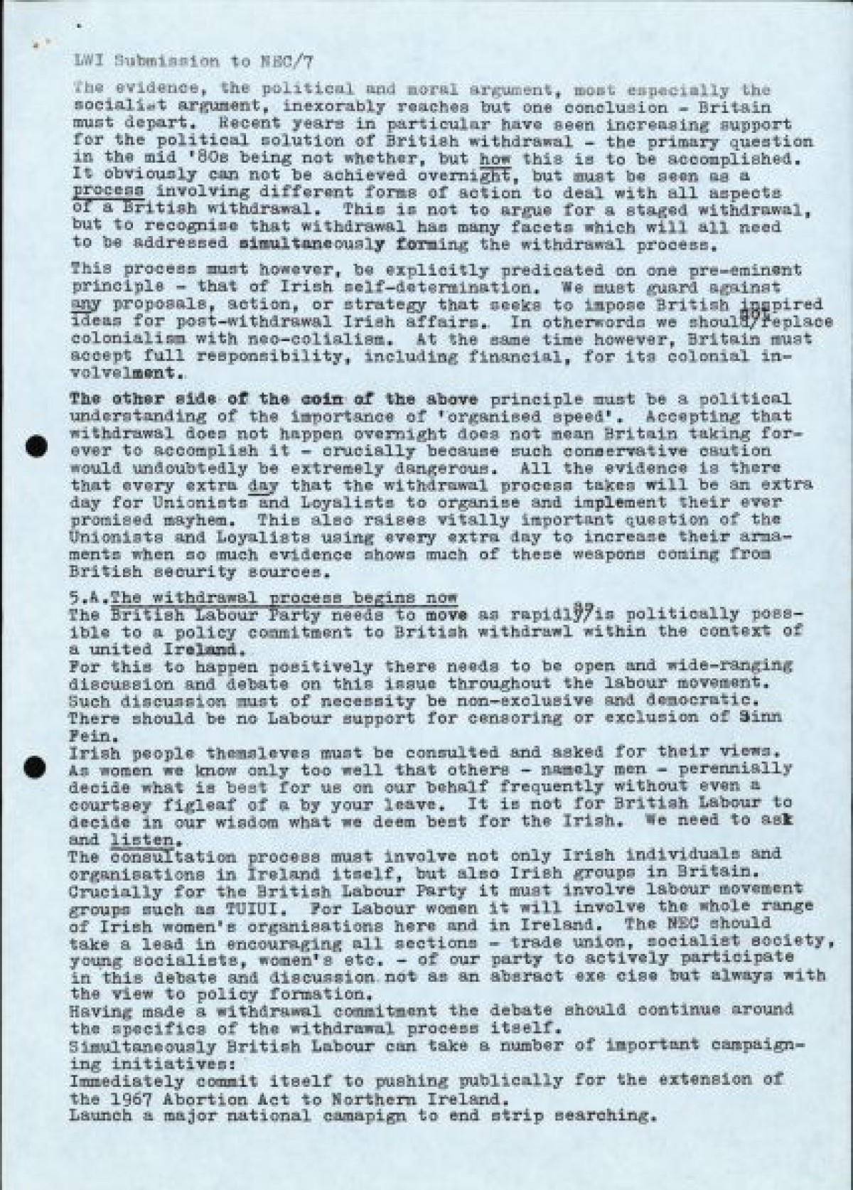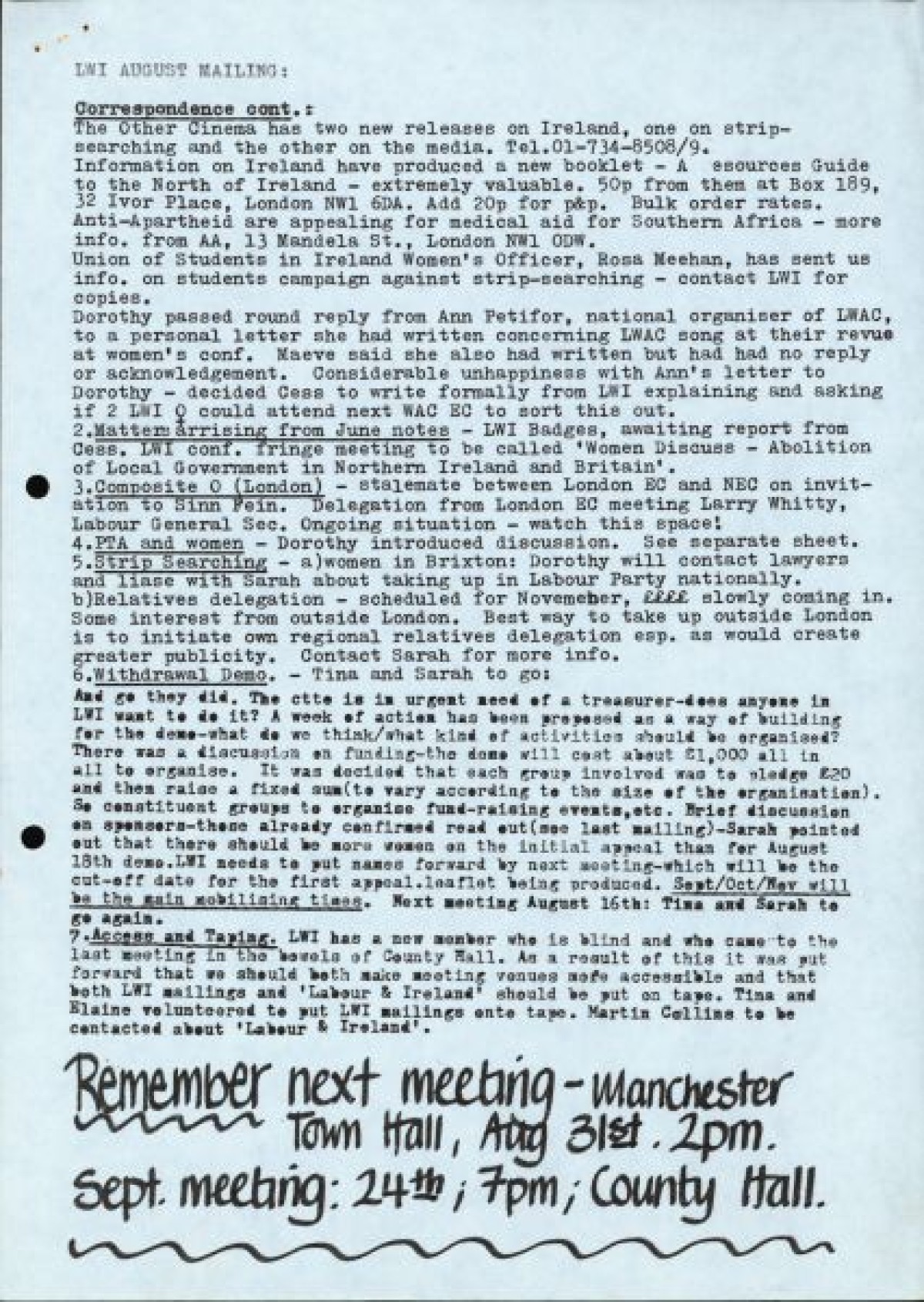 Labour Committee on Ireland, Women's Section. Contains notes from a July meeting, correspondences with groups including South Africa Anti-Apartheid group, Strip-searching in Armagh prisons, Demonstration for British Withdrawal from Ireland, Prevention of Terrorism Act, and a Draft submission regarding British Withdrawal from Ireland, presented to the National Executive Committee Working Party on Ireland.