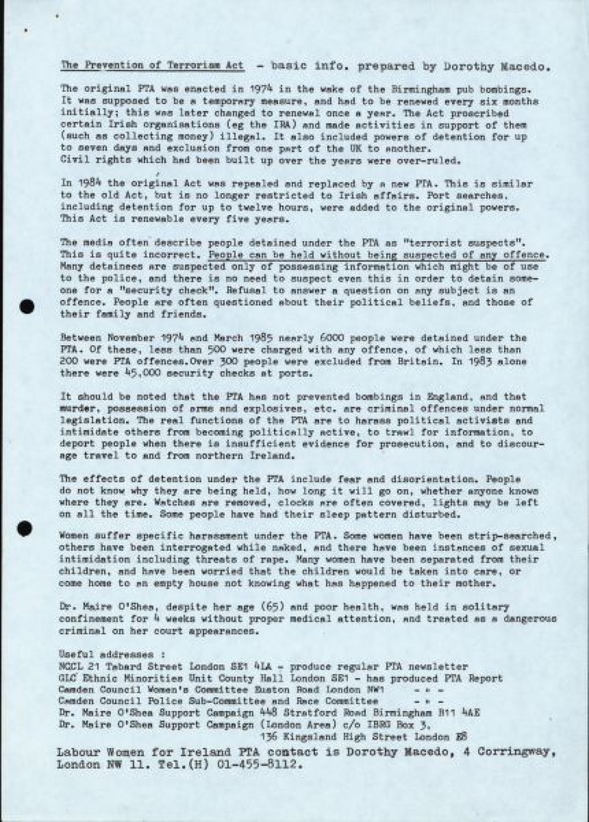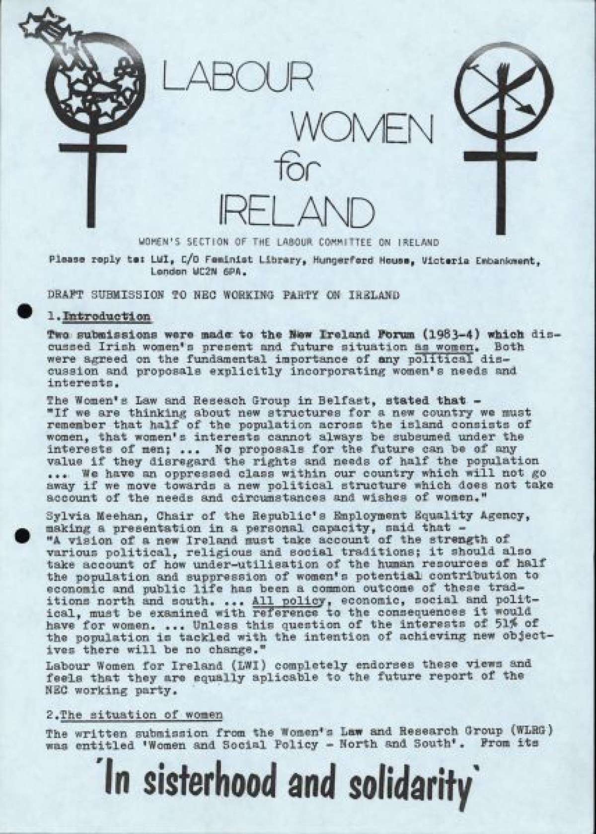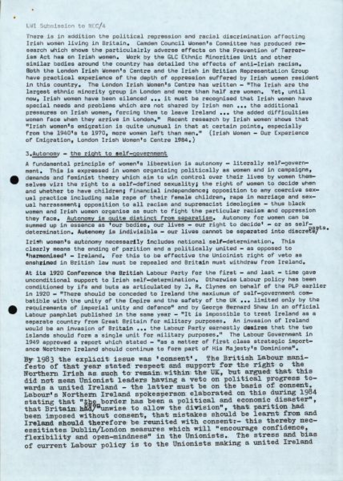 Labour Committee on Ireland, Women's Section. Contains notes from a July meeting, correspondences with groups including South Africa Anti-Apartheid group, Strip-searching in Armagh prisons, Demonstration for British Withdrawal from Ireland, Prevention of Terrorism Act, and a Draft submission regarding British Withdrawal from Ireland, presented to the National Executive Committee Working Party on Ireland.