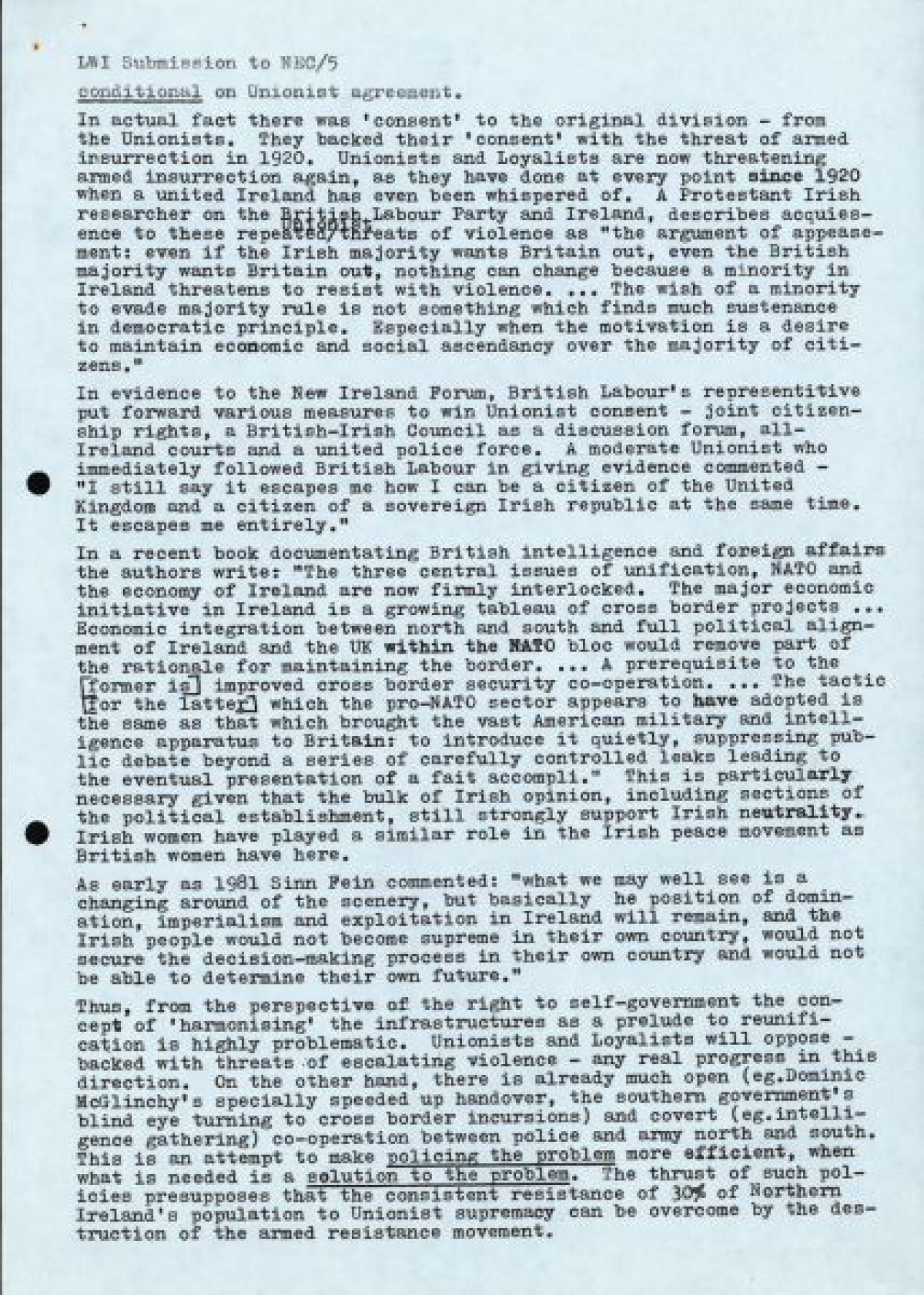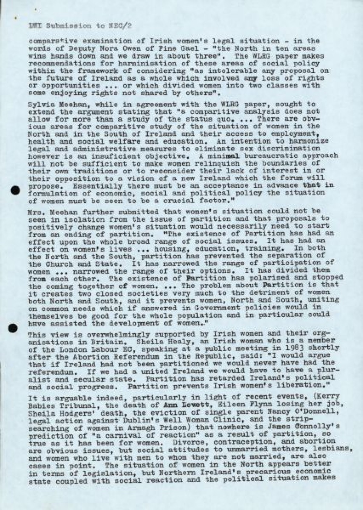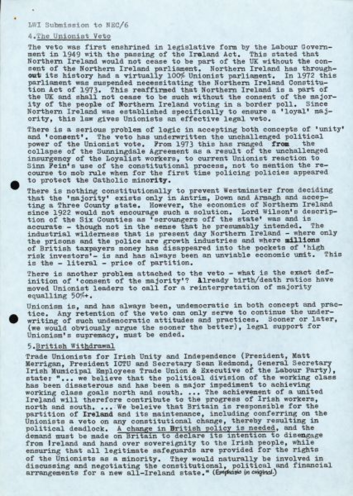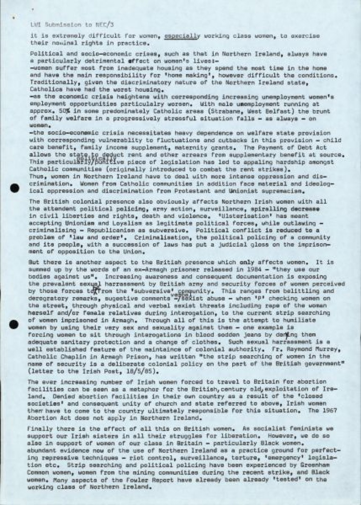 Labour Committee on Ireland, Women's Section. Contains notes from a July meeting, correspondences with groups including South Africa Anti-Apartheid group, Strip-searching in Armagh prisons, Demonstration for British Withdrawal from Ireland, Prevention of Terrorism Act, and a Draft submission regarding British Withdrawal from Ireland, presented to the National Executive Committee Working Party on Ireland.
