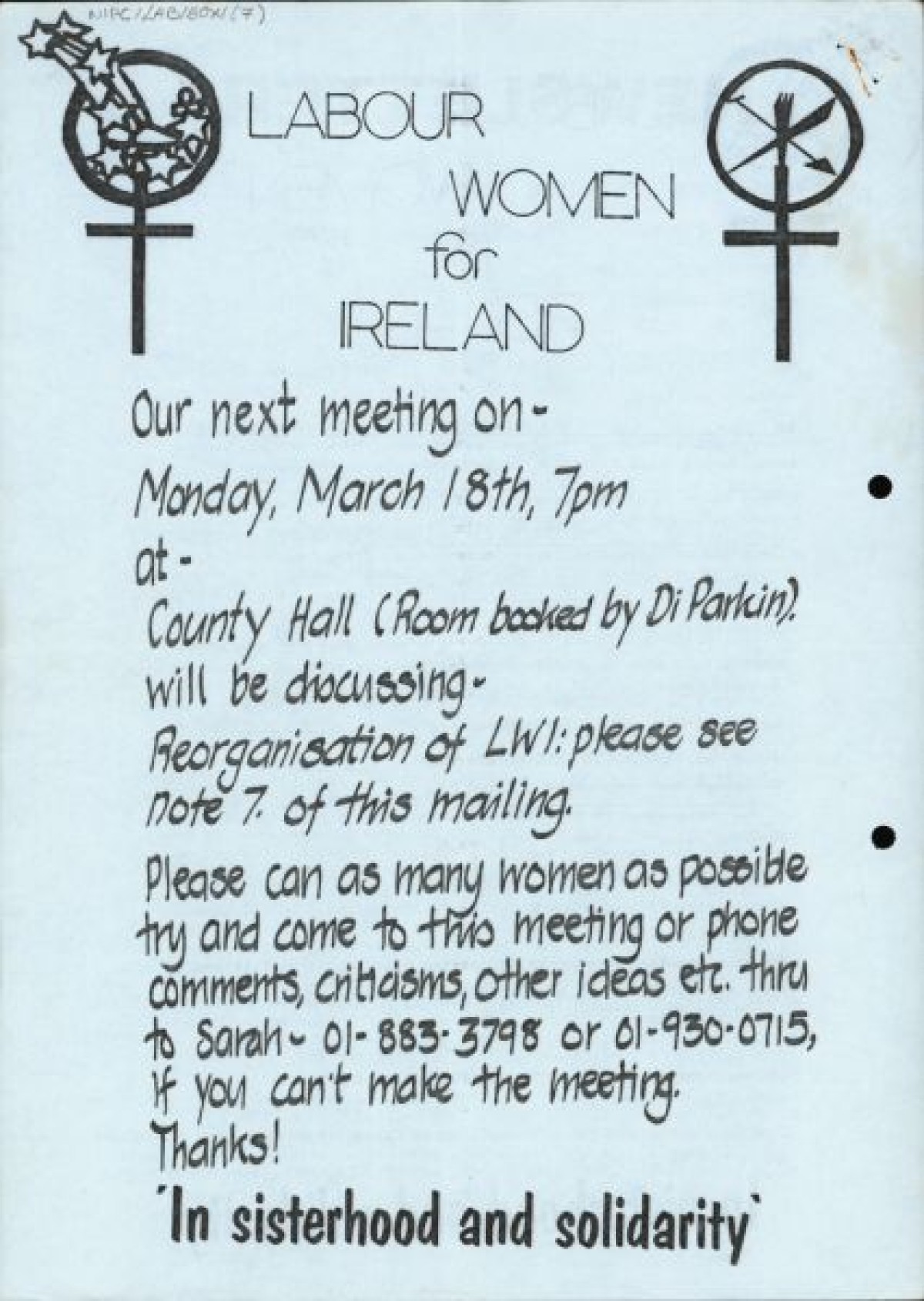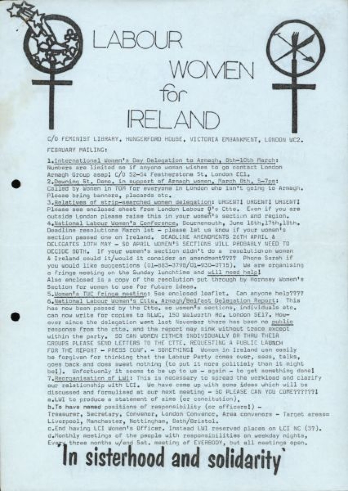 Labour Women for Ireland activities, including International Women's Day delegation to Armagh, demonstration at Downing Street against strip-searching of women prisoners in Armagh, and a National Labour Women's Conference. Also includes a handwritten note about an upcoming meeting, organised by Di Parkin and Sarah Roelofs.