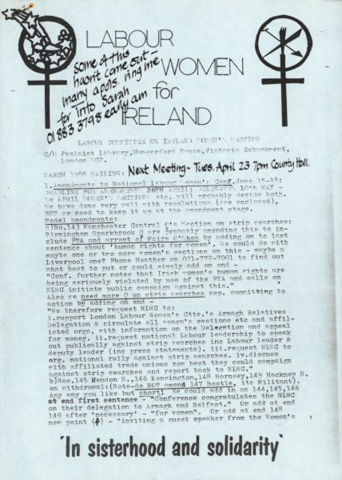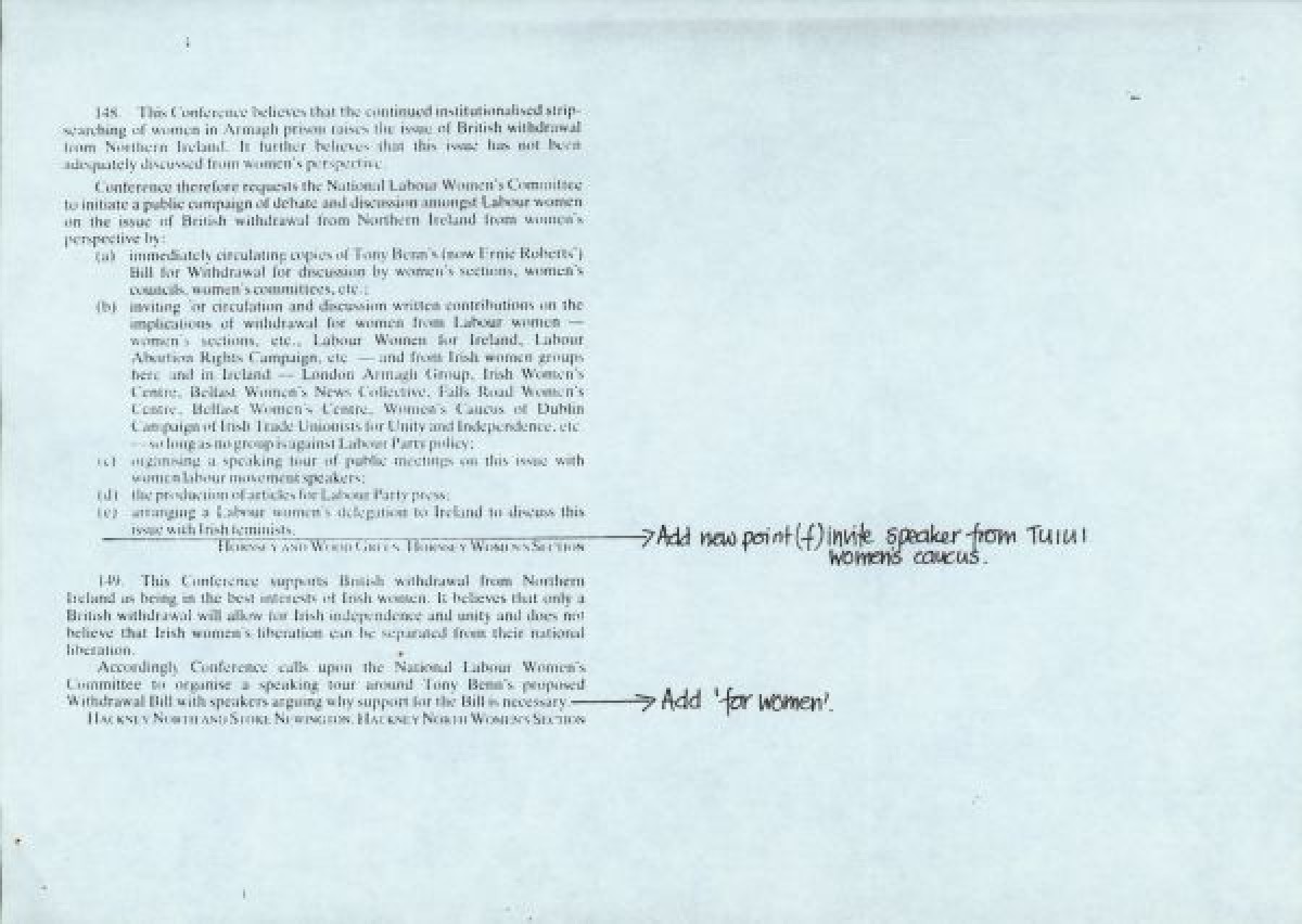 Labour Committee on Ireland, Women's Section. Contains a list of amendments for literature about an upcoming conference on the issue of Strip-Searches in Northern Ireland.