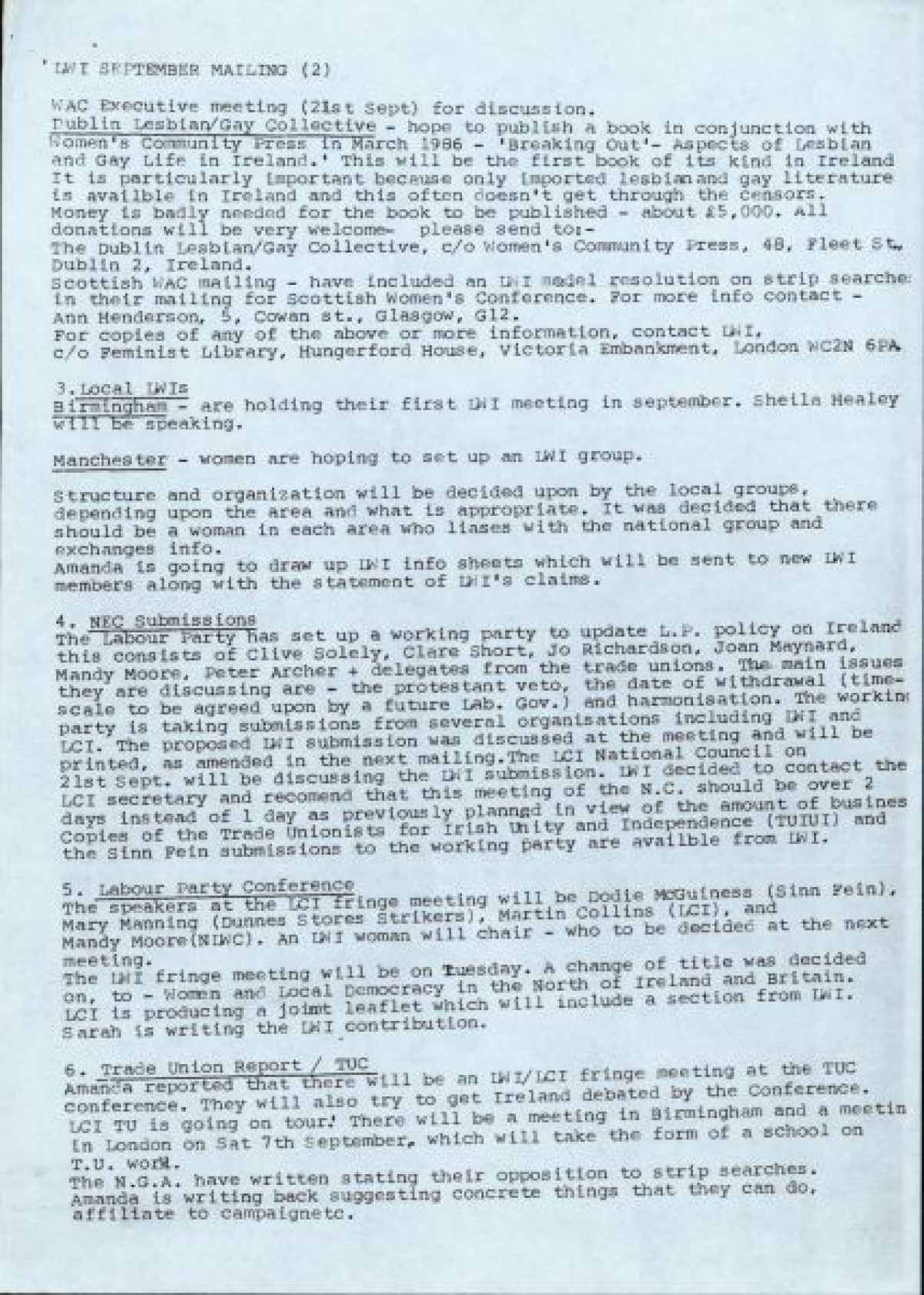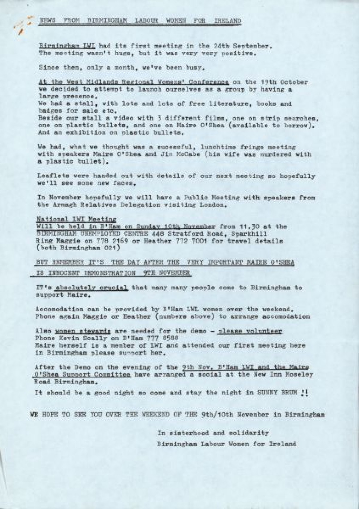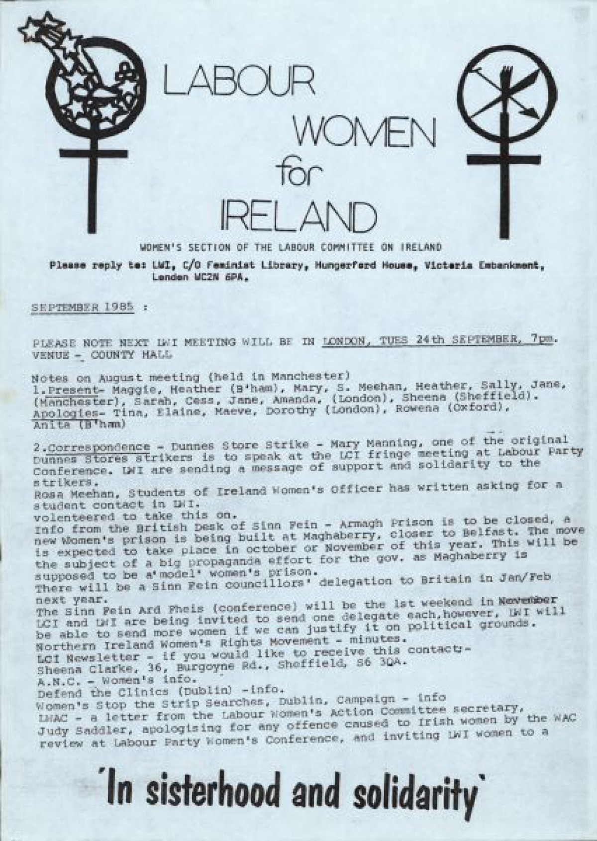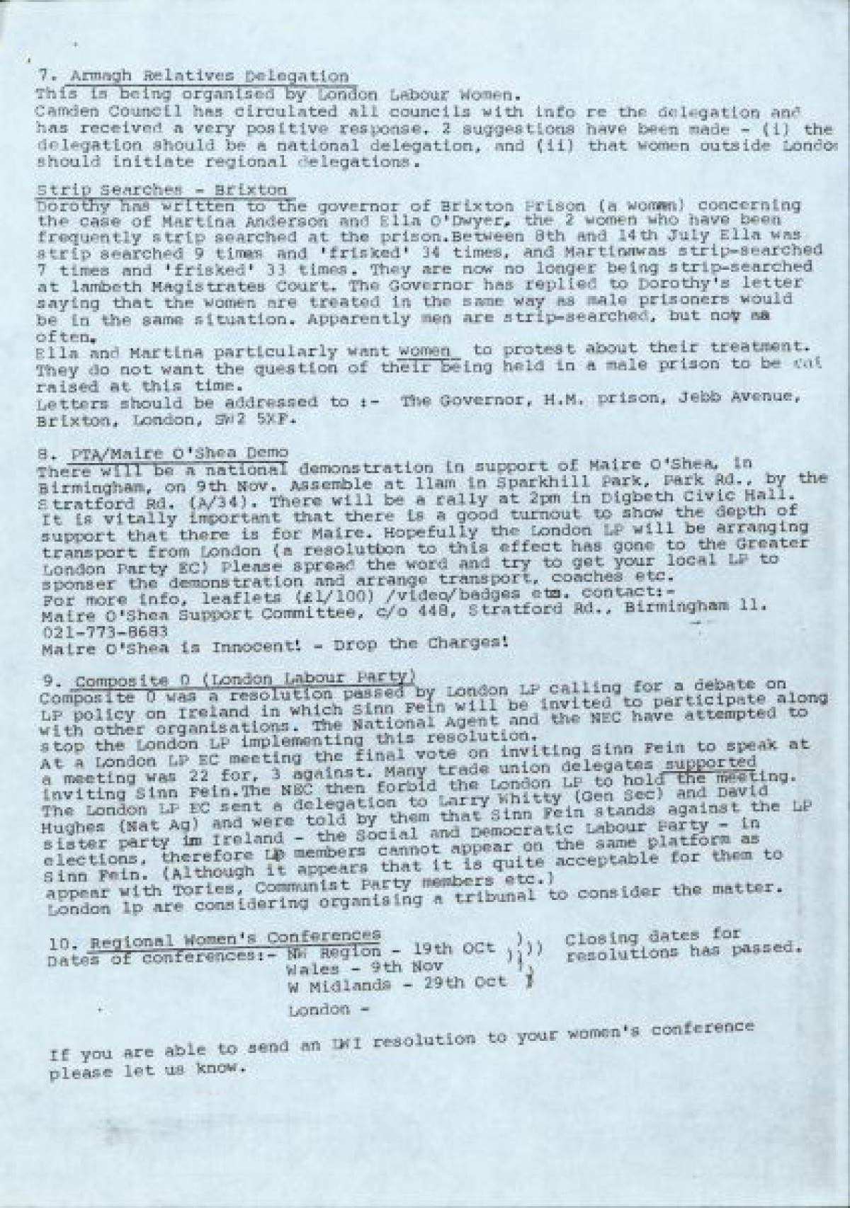 Labour Committee on Ireland, Women's Section. Contains notes from an August meeting held in Manchester, correspondences with groups including Dunnes Stores Strikers, Sinn Féin Ard Fheis conference, Labour Party Conference, Trade Union Report, Armagh Relatives Delegation, Strip-searches in Brixton, Composite 0 resolution, Regional Women's Conferences, and News from Birmingham Labour Women for Ireland. Also contains a poster for a demonstration against the arrest of Máire O'Shea, and a letter from