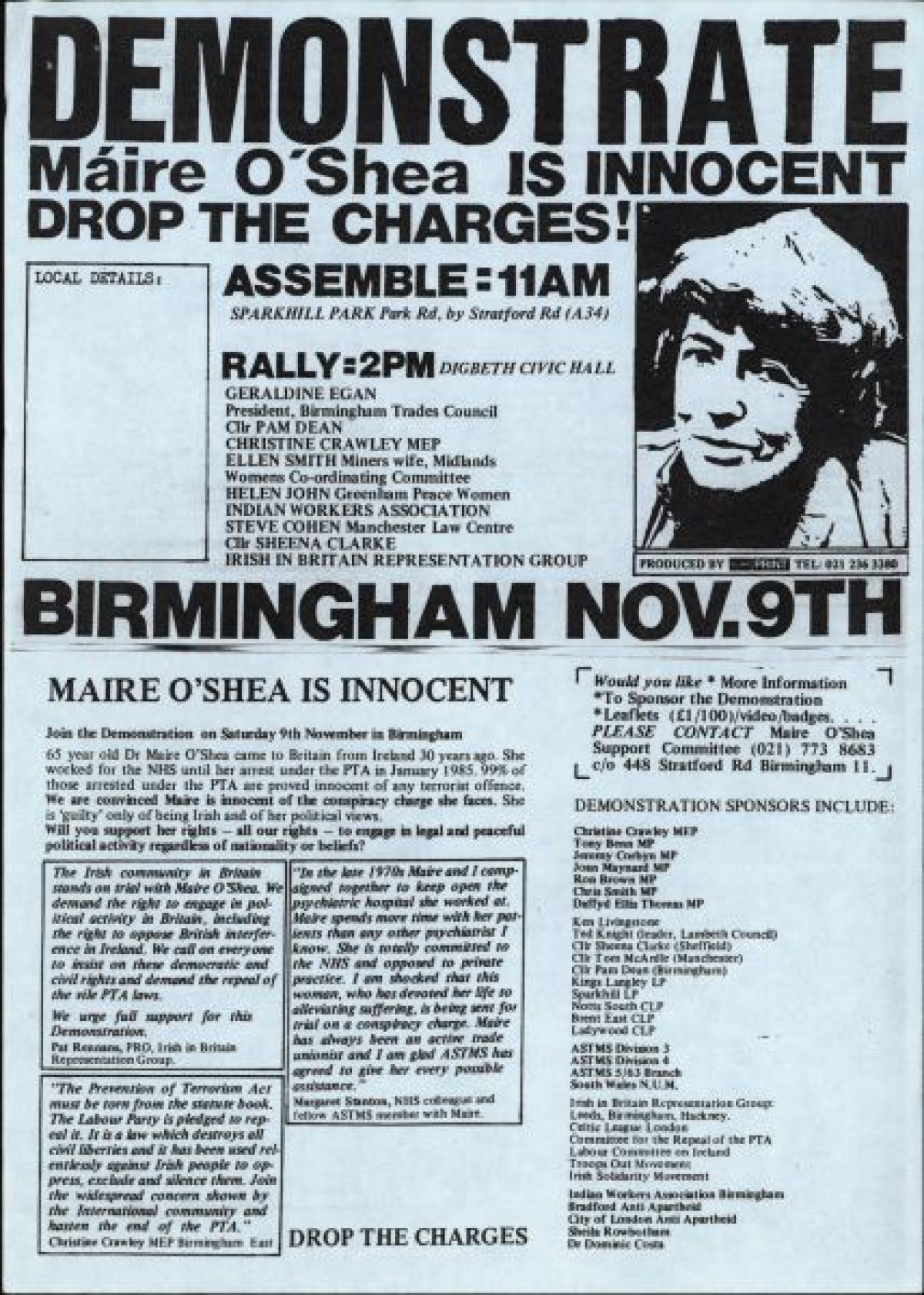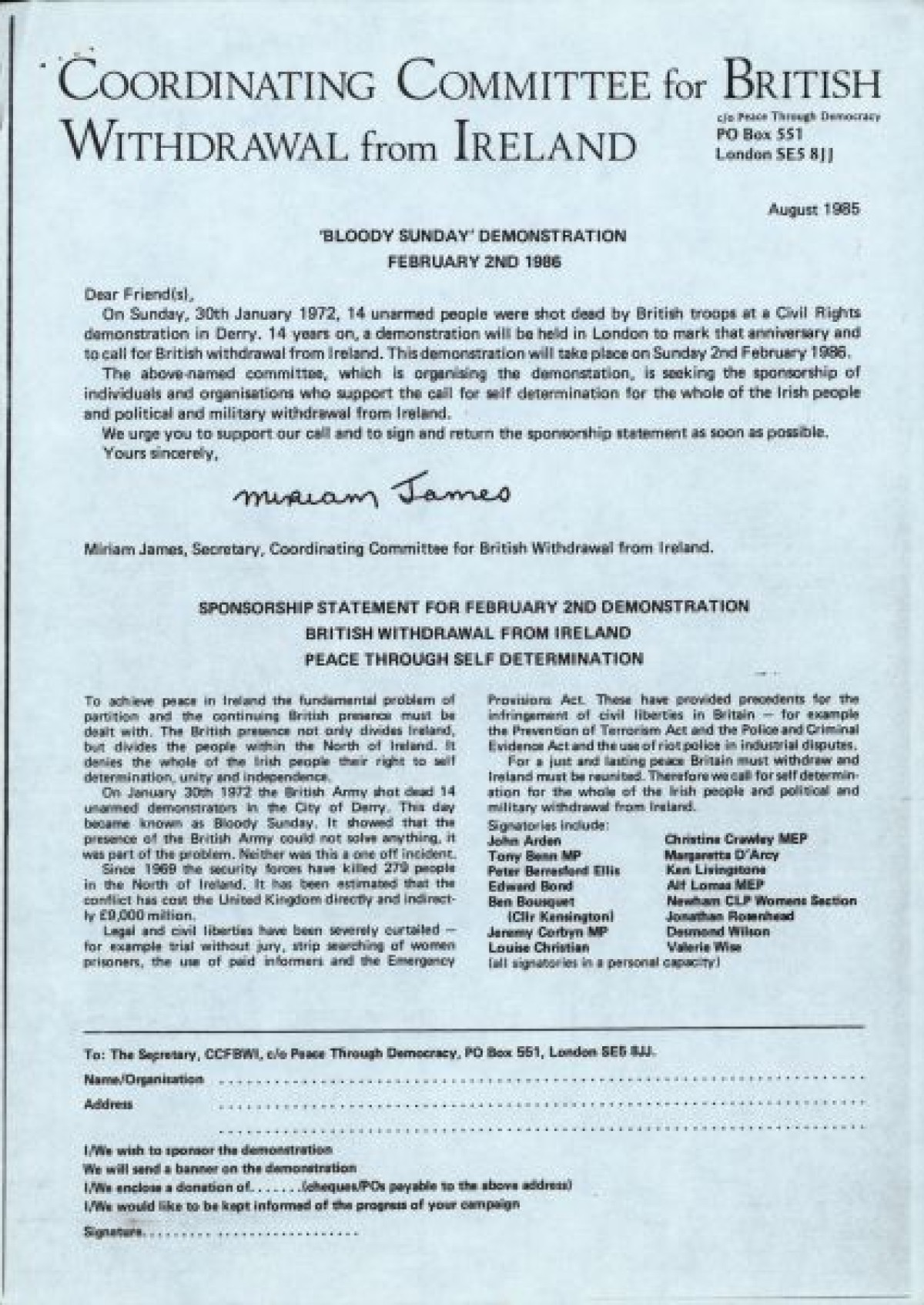 Coordinating Committee for British Withdrawal from Ireland regarding a 'Bloody Sunday' Demonstration on 2nd February 1986.