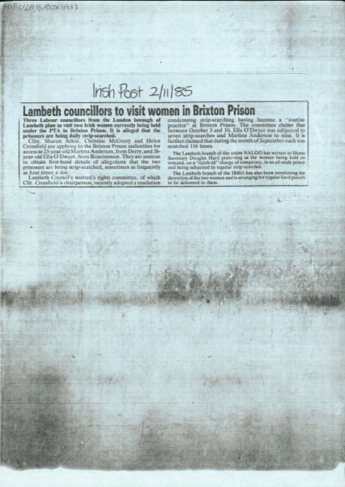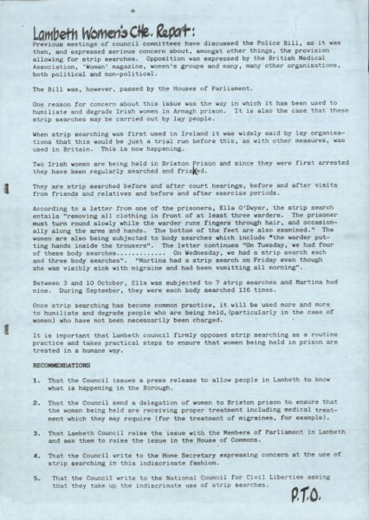 Typewritten document on blue paper, produced by Labour Women for Ireland. Discusses the Police Bill, relating to strip-searching in Ireland. Include a photocopied newspaper clipping from the Irish Post, 2nd November 1985, titled 'Lambeth councillors to visit women in Brixton Prison.'