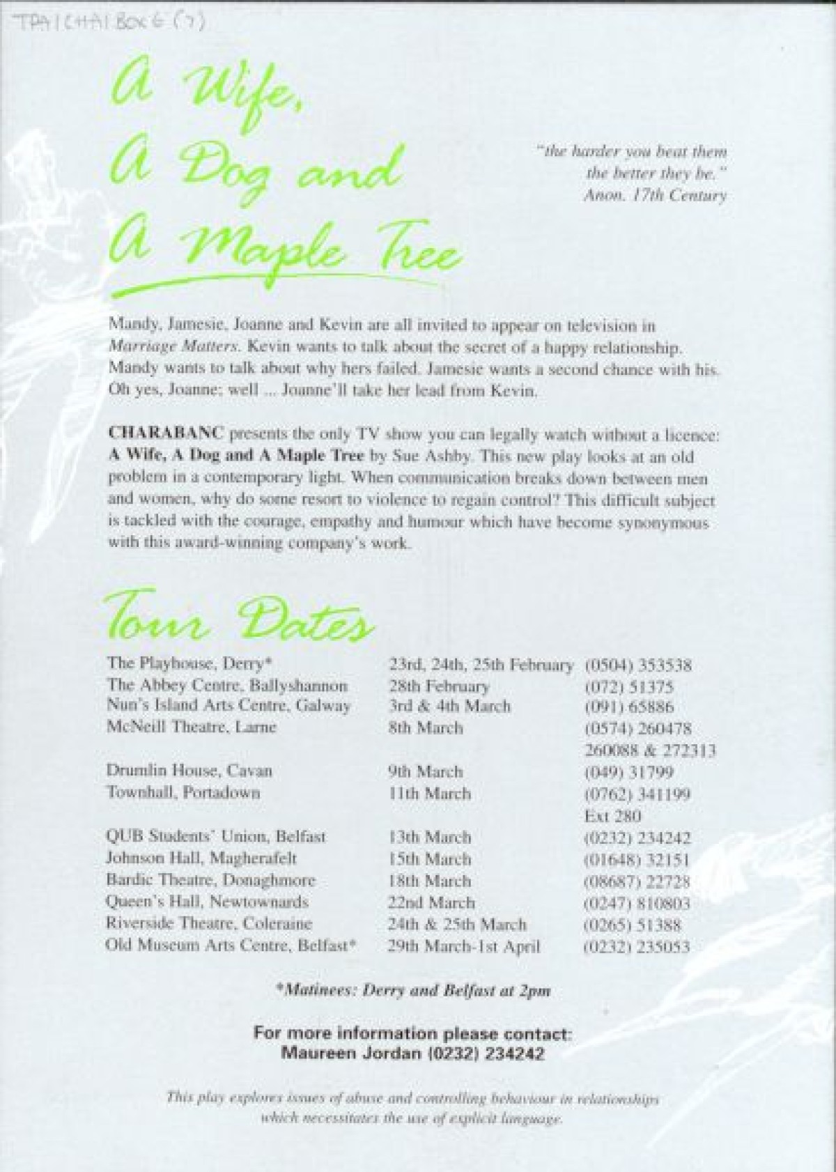Charabanc Theatre Company. Includes a synopsis of the play and touring schedule.