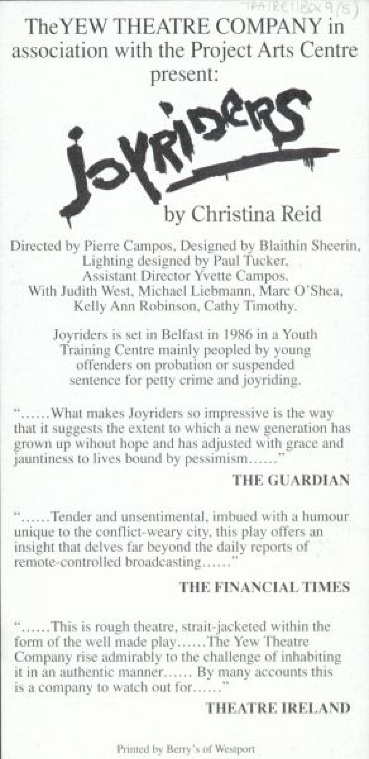 Leaflet for 'Joyriders' at Project Arts Centre with YEW Theatre Company