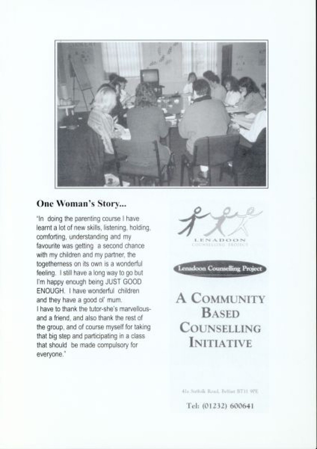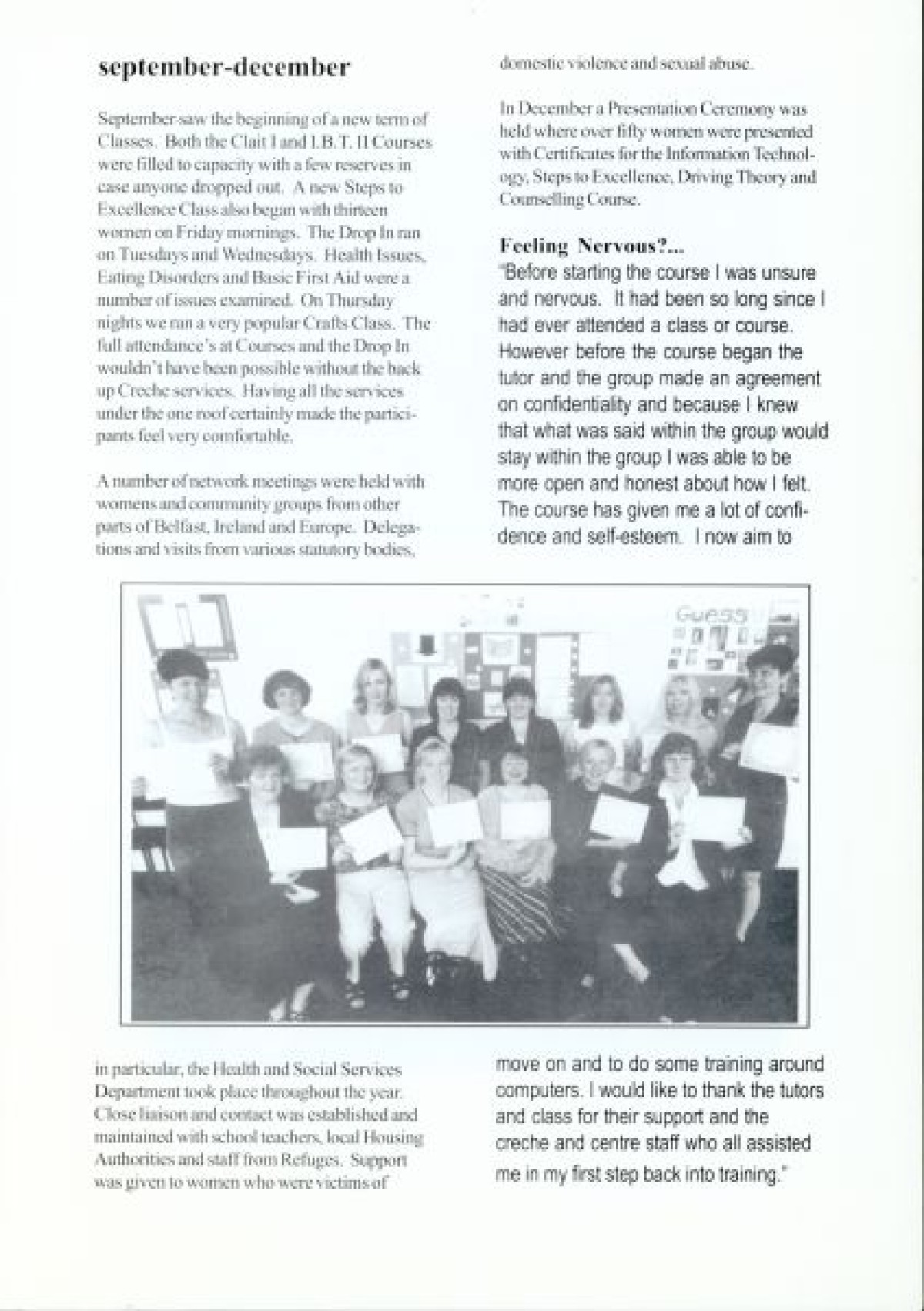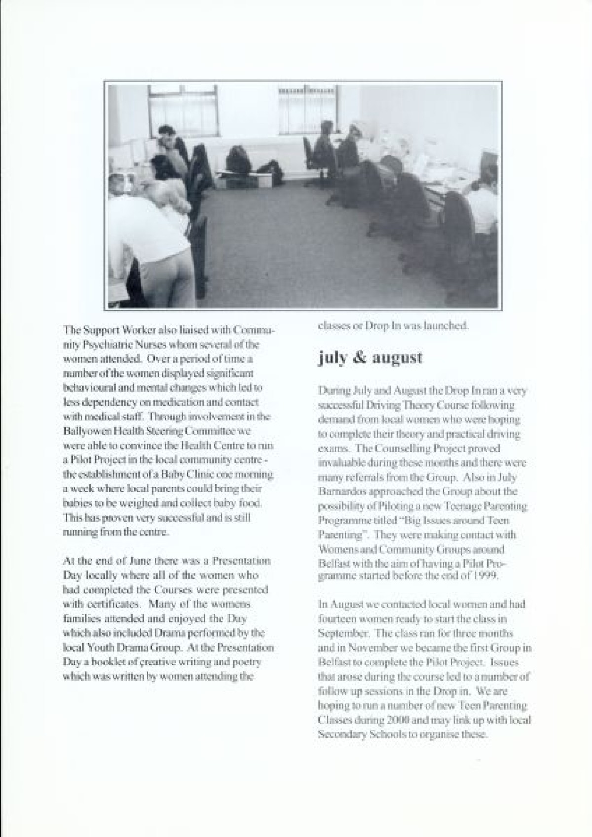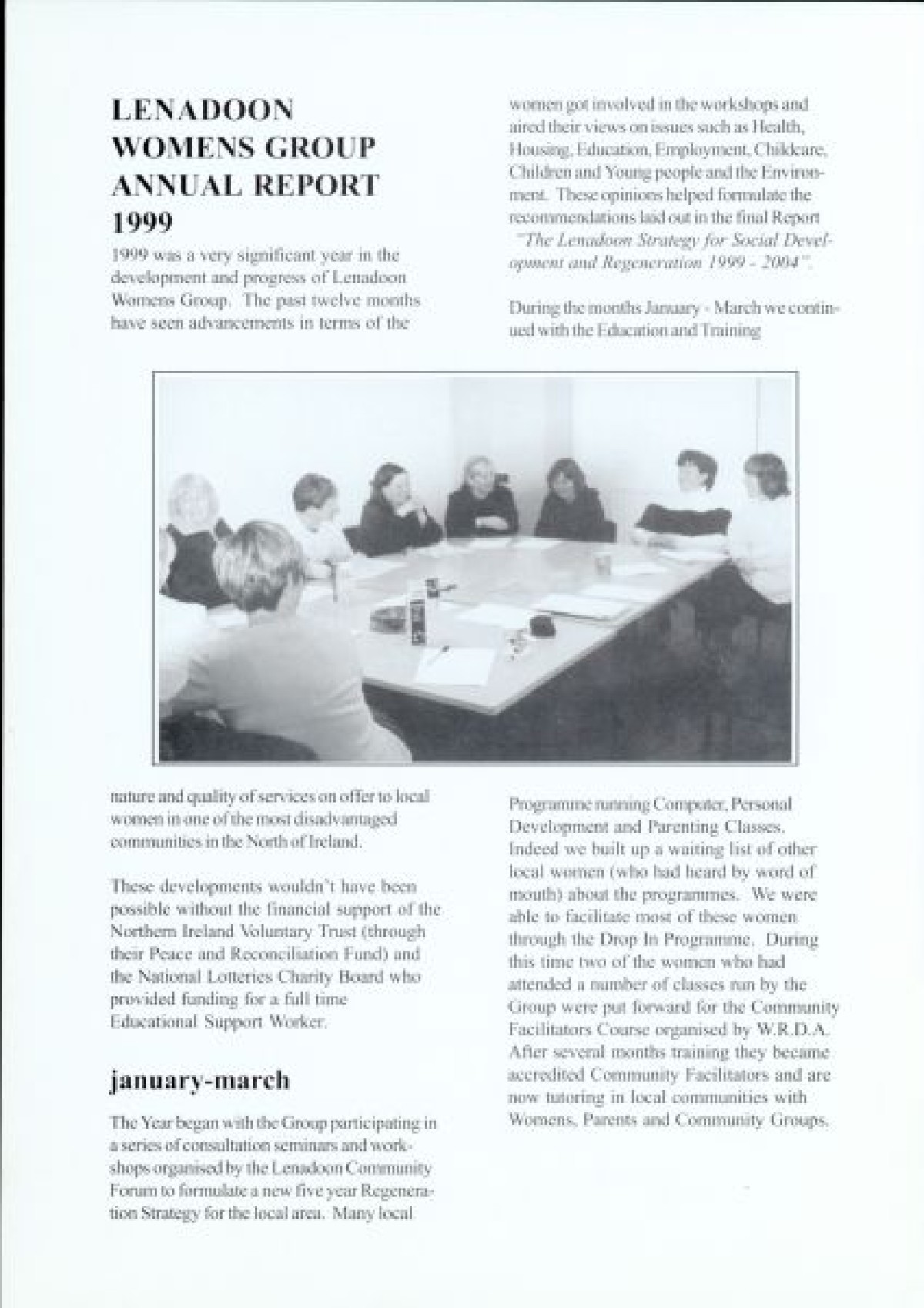 Lenadoon Women's Group, 1999. Discusses seminars, development programmes, and counselling projects from January - December. Includes black and white photographs of participants from the women's group.