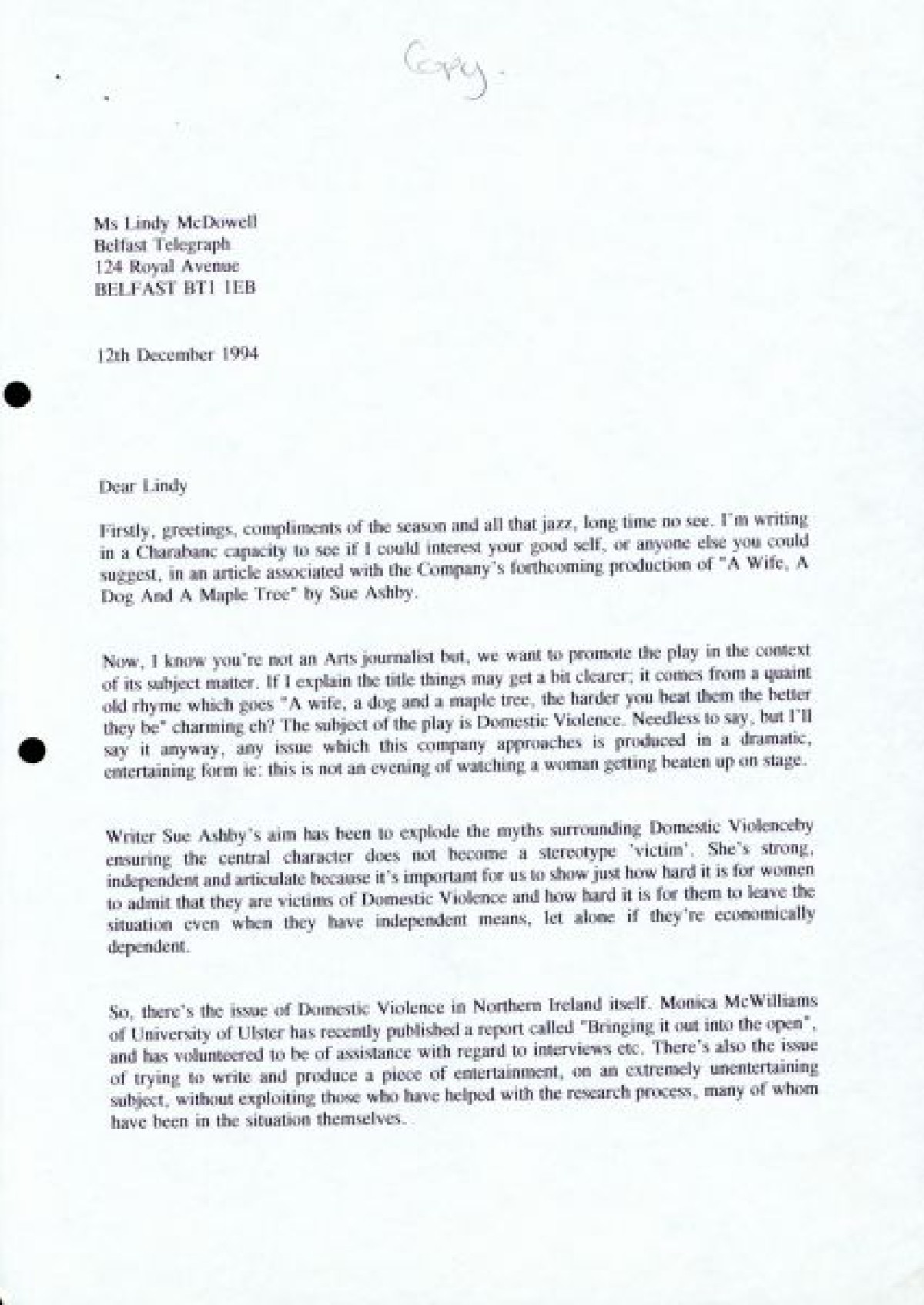 Belfast Telegraph proposing a publicity piece on Charabanc's play 'A Wife, A Dog And A Maple Tree' which centred on themes of domestic violence.