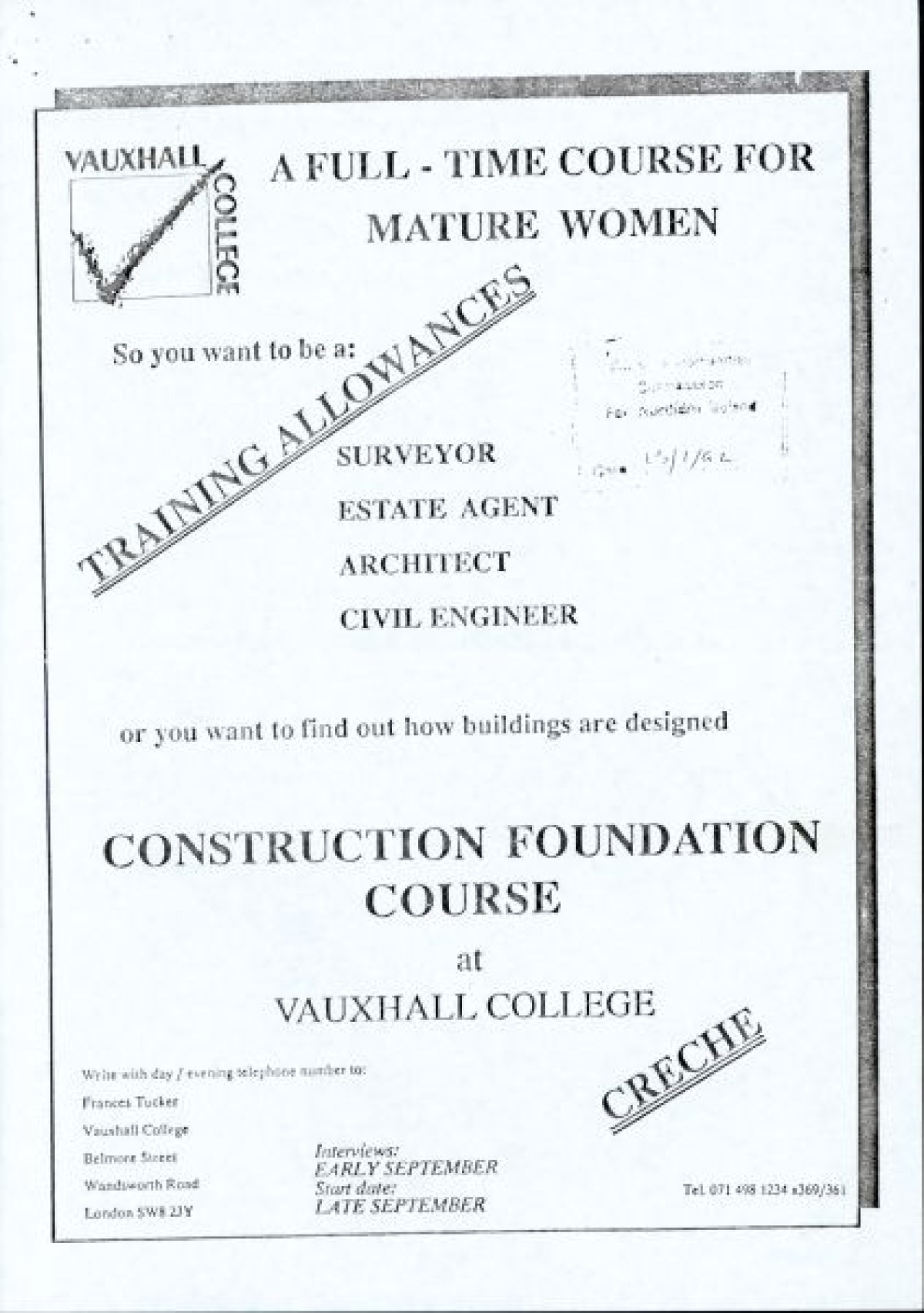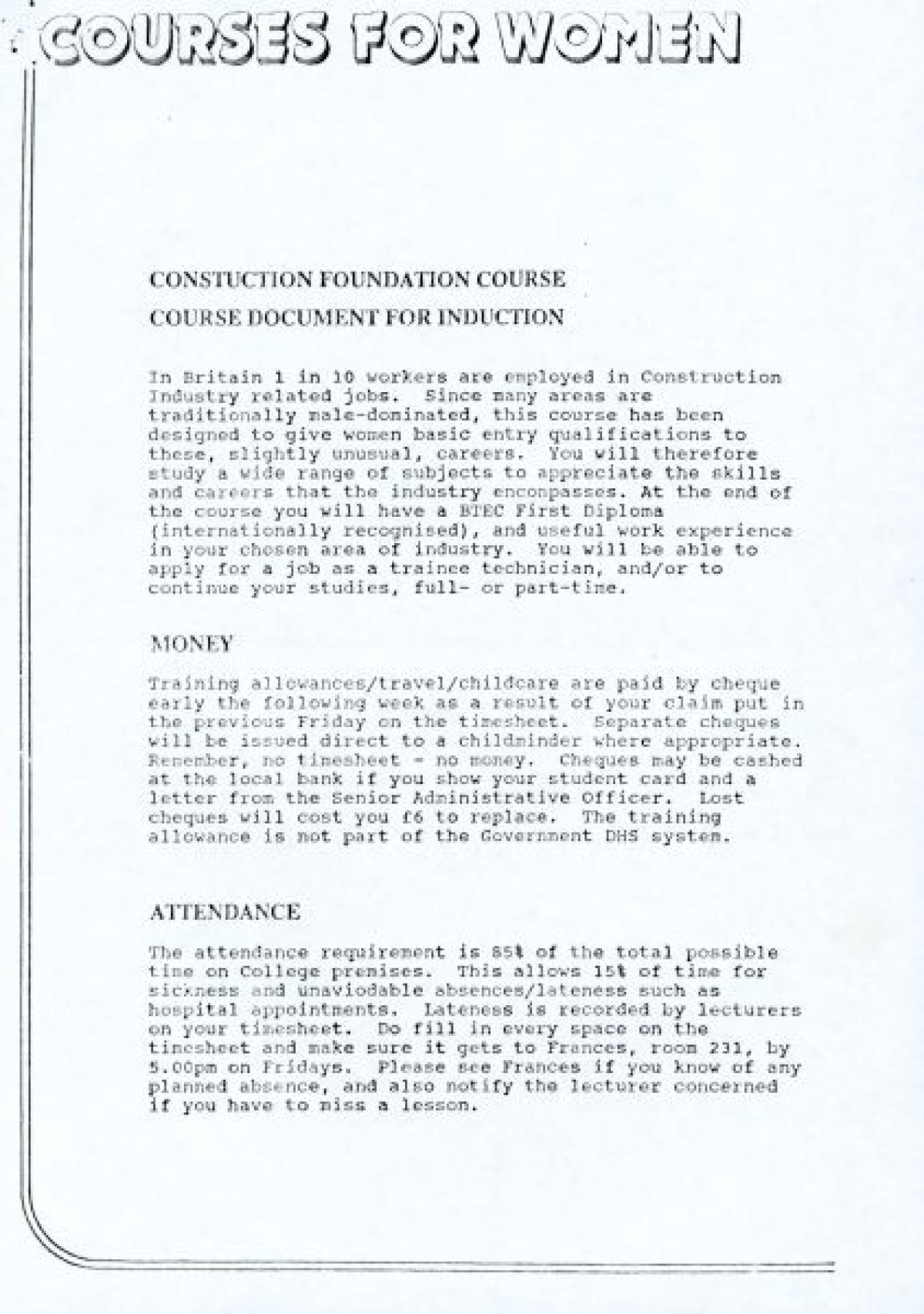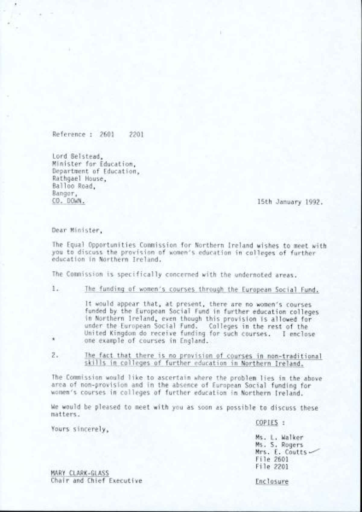 Belfast Institute of Further and Higher Education, 5th February 1992, enclosing a further letter to Lord Belstead of 15th January 1992, regarding provision of women's education in colleges of further education, which itself includes poster and course document for induction of a women's course in construction.