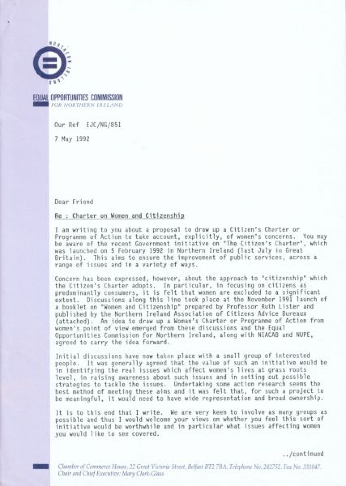 Charabanc Theatre Company, regarding a proposed Citizen's Charter on 'Women and Citizenship'. The letter requests input and involvement from 'as many groups as possible' to speak on the issues affecting women.